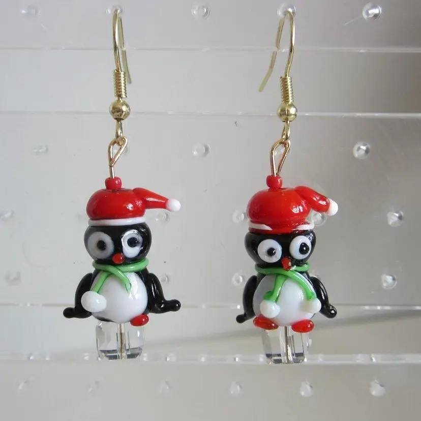 Handmade Lampwork glass Christmas Penguins sitting on ice cube drop earrings. Earrings drop 2". Each snowman is slightly different looking as they are handmade.