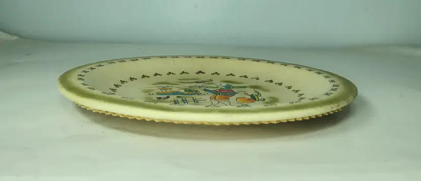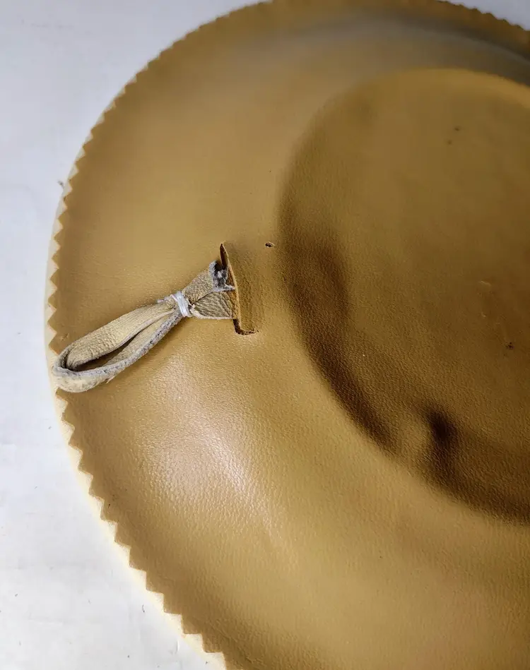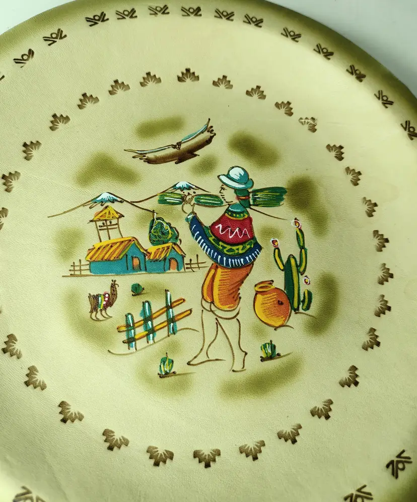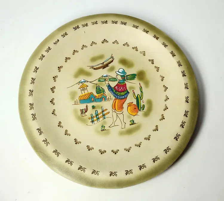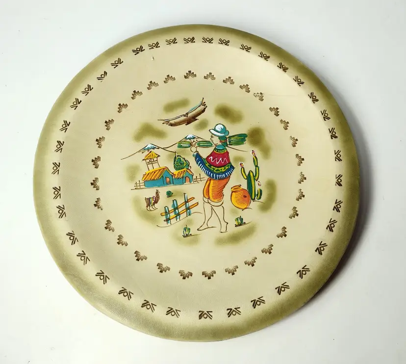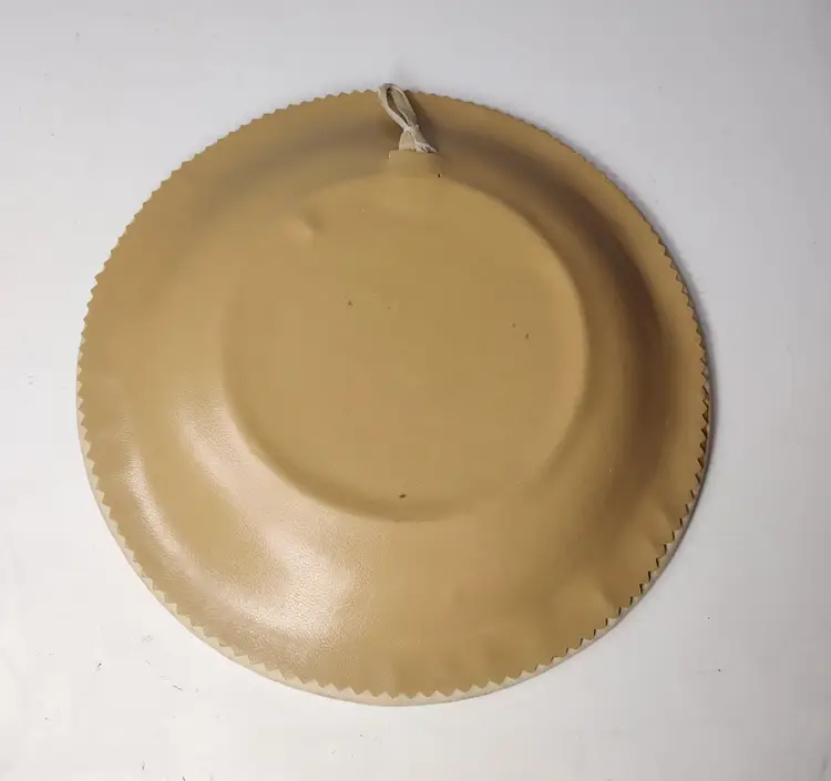 Item is pre-owned and in very good condition with no major flaws. Smoke free environment. This is a very nice handmade leather plate with great details and has a hanger for hanging if needed. Plate measures 8" x .75" depth.