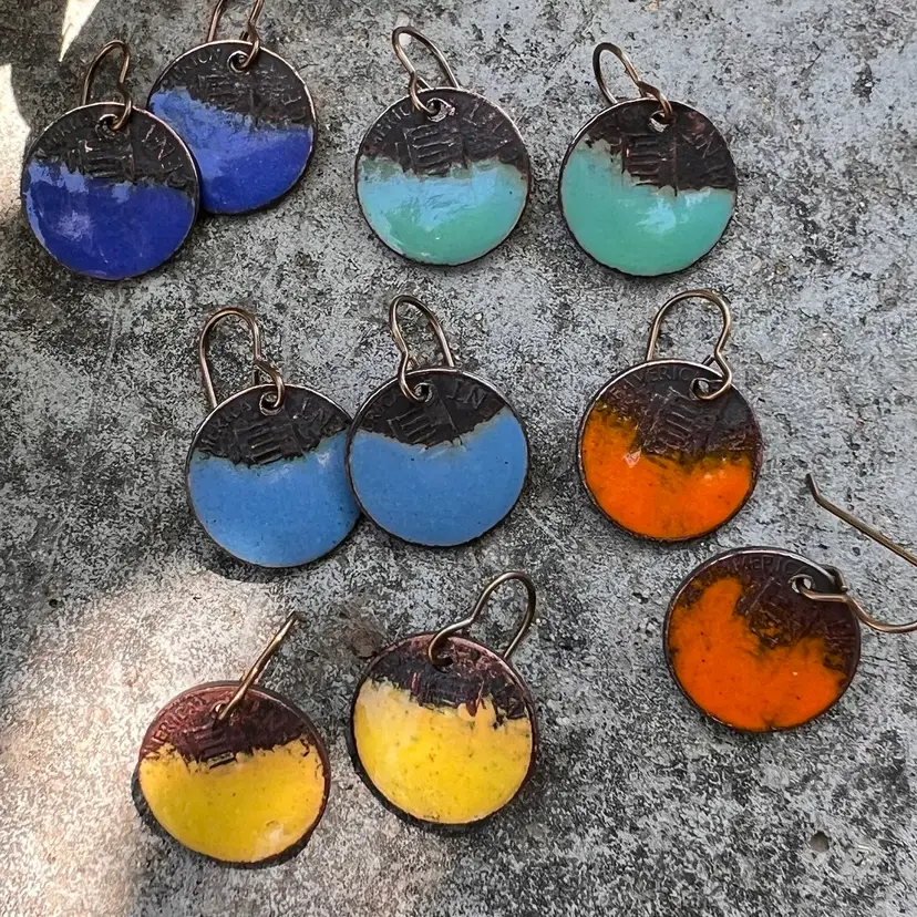 These are made from actual Pennies. They were hand drilled and enameled by me. The process requires heating and torch enameling. The results are one of a kind and no two will be the same. The back shows the head and date which varies with each piece. If you need a pair in a certain color please send me a chat and I’ll do my best to accommodate your request. Thank you so much for looking and if you like them but can’t make a purchase at this time please give them a “like” anyway! 😘