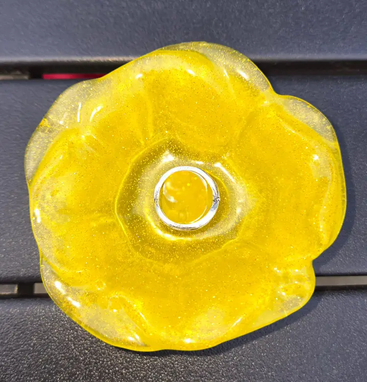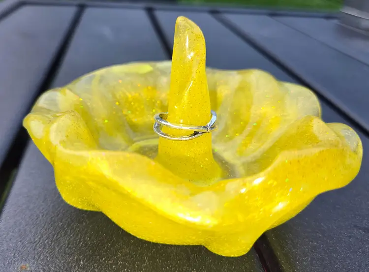 Handmade yellow resin ring holder shaped like a lotus flower with a glittery finish. Perfect for keeping your rings organized and adding a pop of color to your space. 3.5" Wide, 2" Tall.