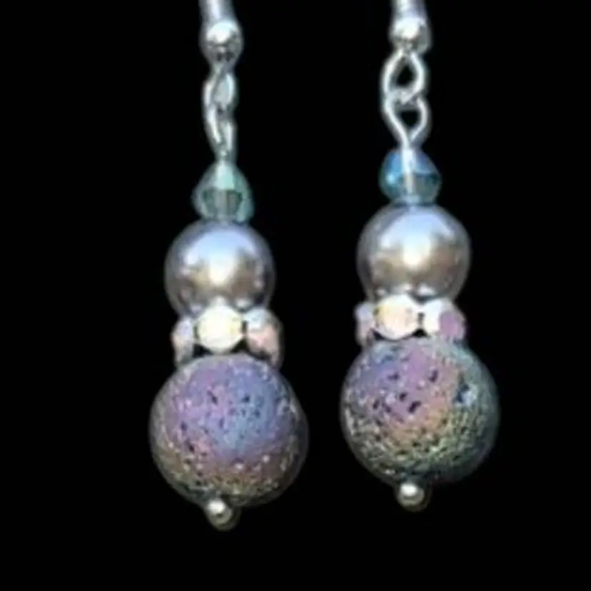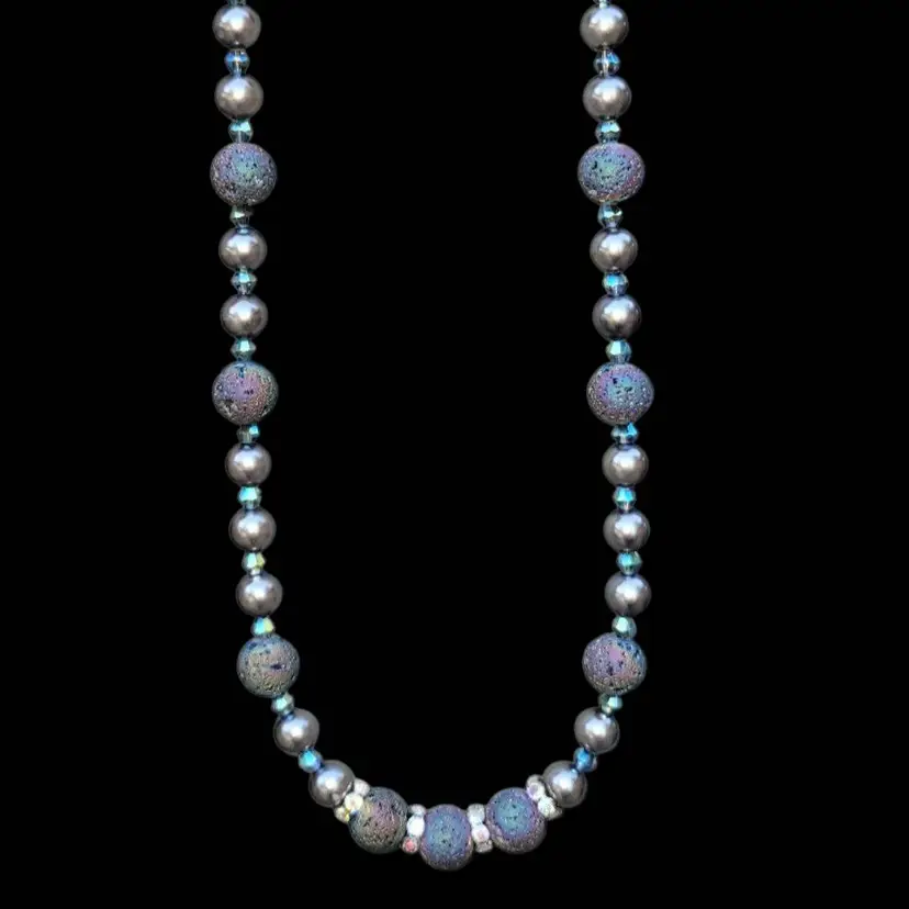 Electroplated Lava Stone, Crystal bicones with shimmery pearls. Approx 21" long with 1 1/2" earrings.