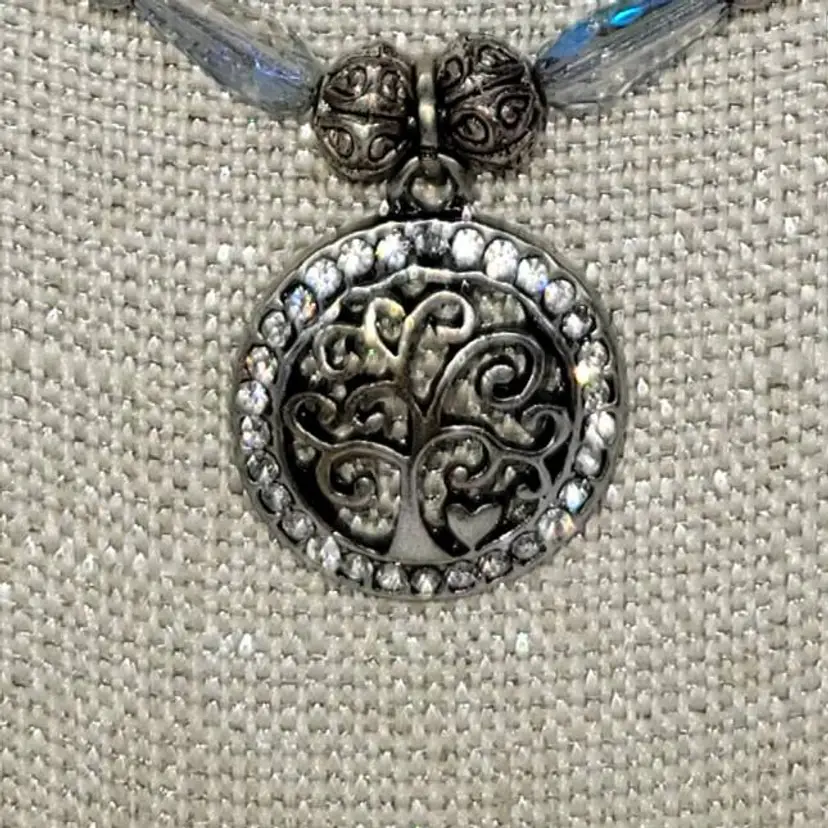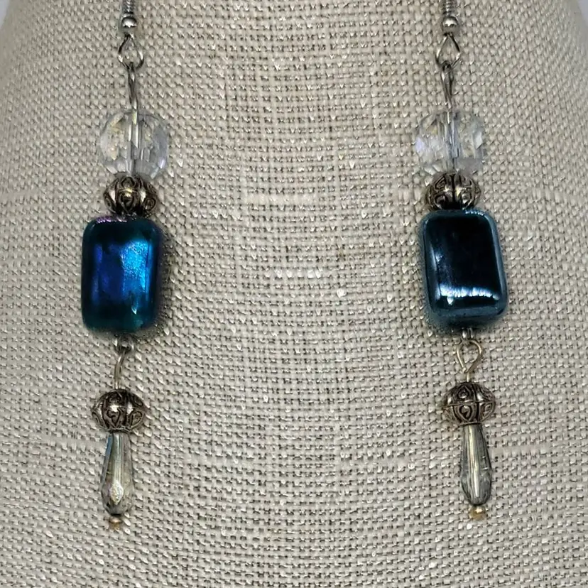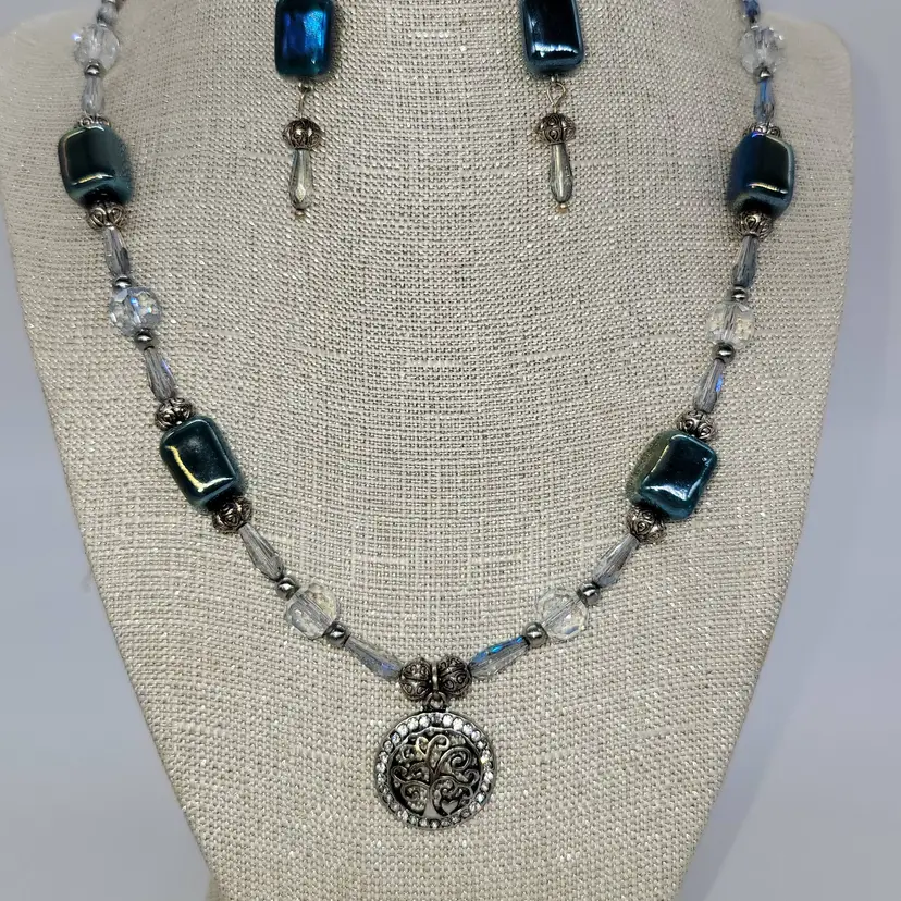 Shiny blue porcelain beads with round and tinted briolette crystals. 20" + 2" extender and a 3/4" charm, earrings are 2 1/4" long.