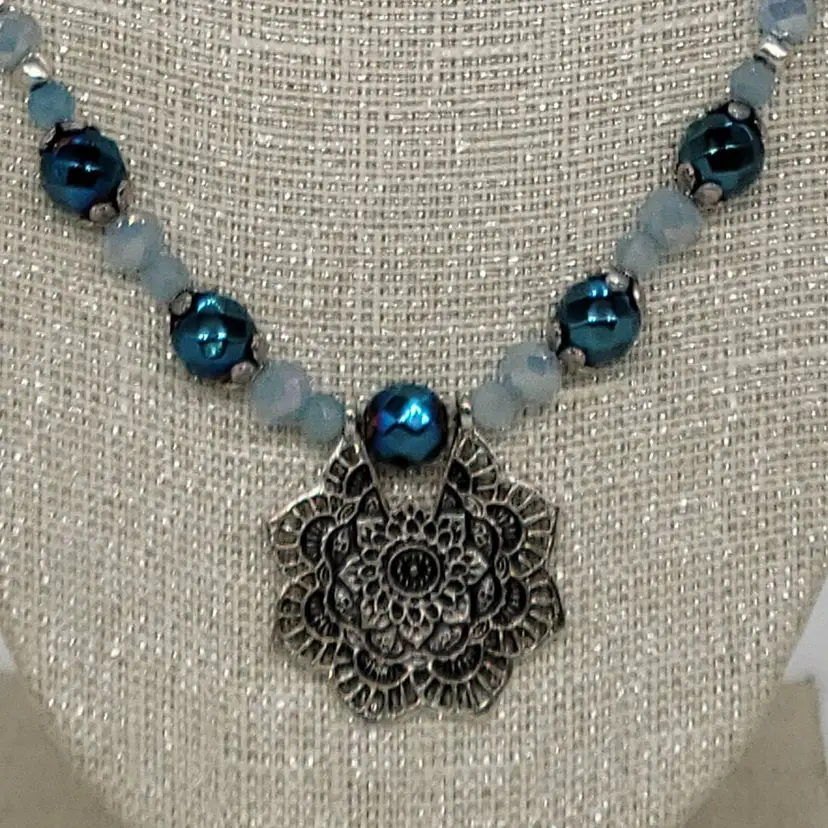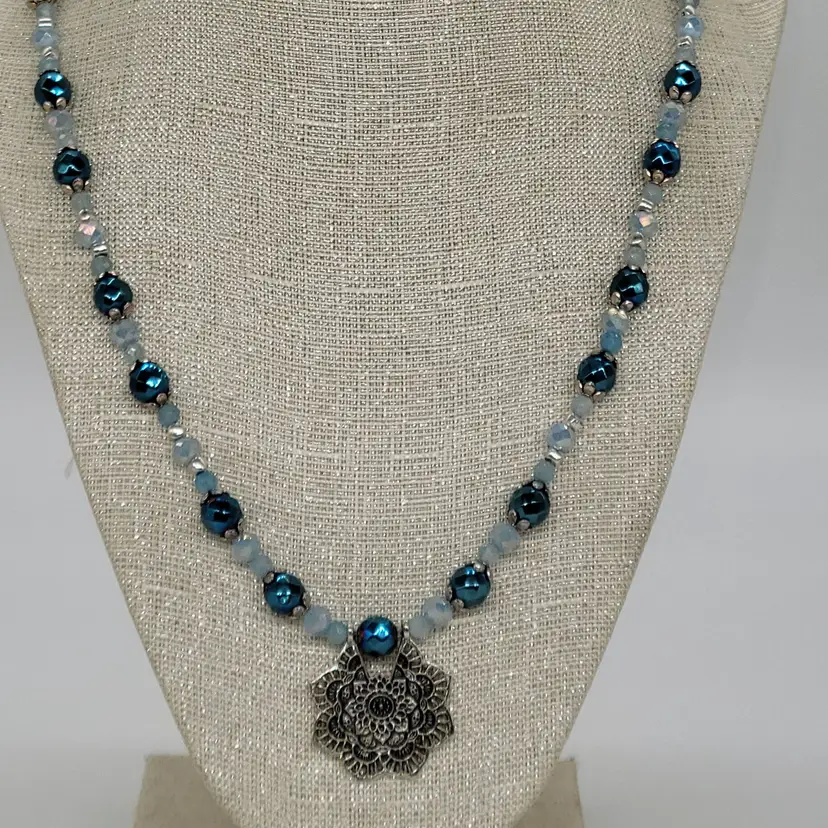 Floral pendant with metallic hematite blue beads and crystal faceted rondelle beads in powder blue. 21 1/2" long, charm is 1", bracelet is 8" an earring are 1" drop.