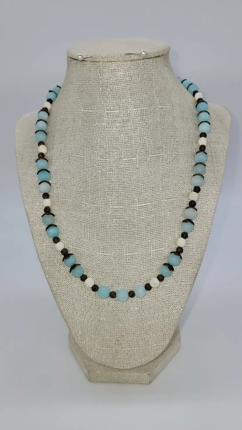 Frosted blue beads, white lava beads, and brass spacers. 20 1/2" long.