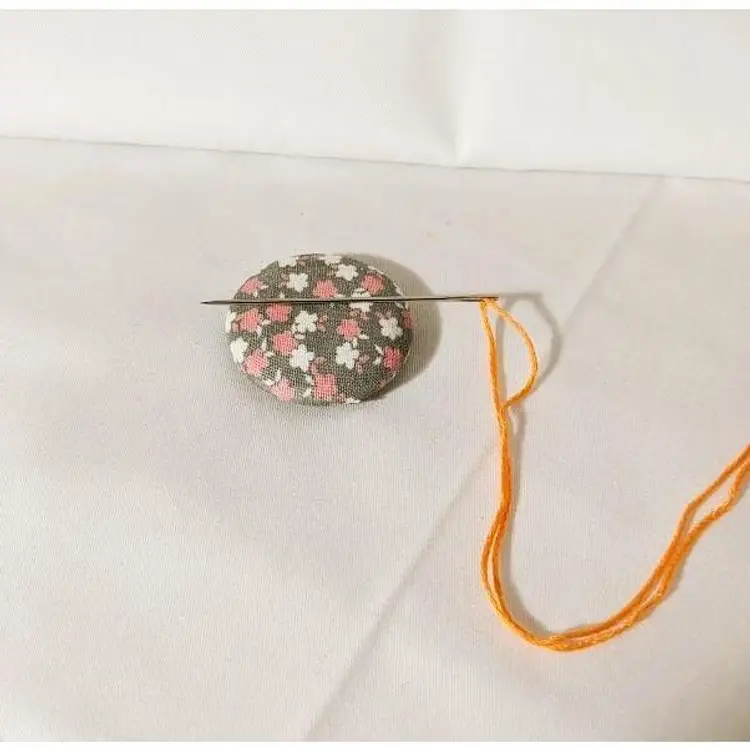The needle minder is made from a covered button with coordinating fabric. It has 2 small magnets to secure the minder to your work. Just place the covered button on top of your work and the second magnet underneath to secure it. Your needle will sit securely to the minder and you never have to worry about losing it again.
