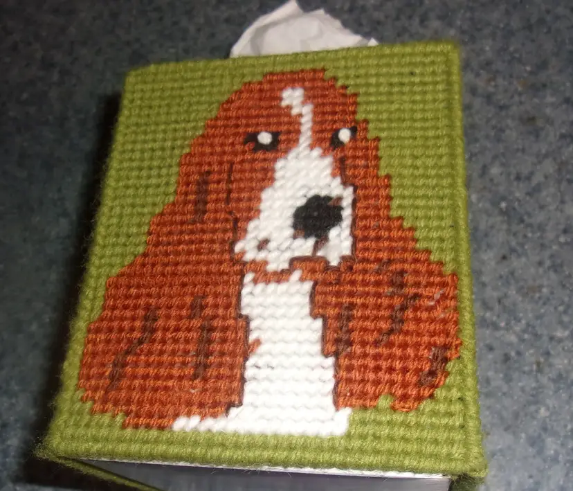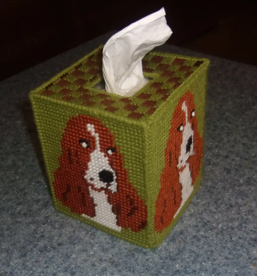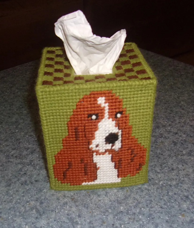 Handmade Needlepoint Red and White Parti Cocker Spaniel Tissue Box Cover. The item is needlepoint using yarn on plastic canvas. Cover fits a standard sized square boutique tissue box. Tissues not included. Every Cocker Spaniel owner should have one of these tissue box covers. Perfect for gift giving!