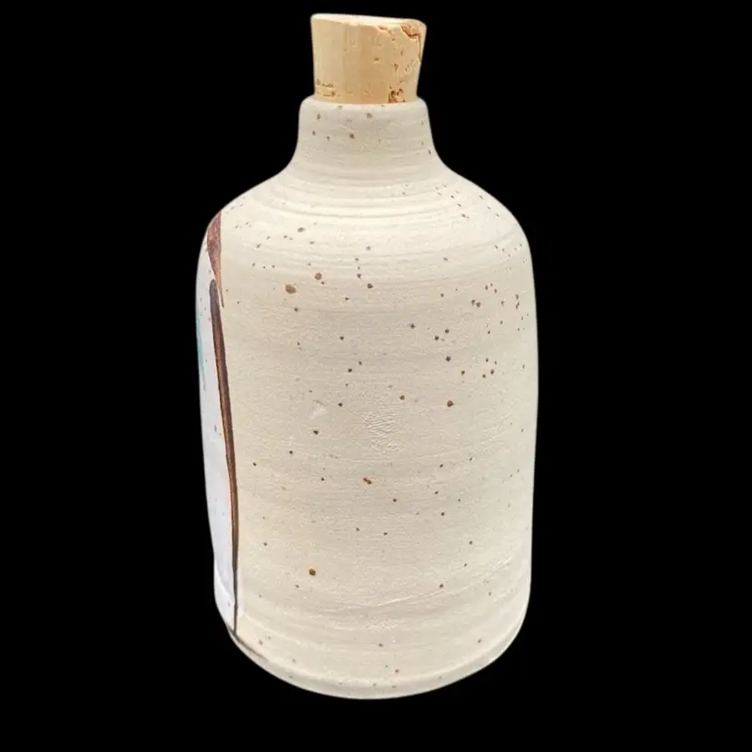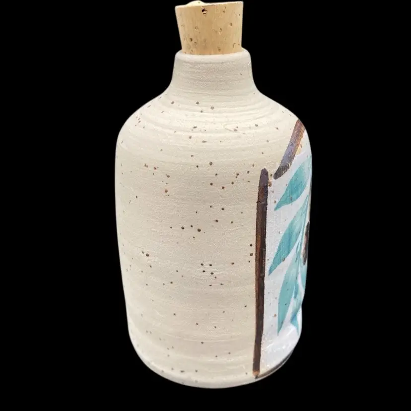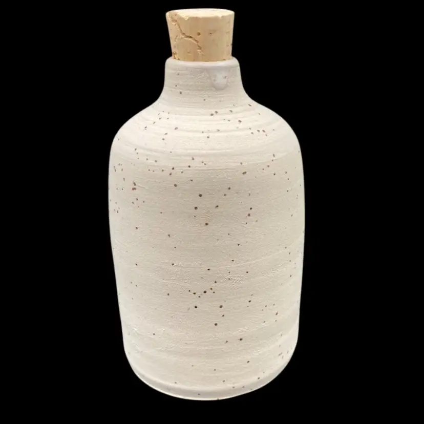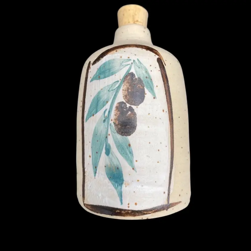 This unique olive oil bottle is a beautiful addition to any kitchen or dining room. Handmade by Batya Erdstein, a renowned artist in Israel, this bottle features a charming olive branch pattern and is signed by the artist. The bottle is made of high-fired ceramic and has a porous finish. It comes with a cork stopper for easy use.
