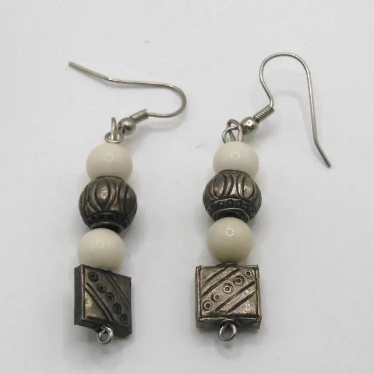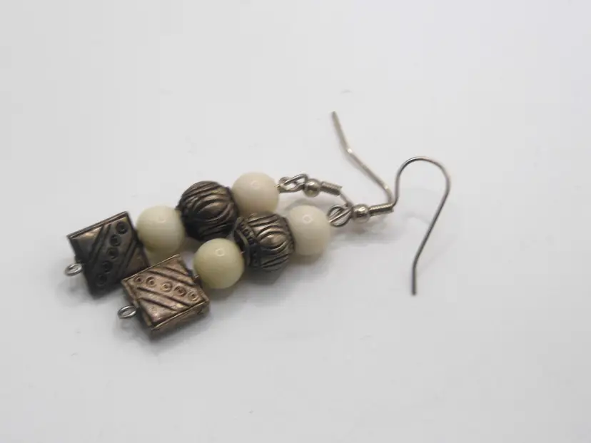 These are handmade pierced earrings by me, using vintage milk glass beads, other glass beads, both vintage and newer, as well as metal, stone and/or malachite beads, and a mix of jewelry findings from metal spacers, and gold or silver toned 'fishhooks' or gold or silver toned clip on fasteners. I never make any 2 pair alike, so each pair of earrings are One Of A Kinds! I use hypoallergenic jewelry findings. The pair in this listing, is the pair you are getting. This pair hangs at: 2.3" long. Please see all pics, as they are part of the description.