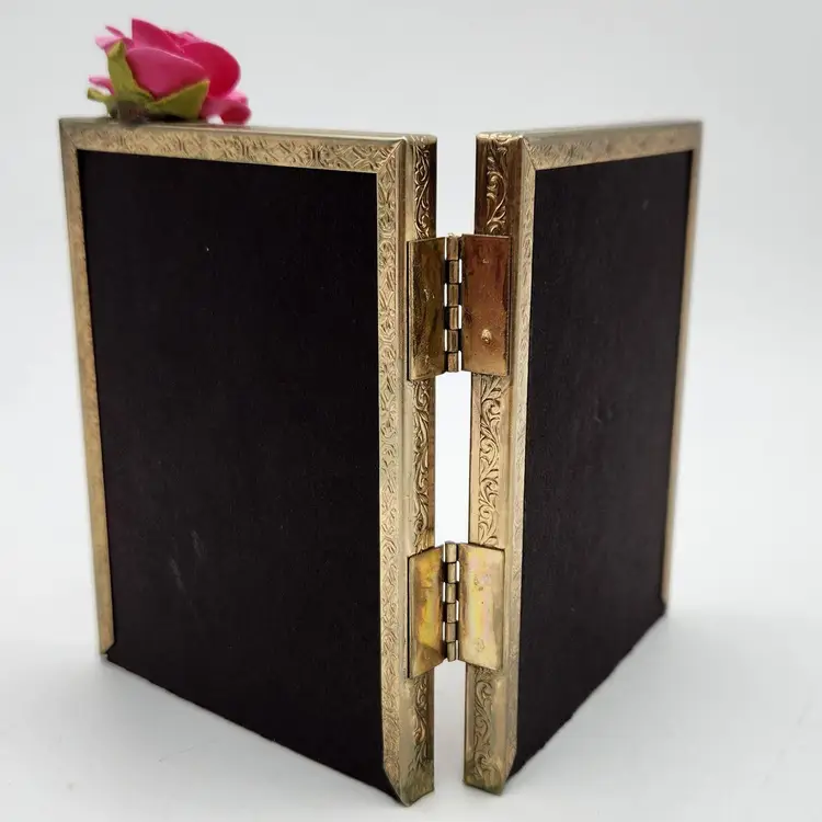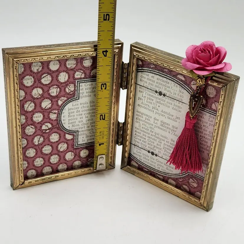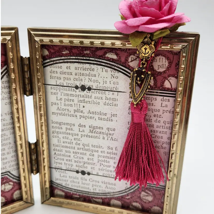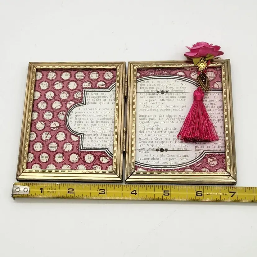 PINK double frame with vintage jeweled dangle, glitter, paper rose & a tassel just for FUN! 7" x 4" when fully open. Handmade by ME! So elegant on your dresser or shelf!
