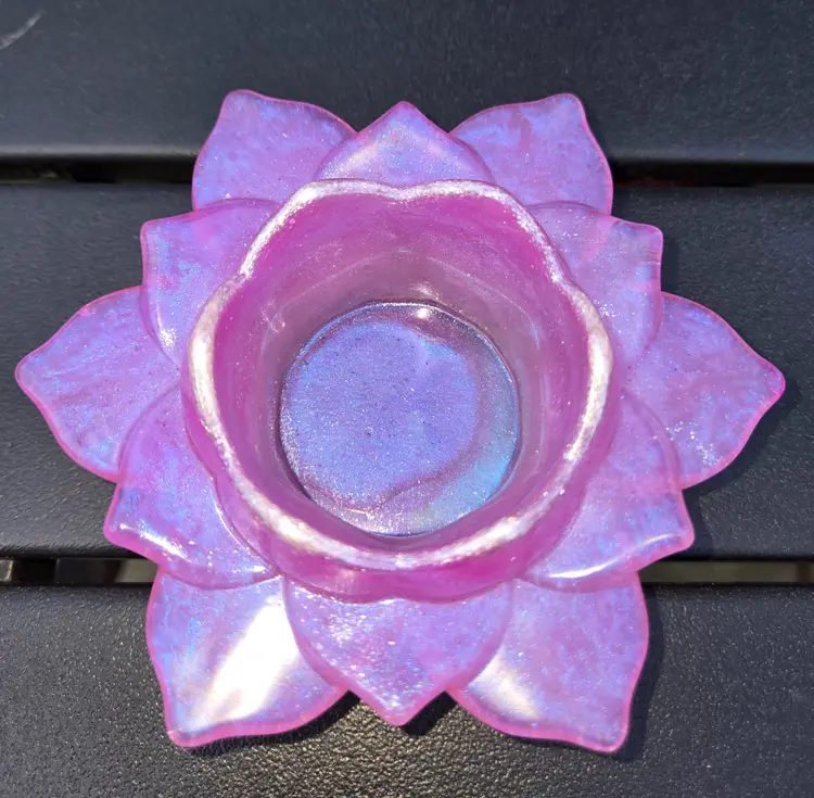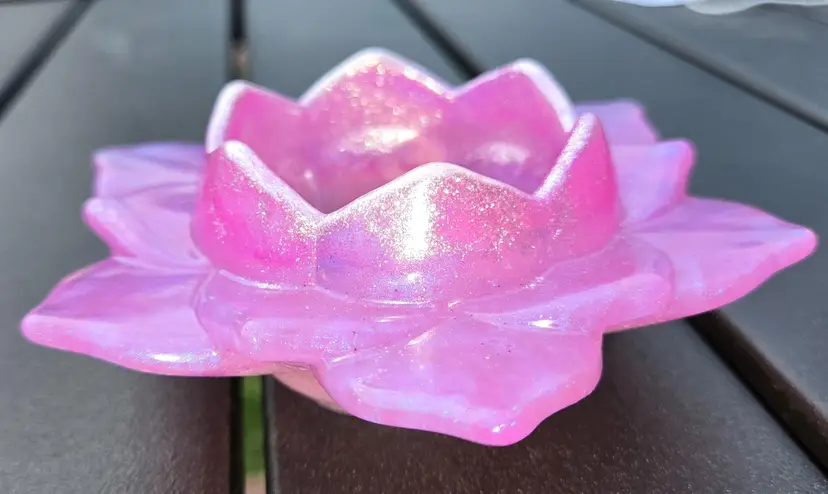 Handmade pink lotus-shaped resin candle holder. Perfect for adding a touch of elegance to any room. 5" Wide, 1.5" Deep.