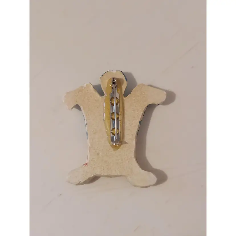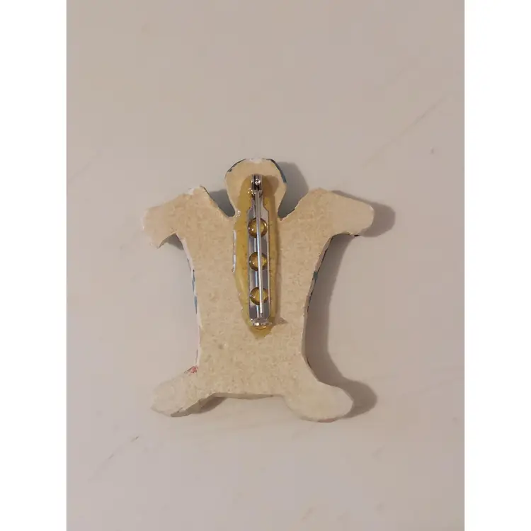 This handmade brooch features an adorable playful cat that is beautifully hand painted. It measures approximately 2.25×1.75 inches and has no markings.