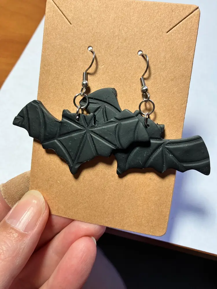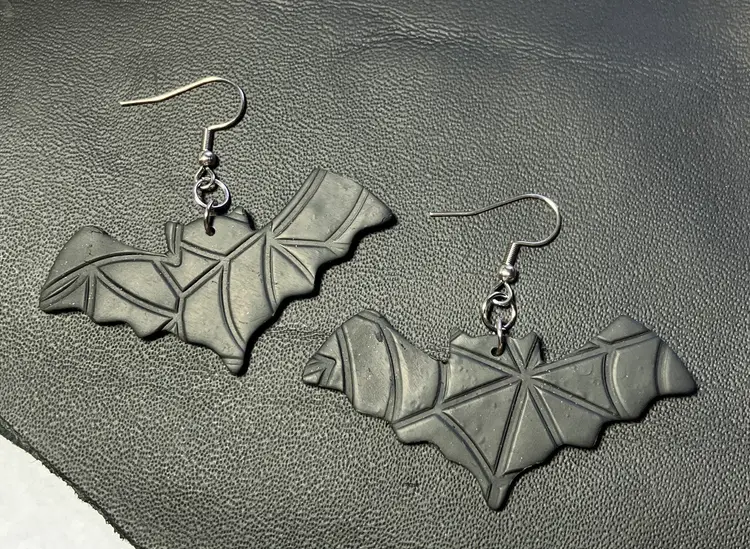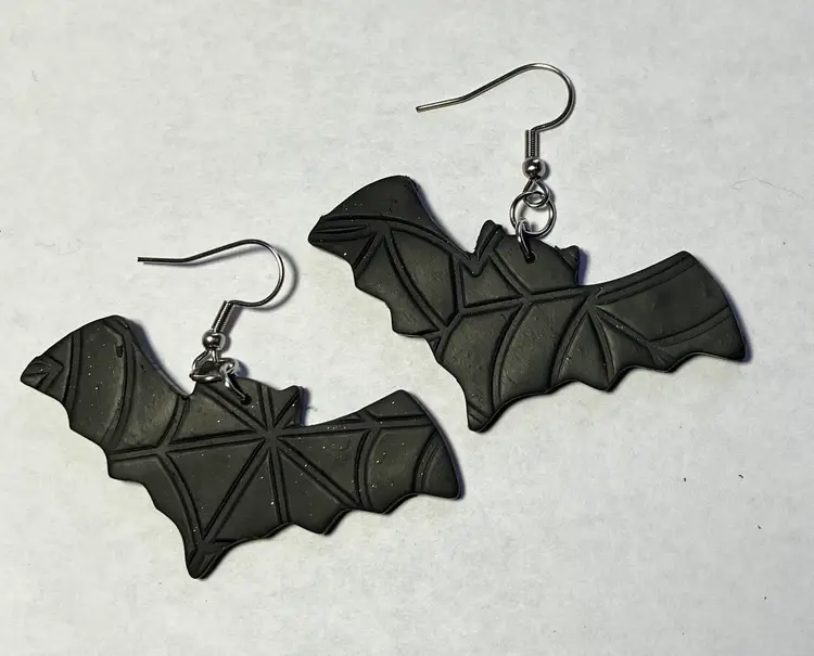 Made of polymer clay, features a spiderweb texture on the bats. uses stainless steel hooks, measures 2” long by 2 1/4” wide