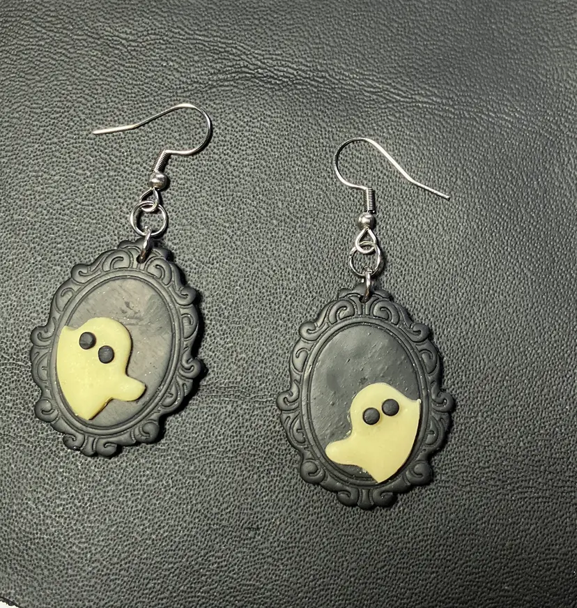 Made of polymer clay, the ghosts glow in the dark, uses stainless steel hooks, measures 2 1/4” long by 1” wide