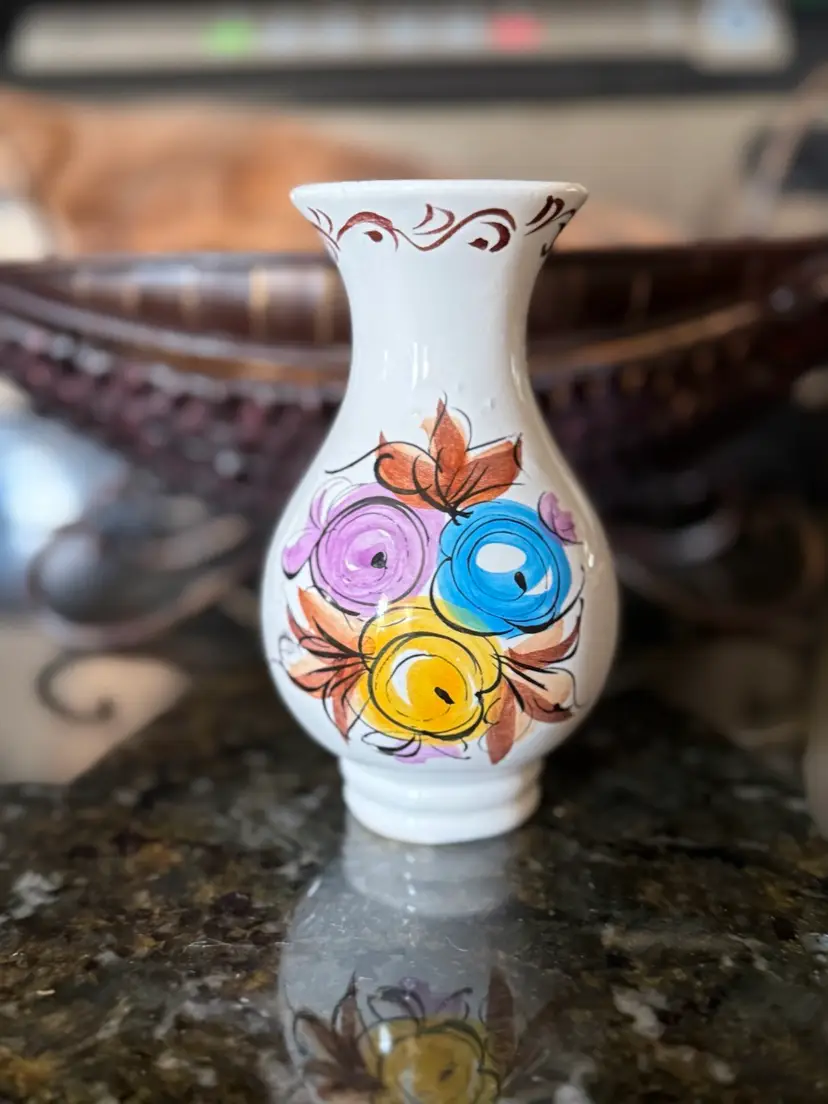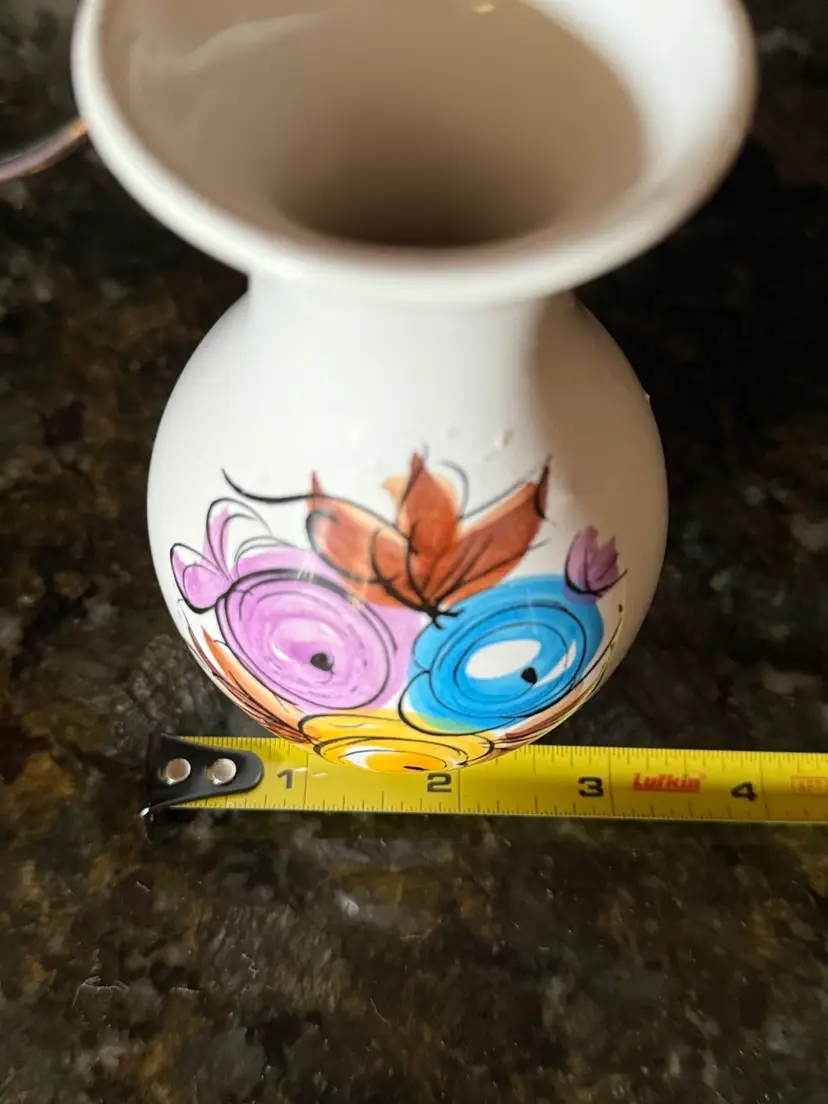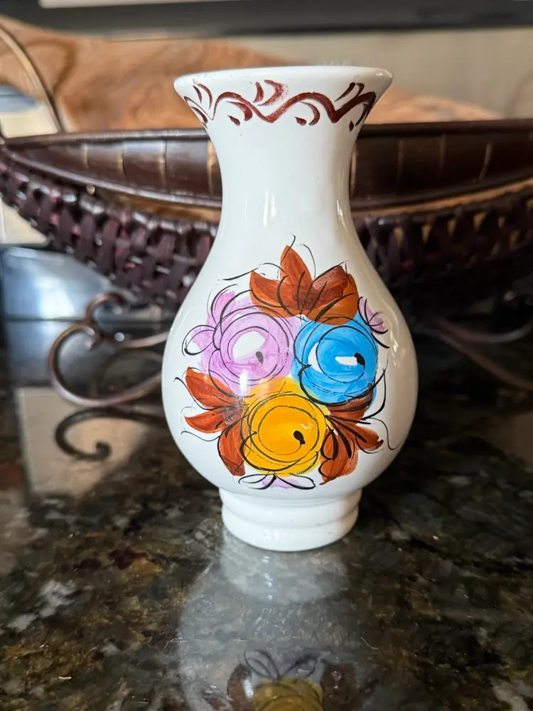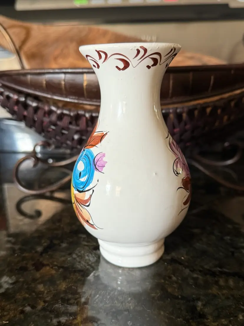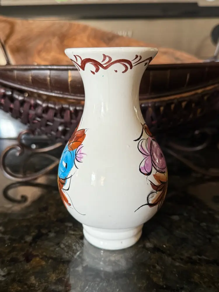Handmade Portuguese vase with floral design. Signed on bottom. 5” tall.