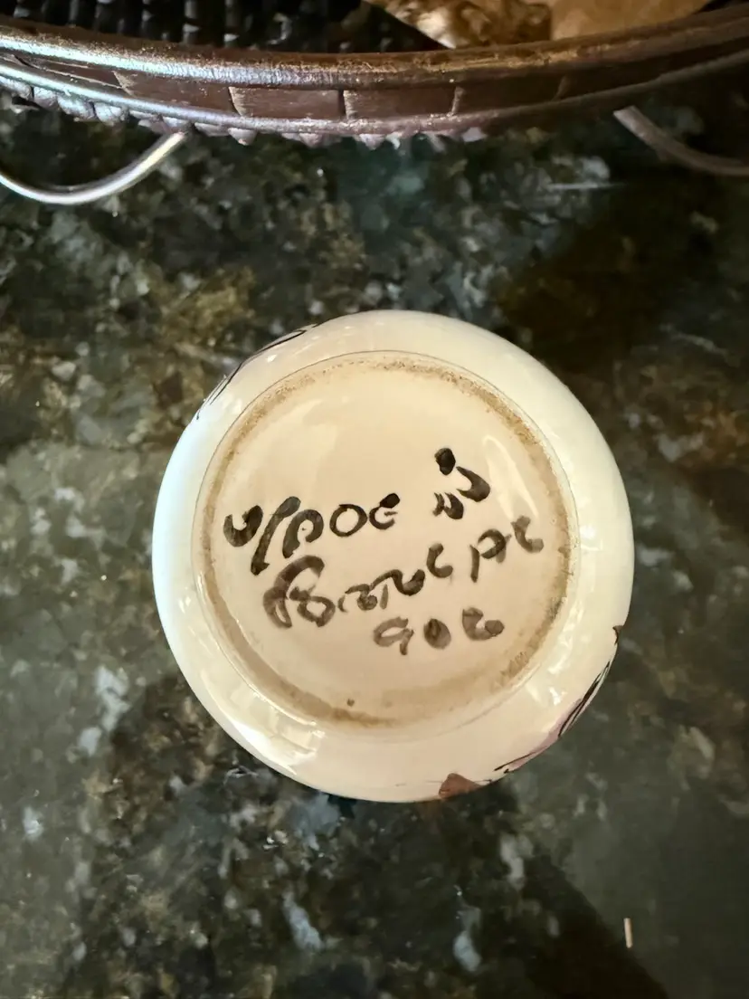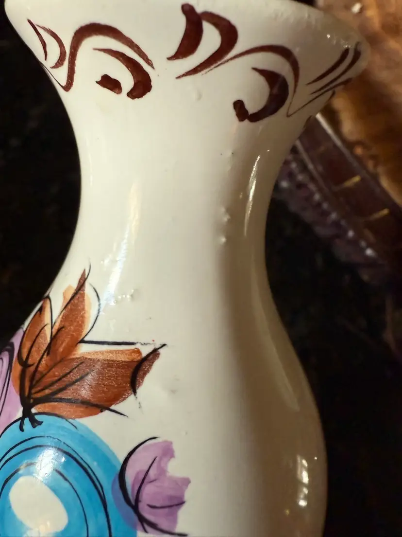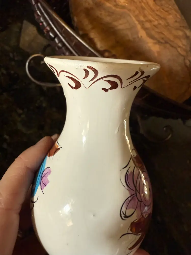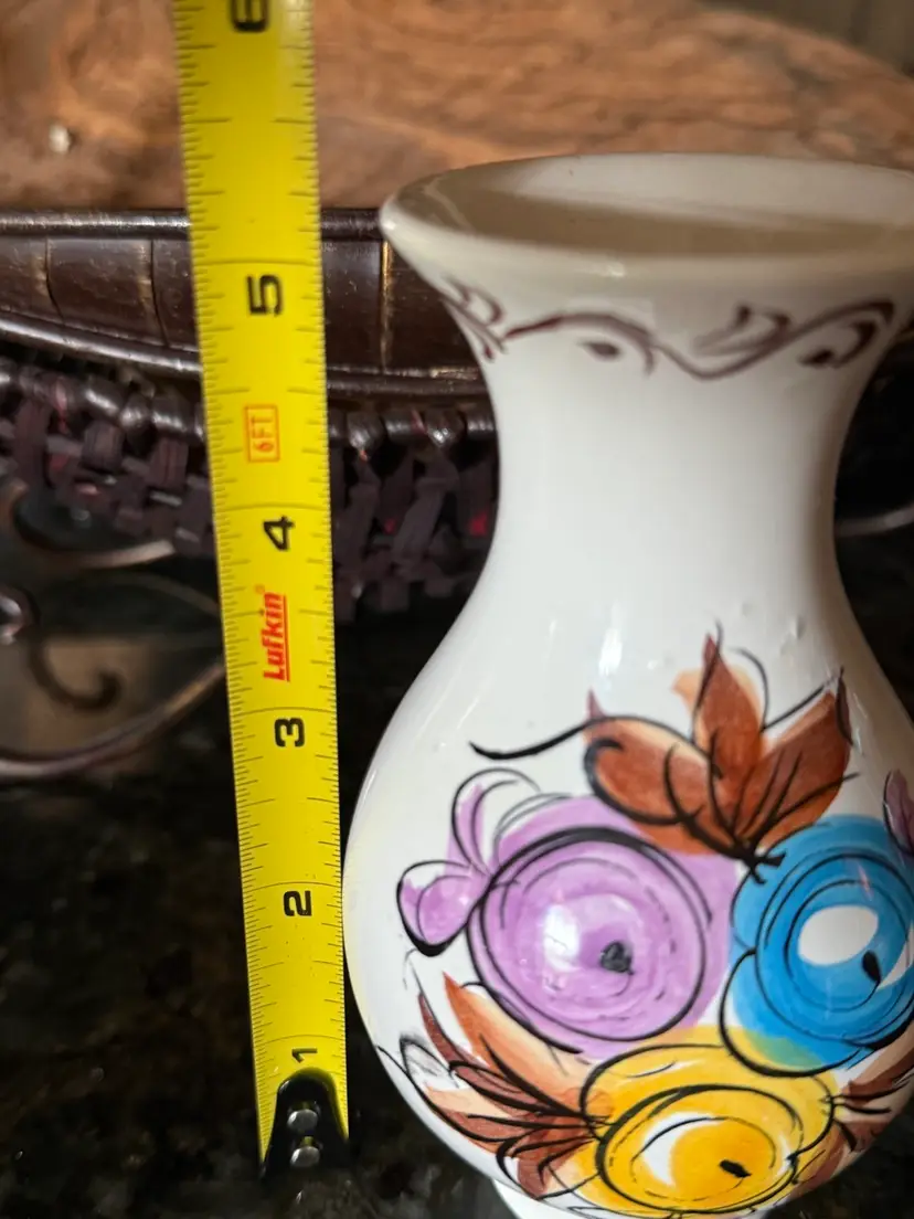 Handmade Portuguese vase with floral design. Signed on bottom. 5” tall.