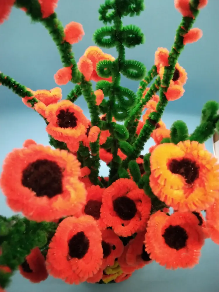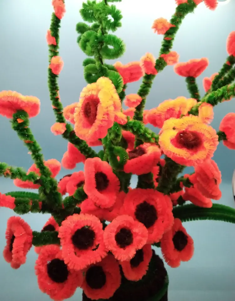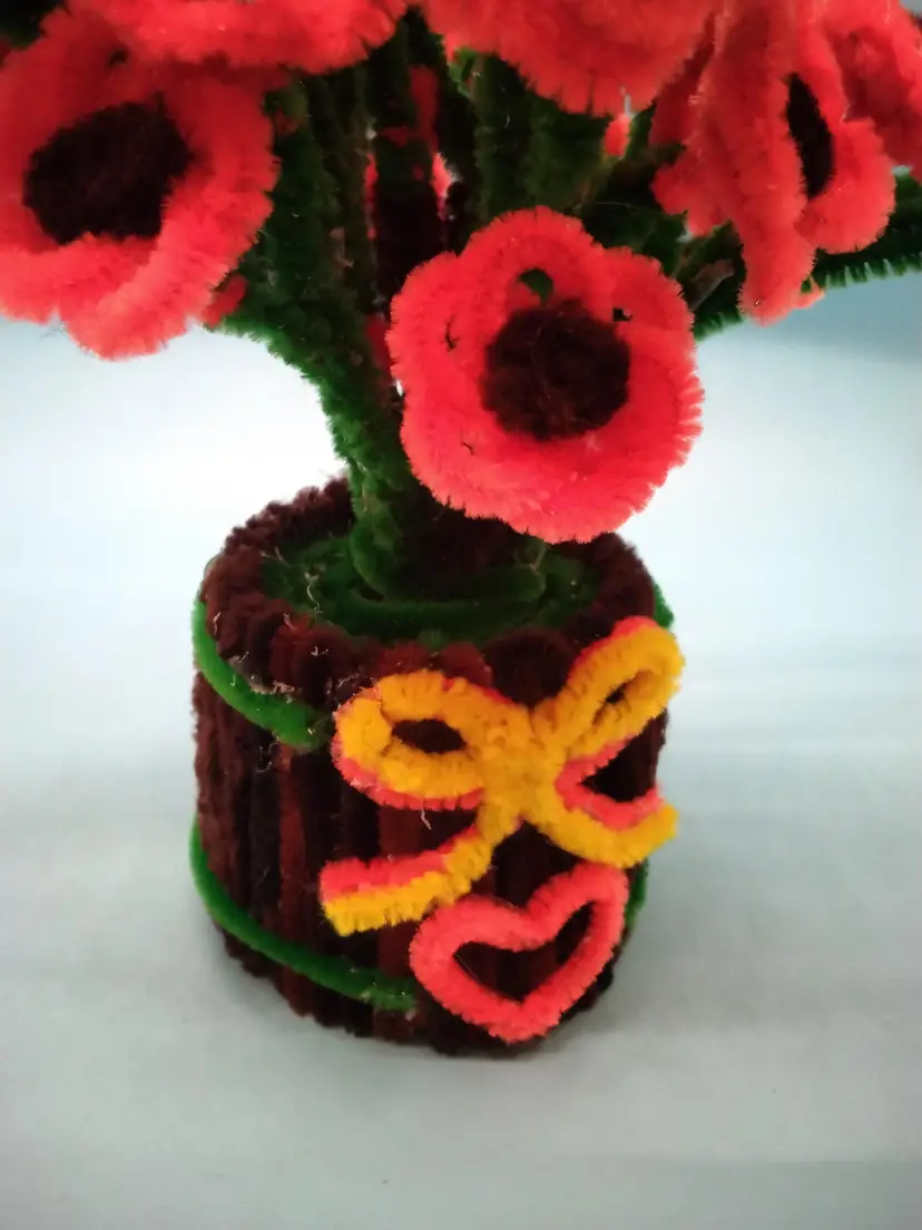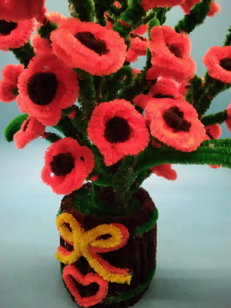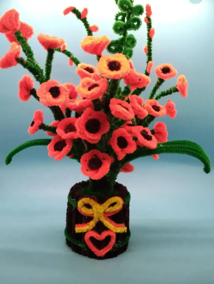 Brighten up any space with this vibrant handmade flower bouquet crafted from colorful pipe cleaners. Perfect for adding a playful touch to your home decor or as a unique gift. The bouquet is arranged in a charming pipe cleaner vase, complete with decorative bows and hearts. Made by me. Perfect for hospital and nursing home gifts, with no alergy inducing floral scent.
