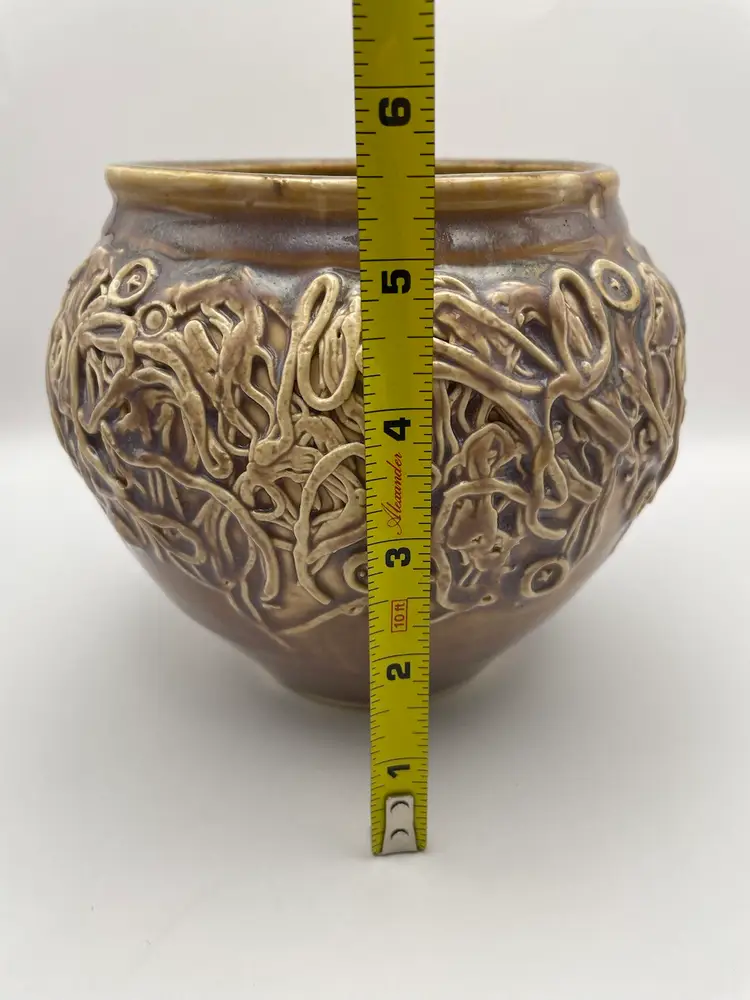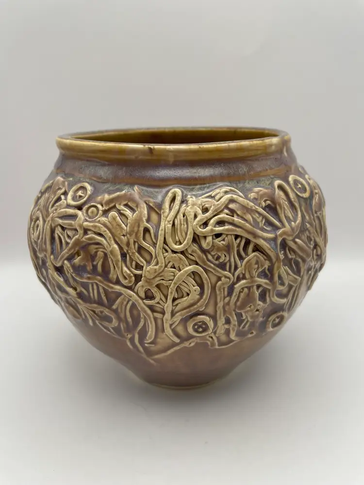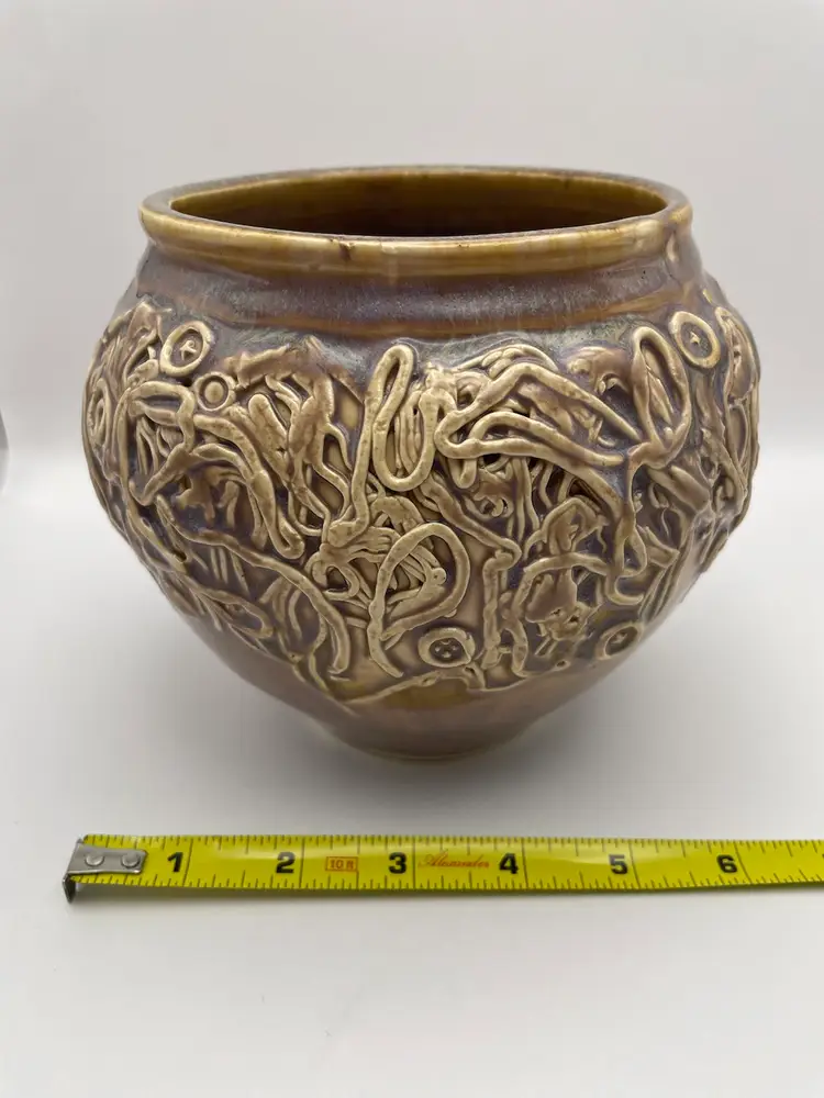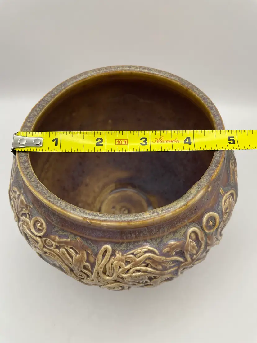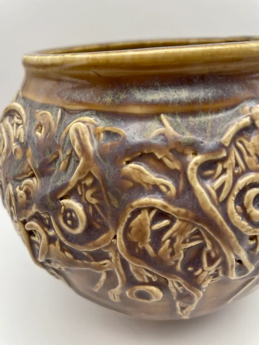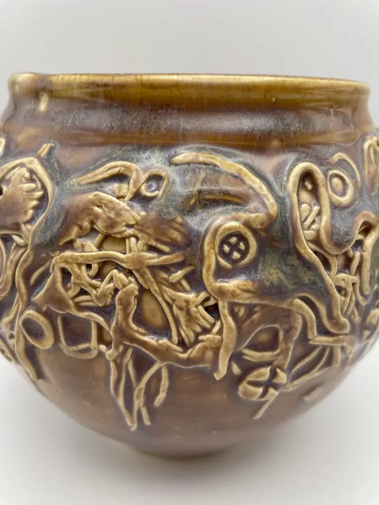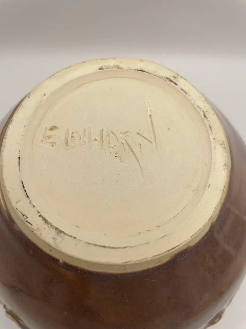 Handmade Pottery Vase/Bowl, Brown Glaze with Purple Hues, Hand Placed Clay Appliqués, Signed “Einhorn”