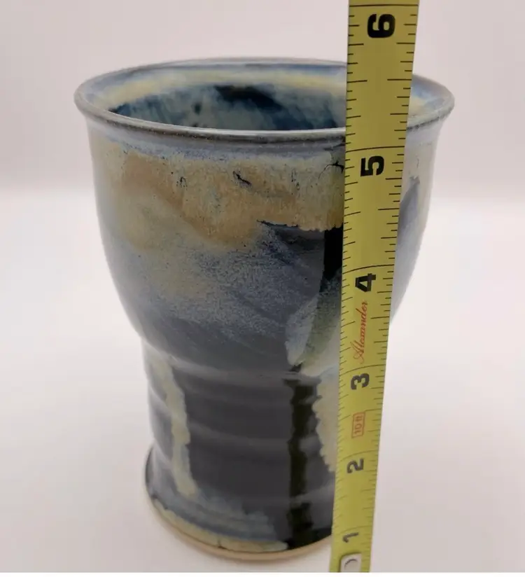 Handmade Pottery Goblet, Dark/Lt. Blue and Tan. Use for drinks, flower vase, pens/pencils, makeup brushes, etc. Measures approximately 5.25” tall
