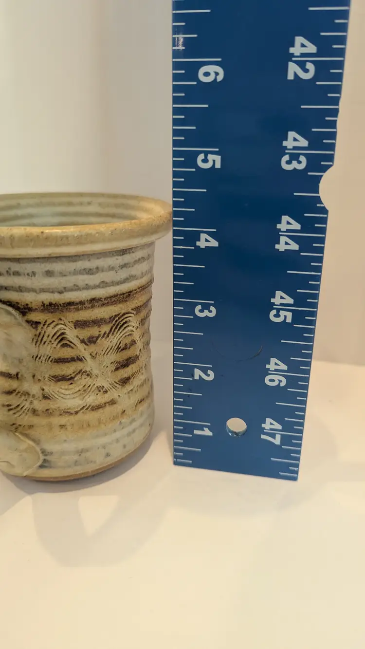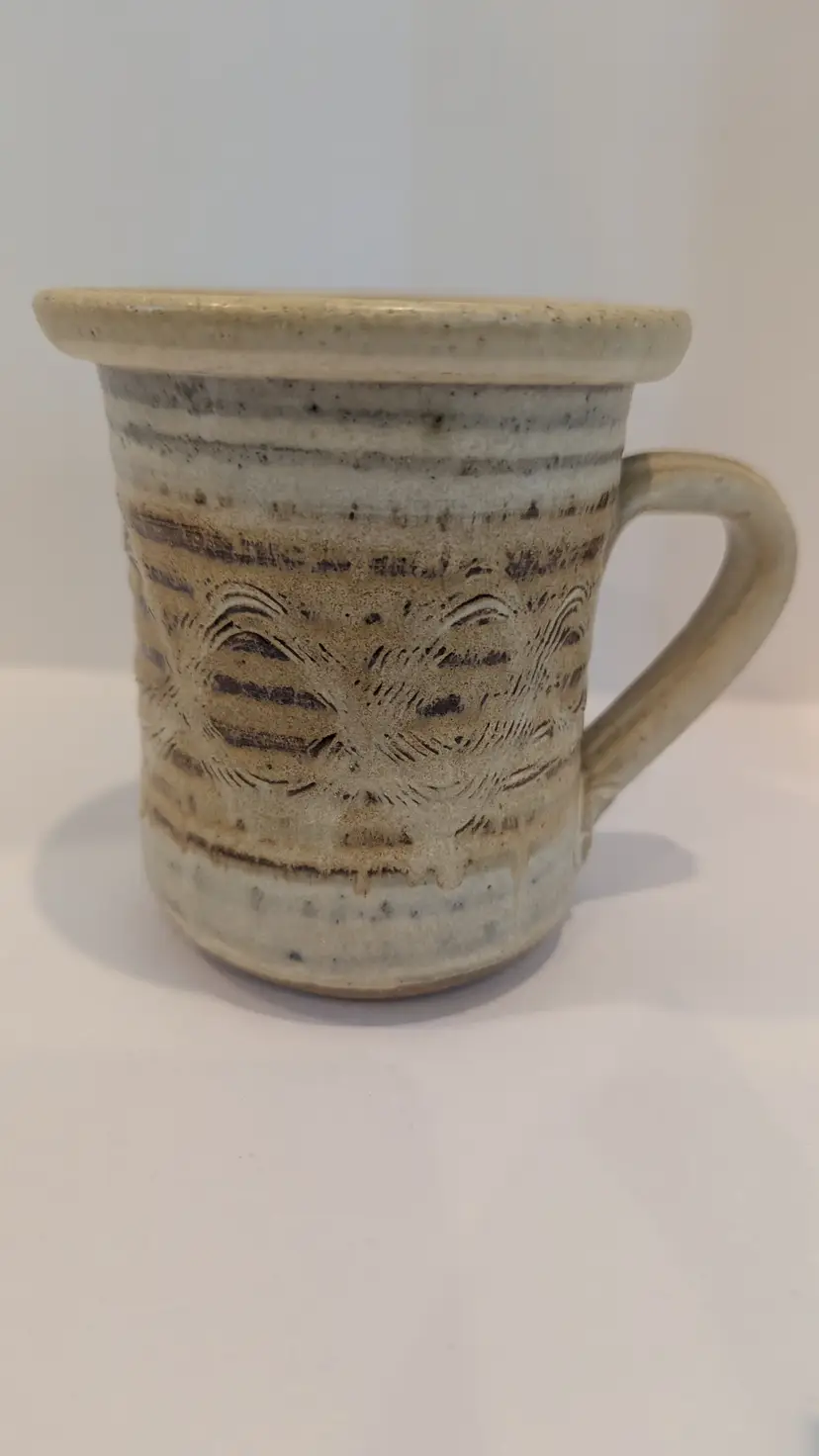 Pottery mug in browns. Ridged design with unique infinity pattern made from Alabama clay.