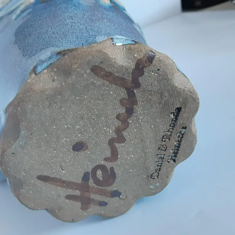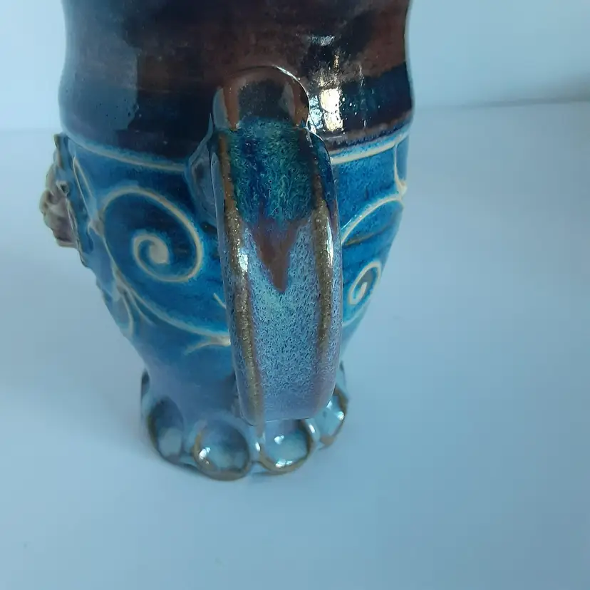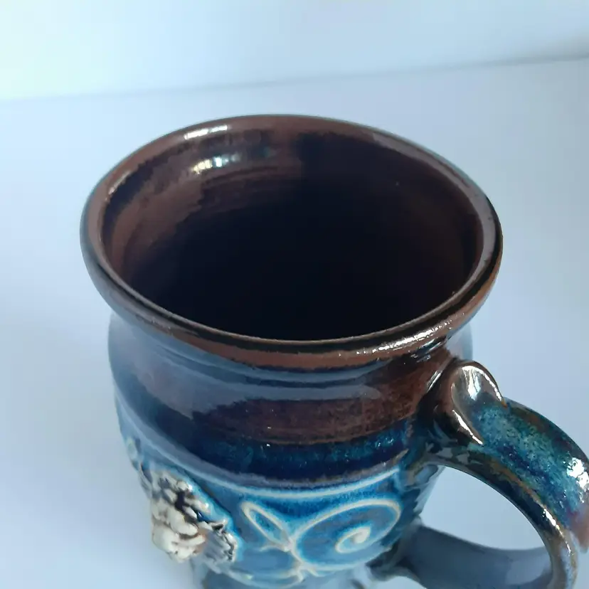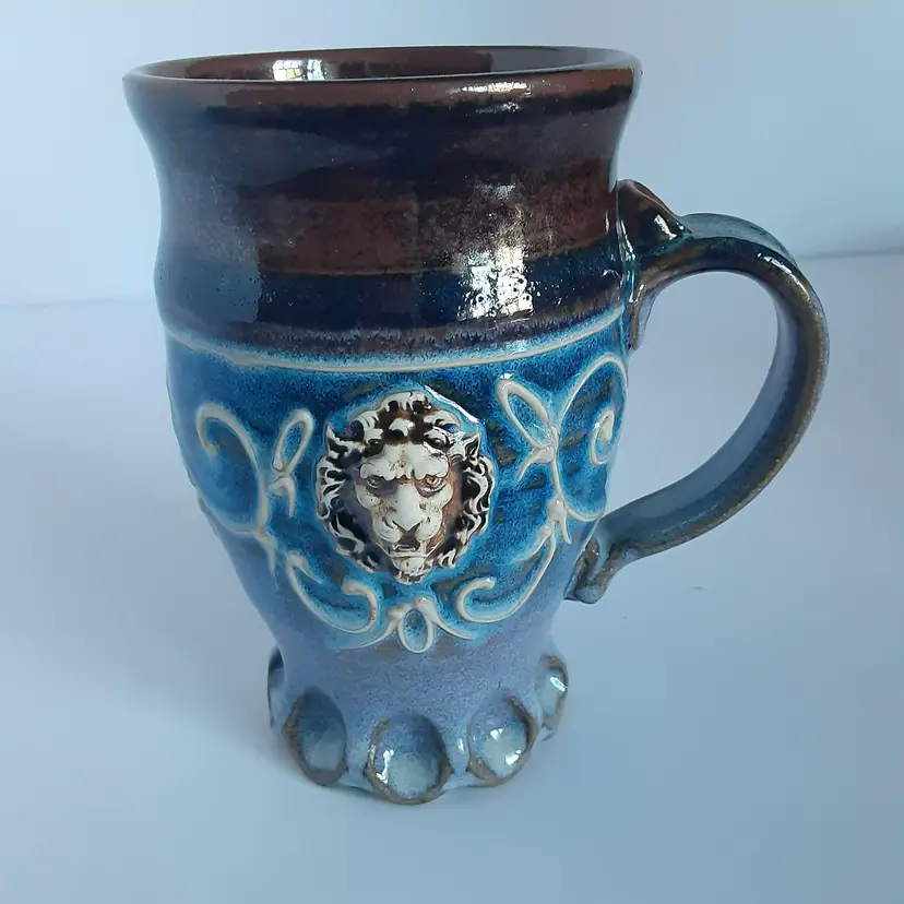 This beautiful handmade mug is a unique piece of art that will add a touch of charm to your collection. The mug features a stunning lion's face on one side, making it a perfect gift for animal lovers. The pottery production technique gives it a distinct character, while the blue and brown colors blend together beautifully. The mug is signed by the artist, adding to its value and authenticity. Its quality craftsmanship and attention to detail make it a great addition to any home. This handmade mug is not only functional but also a work of art that will be cherished for years to come. It's measurements are 6 1/4 inches tall and 5 inches round.