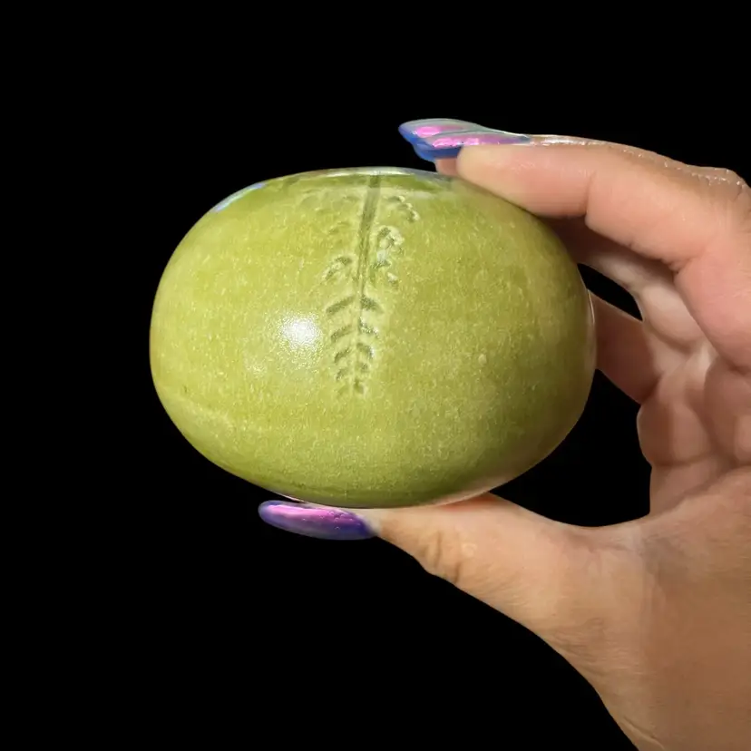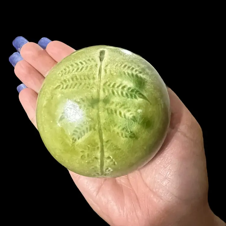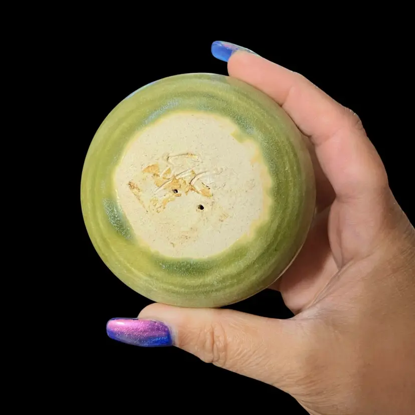 Inside, it contains beads or chimes, so when gently shaken it creates a soft rattle — a playful touch to a functional piece. • Origin: Treasure Coast Potters, Vero Beach, Florida • Size: 2” tall × 3” diameter • Condition: Excellent condition. No chips or cracks. Signed on the bottom, though the signature is illegible. • Features: Handmade, impressed fern motif, green glaze, rattle sound inside, functional as a desk paperweight or collectible piece of art pottery.