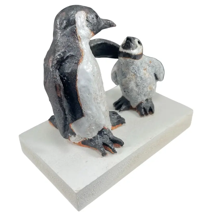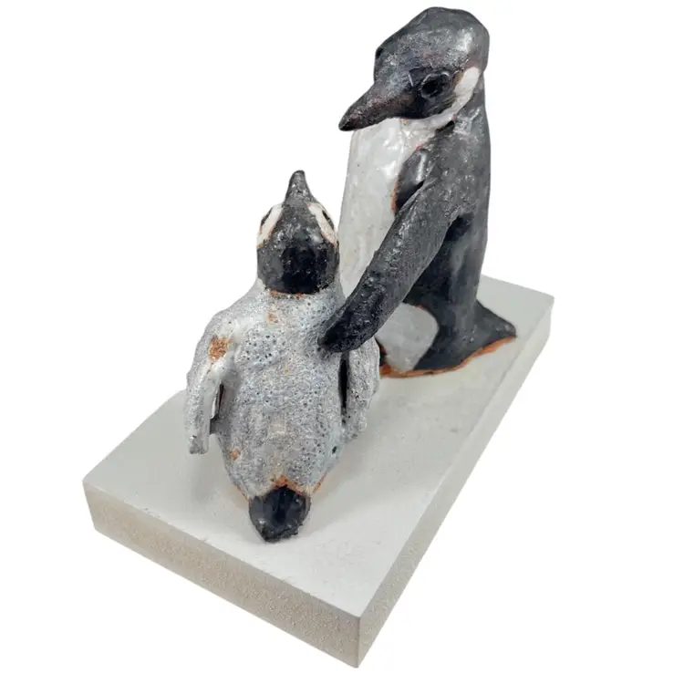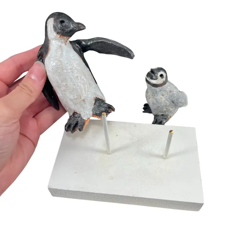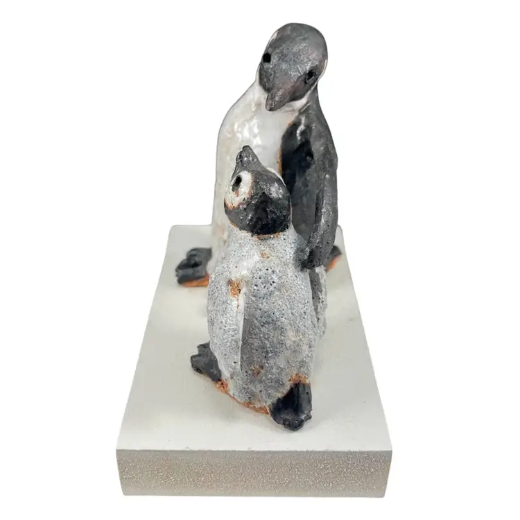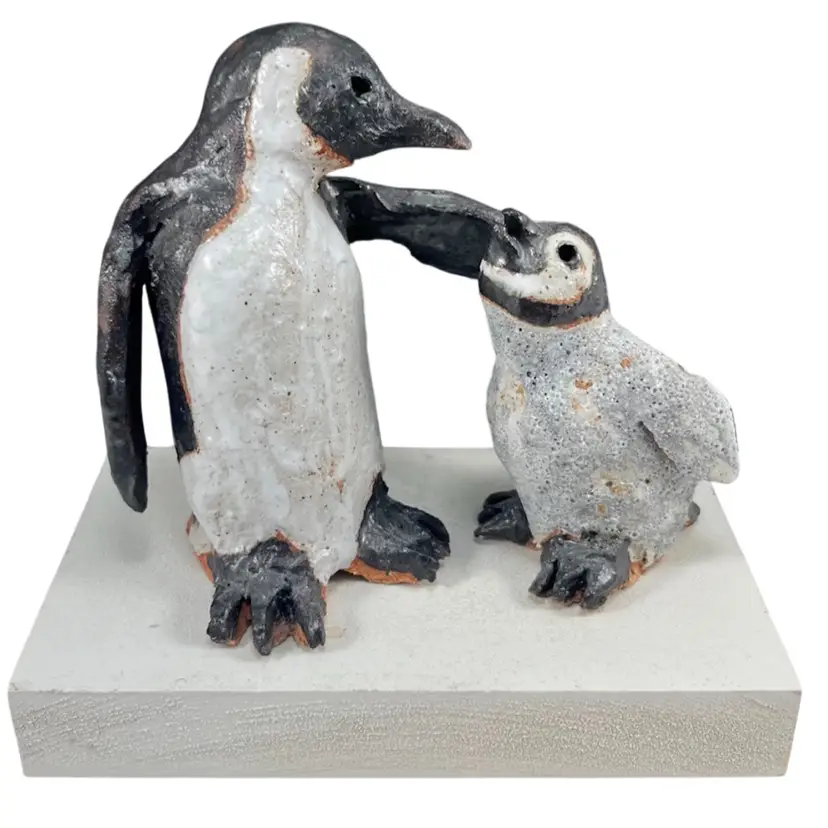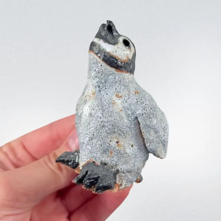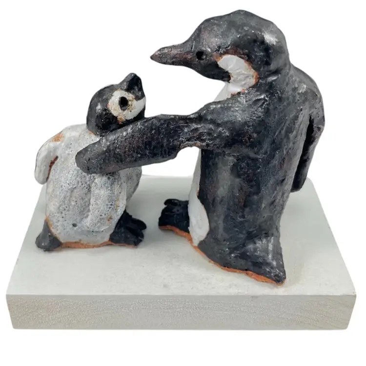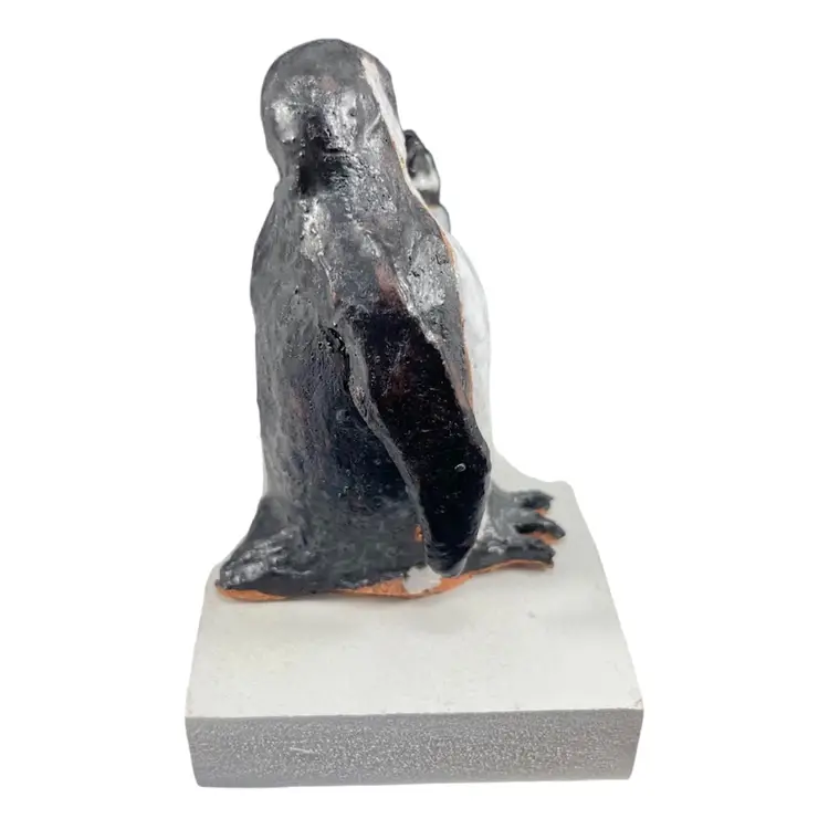 When penguins are on stand the whole piece is approximately 5” x 3” x 4.5”. Although I can’t find a signature on this piece, I’m almost certain it’s by a local Michigan artist named Paul Nilsson. Check out his website to see similar penguin sculptures! No chips or cracks. Penguins have a rough finish glaze and are removable from metal sticks and wood stand. They sit loosely on top.