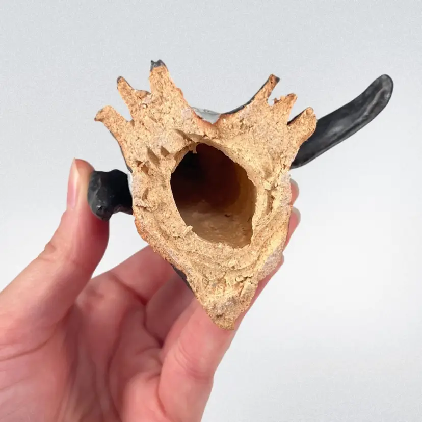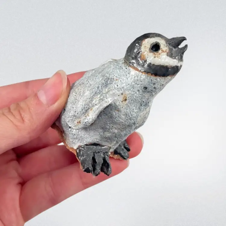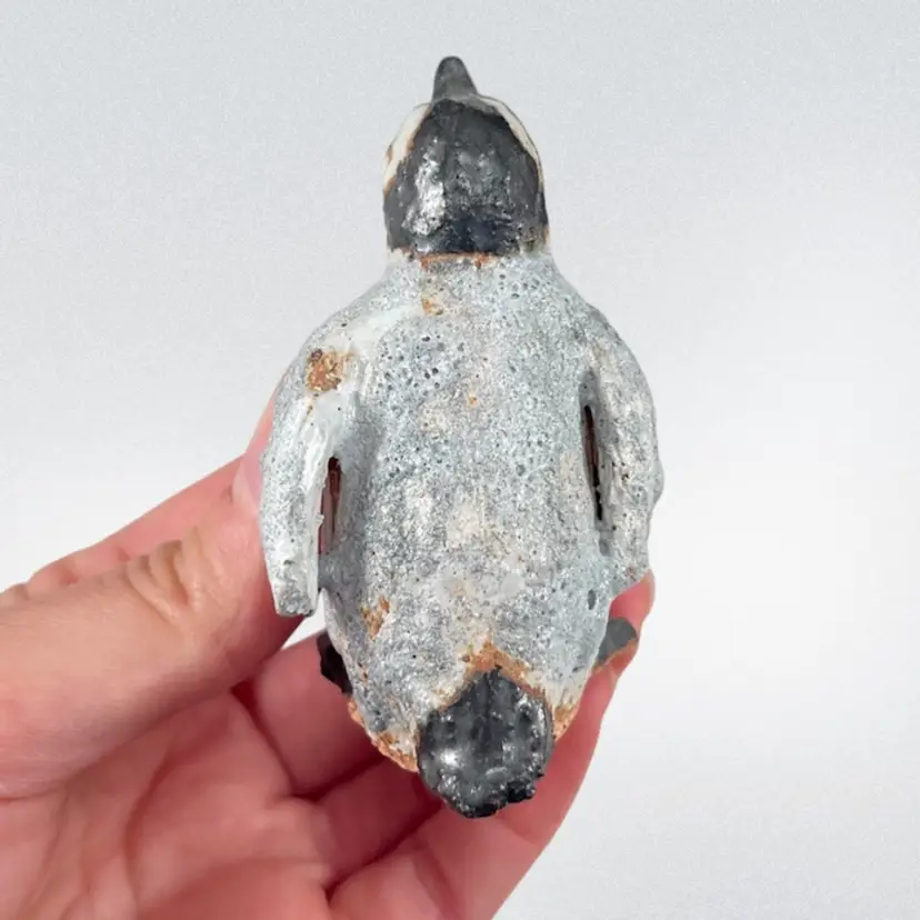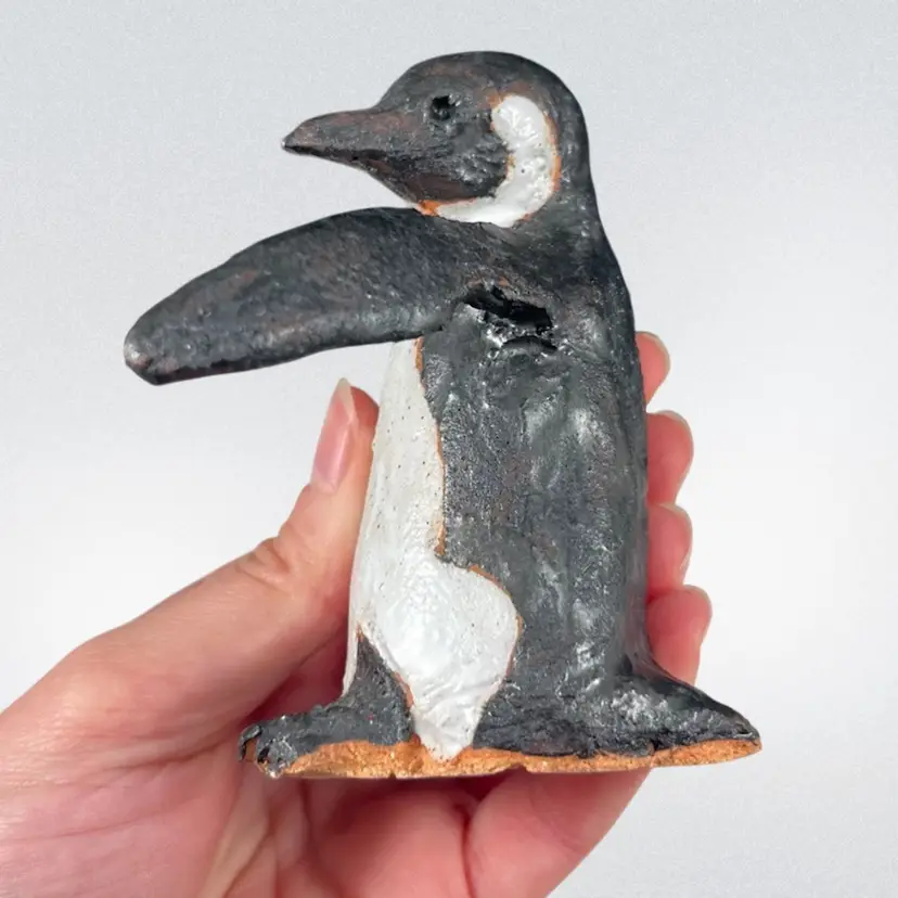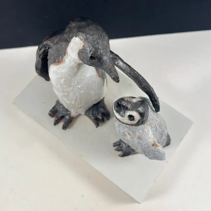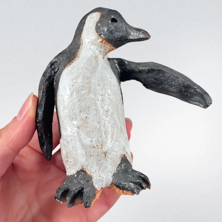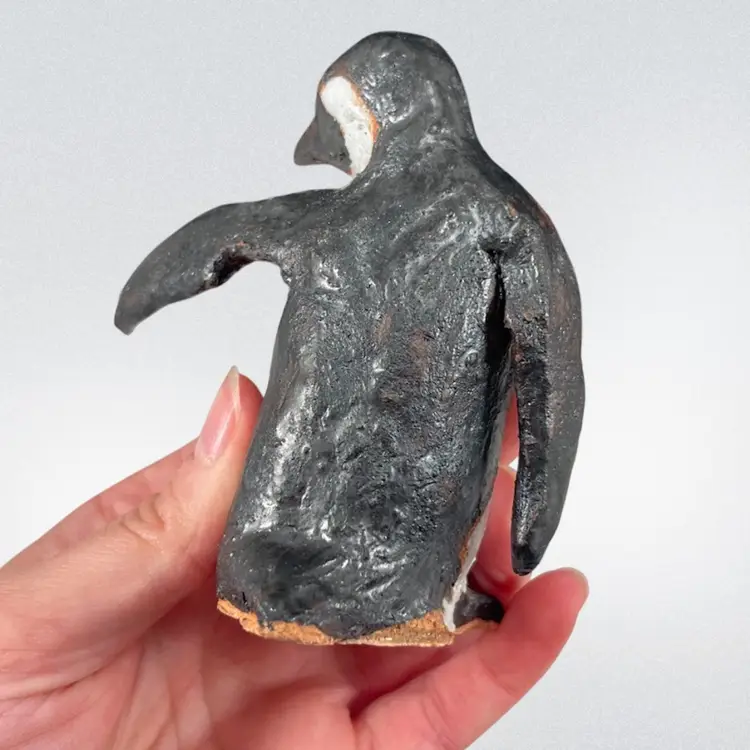 When penguins are on stand the whole piece is approximately 5” x 3” x 4.5”. Although I can’t find a signature on this piece, I’m almost certain it’s by a local Michigan artist named Paul Nilsson. Check out his website to see similar penguin sculptures! No chips or cracks. Penguins have a rough finish glaze and are removable from metal sticks and wood stand. They sit loosely on top.