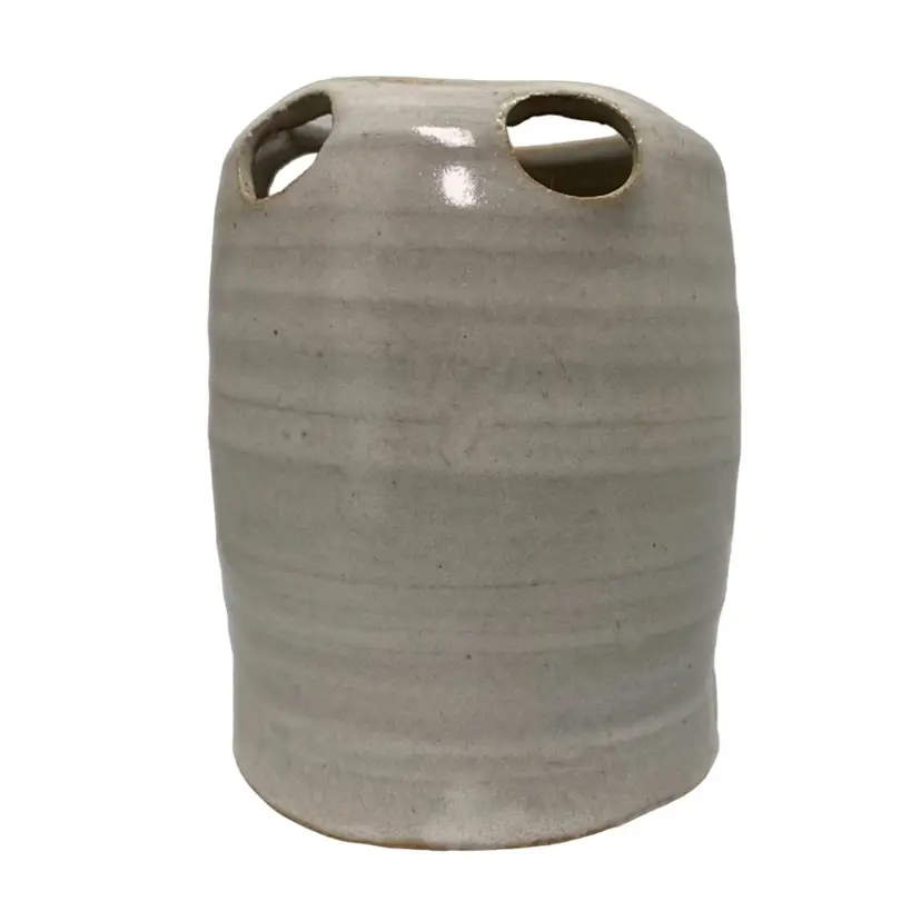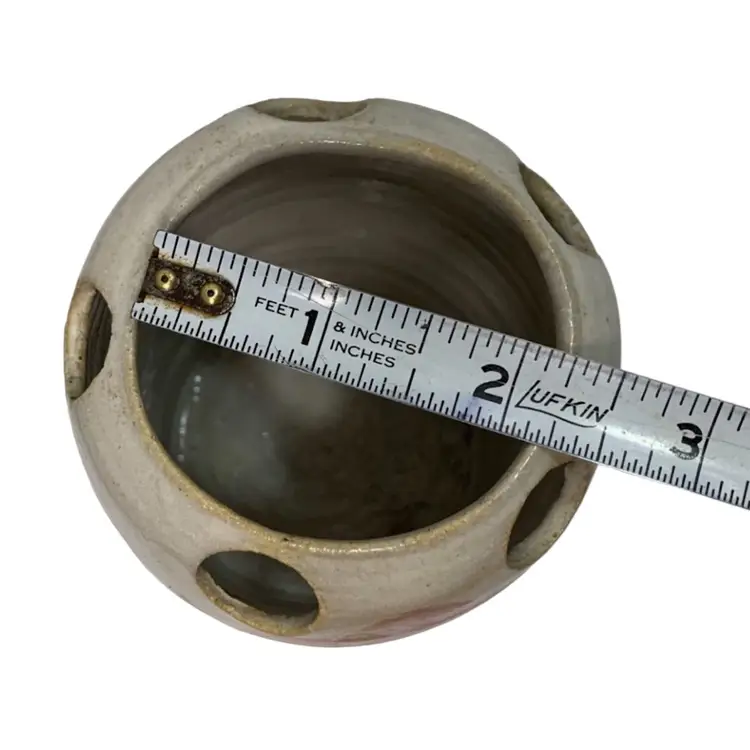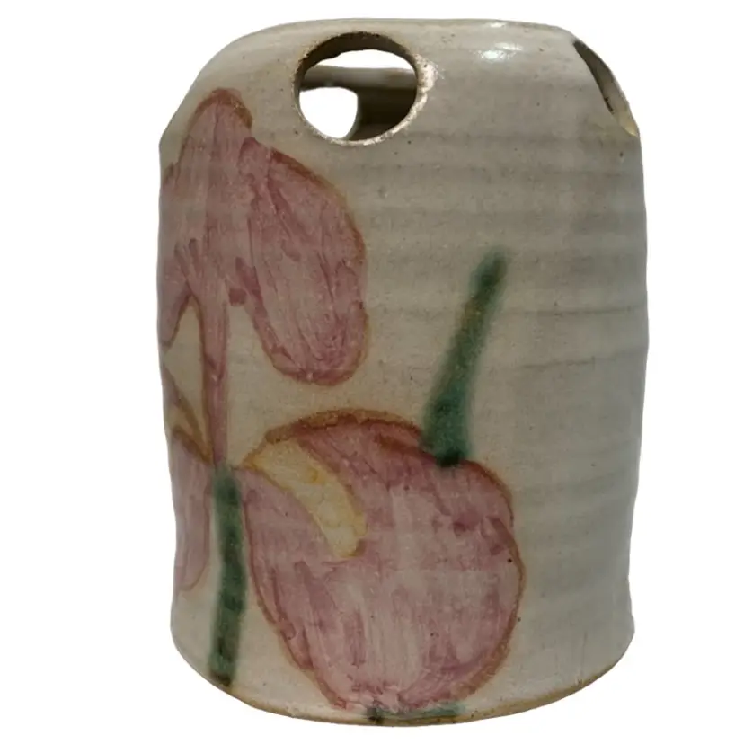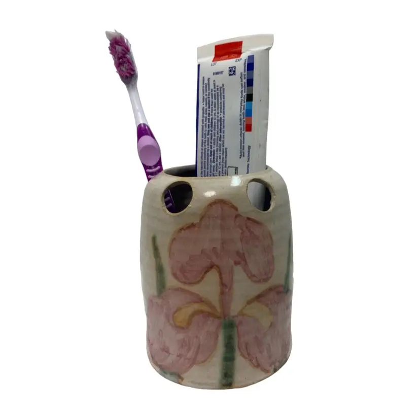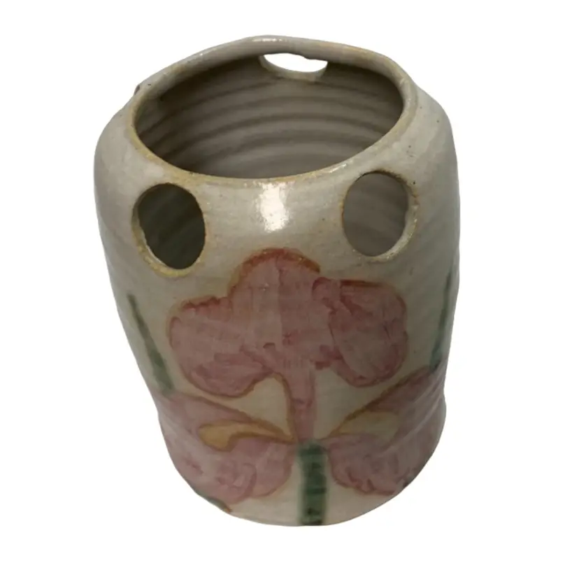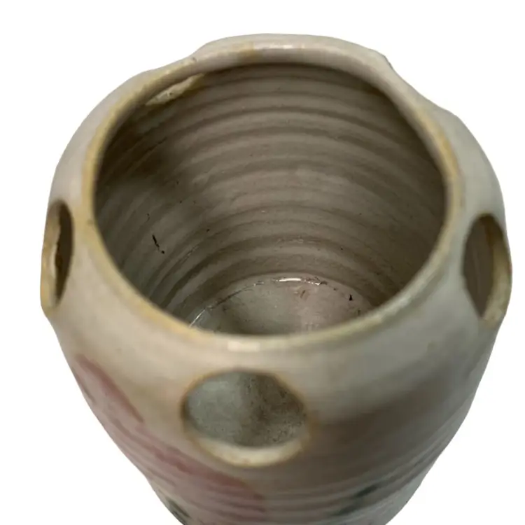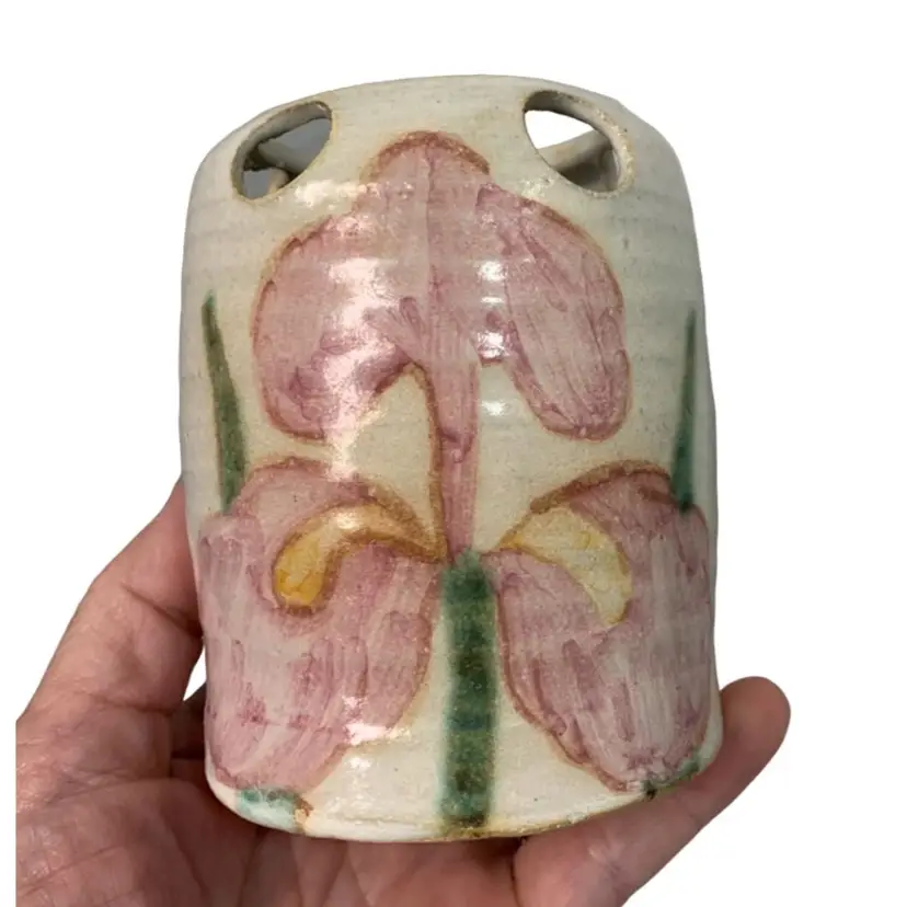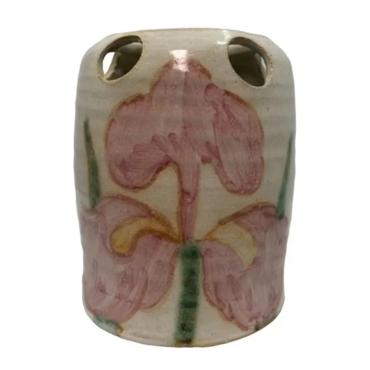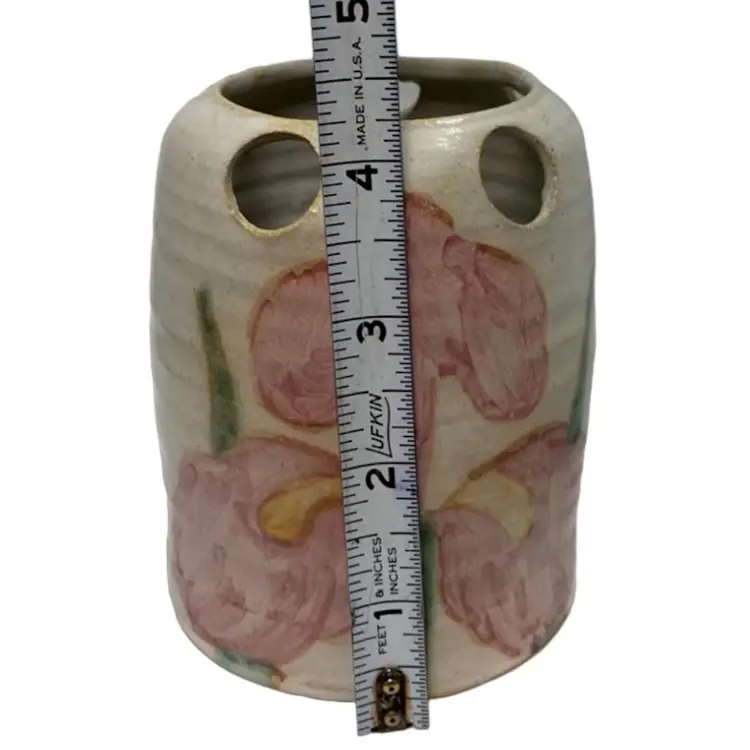 This pretty container has no chips cracks or repairs. Use it to hold your toothbrushes and toothpaste, or for pencils. Even as a small vase. The signature on the bottom is very difficult to see, but I believe it says ‘89 Lisa. The glaze has a shiny finish, and the sides are slightly ribbed. Previous owner may have used it to hold pens, there are a few small spots inside the very bottom that I was not able to clean. I believe they are ink.