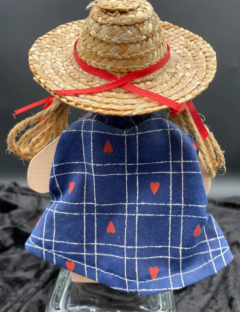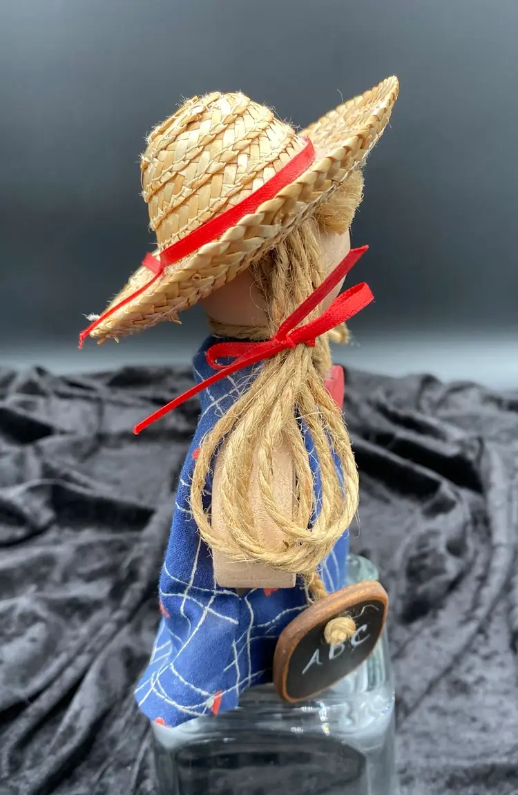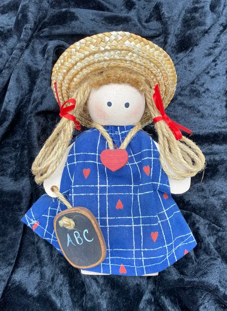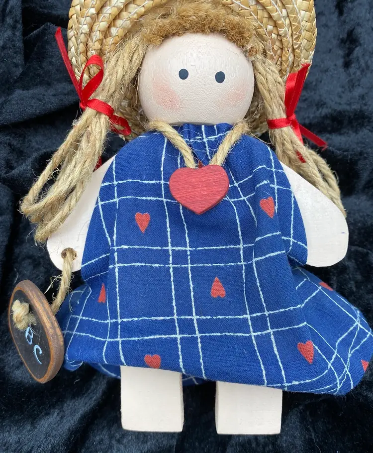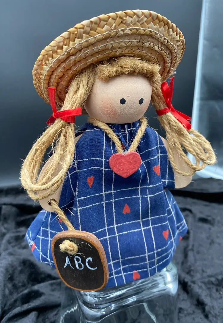 This handmade wooden doll is a charming addition to any collection. The doll is a primitive style figure, created out of a plain wood form, with light brown rope hair and black eyes. The doll is dressed as a schoolgirl in a gingham heart dress and comes with a heart necklace as well as a chalkboard with 'ABC' on it. The doll measures 5.5 inches in length and 3.5 inches in width, with a weight of 4.1 ounces. The doll is an original piece, stands on her own, and was made in the United States during the 2000s.