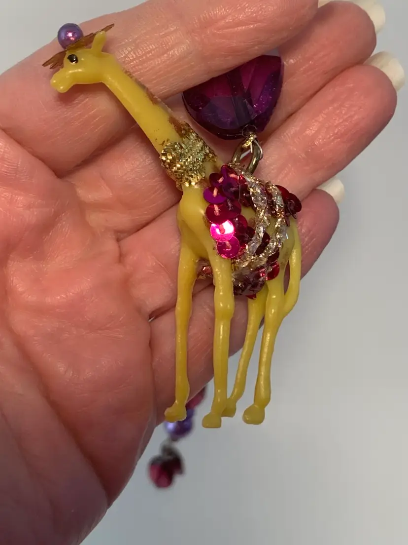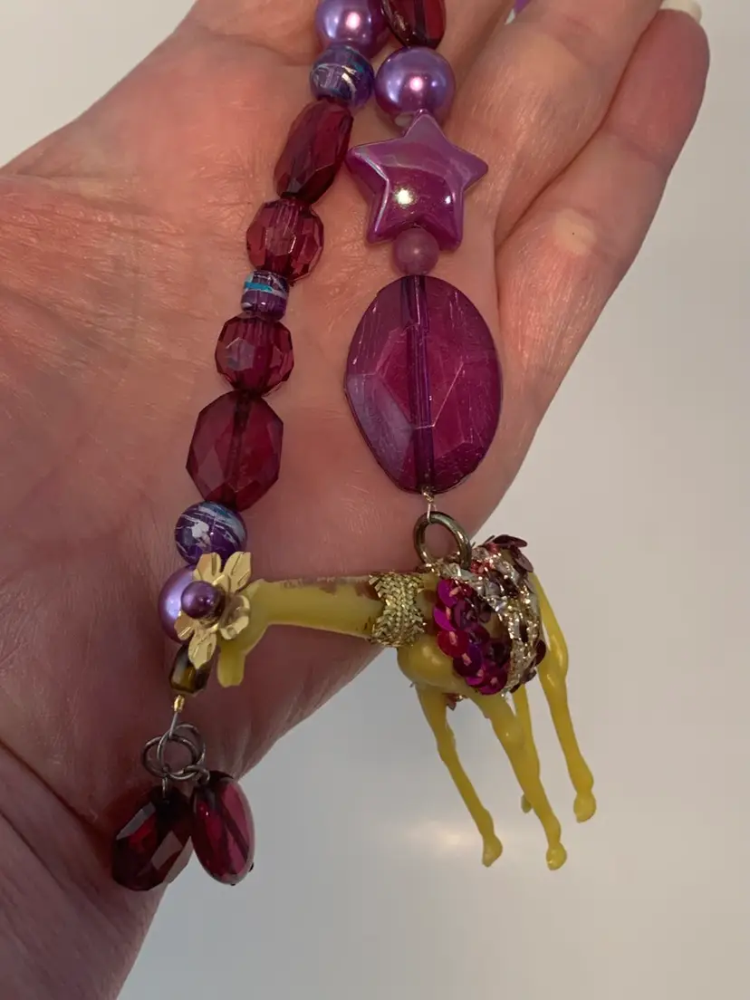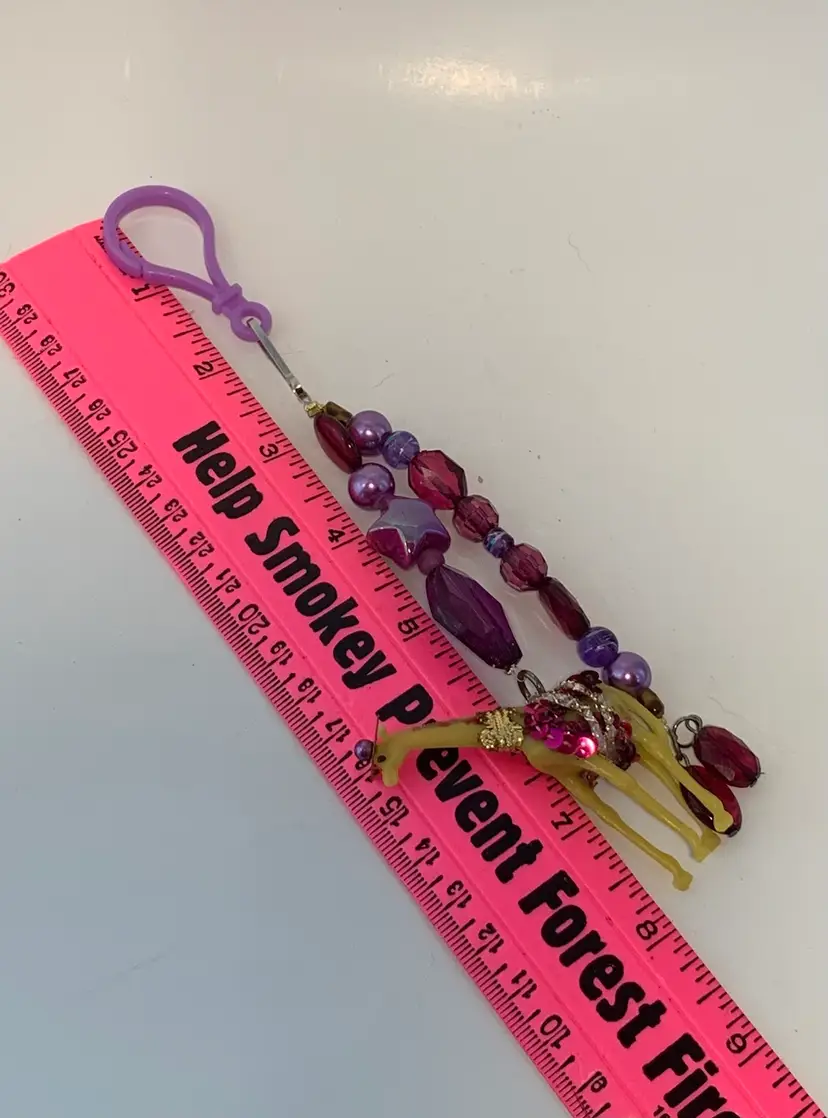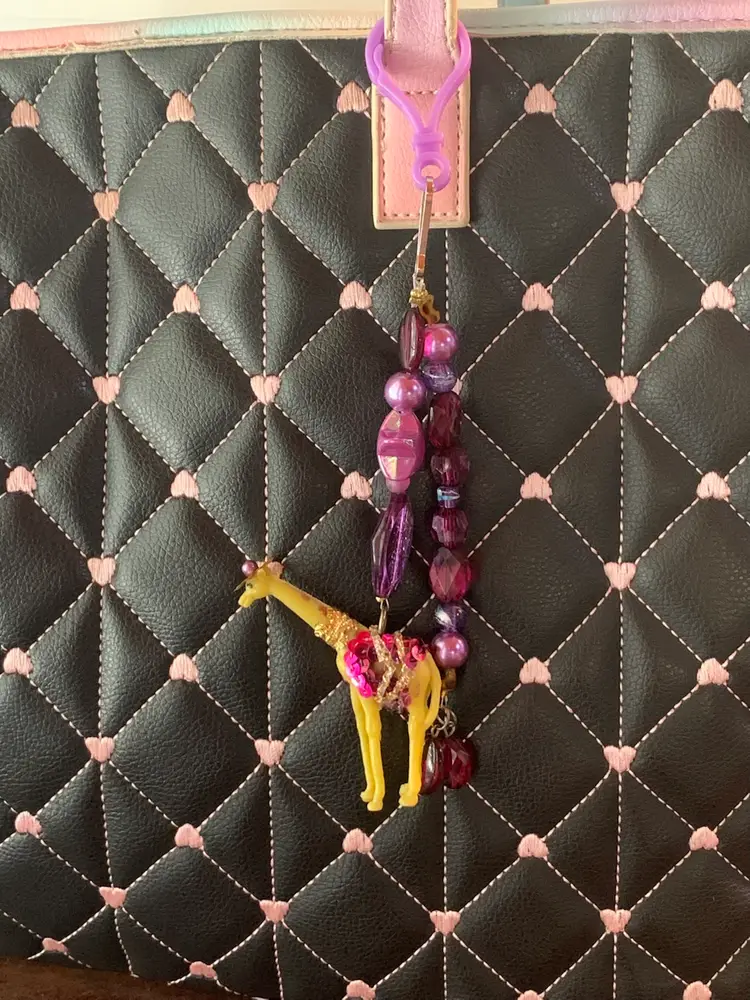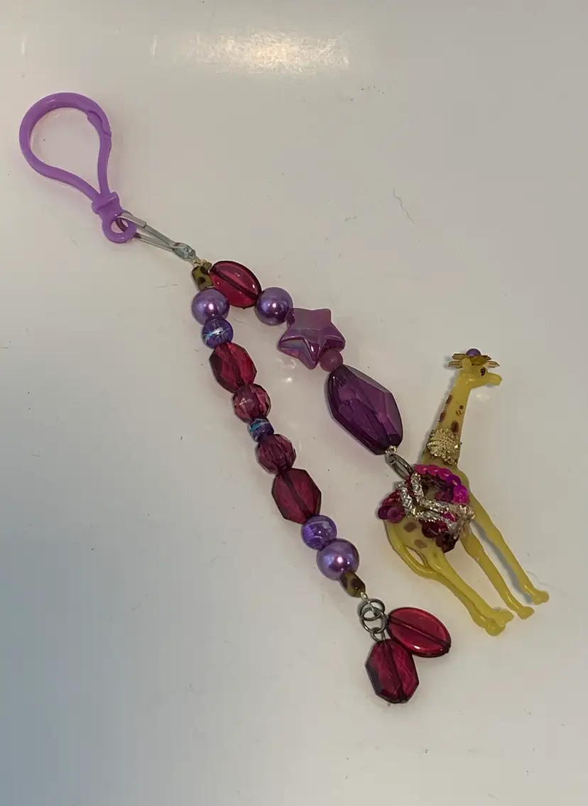 Handmade by me bag charm/ keychain. Bag charm has a strand of purple beads and a second strand with purple beads and an embellished by me plastic toy giraffe. Giraffe is decorated with vintage trim. Bag charm is about 8” in length. Unique and one of a kind charm for a purse or backpack.
