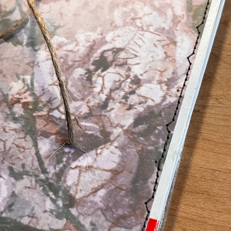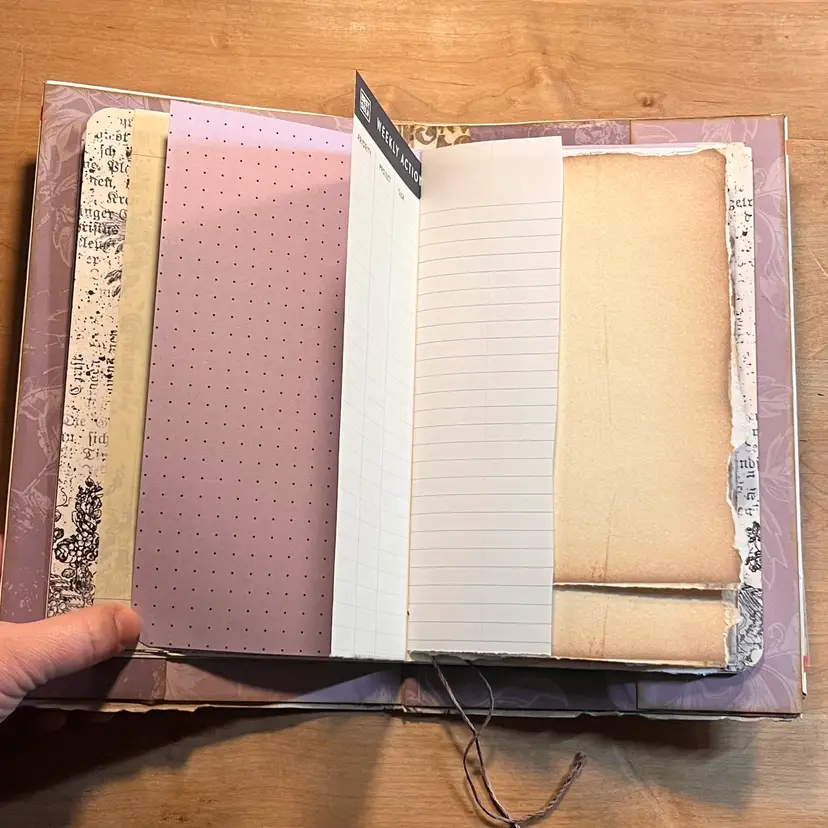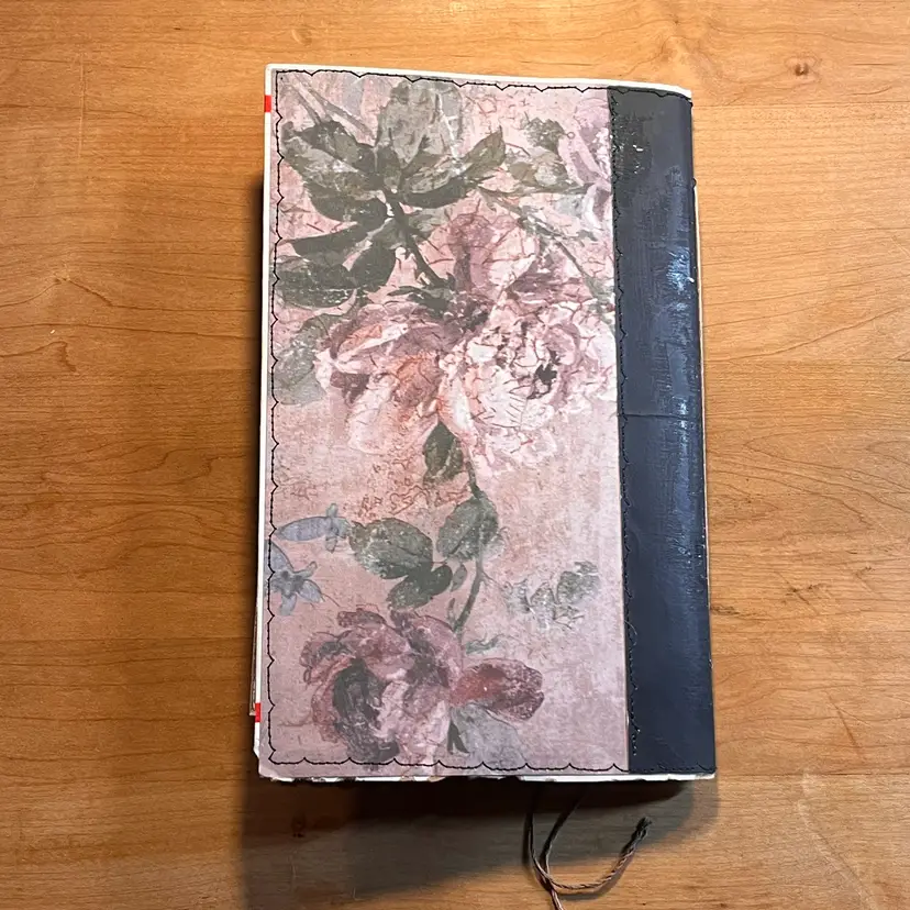 This is a handmade notebook made by me using repurposed materials. The edges of the cover is sewn for texture and the single signature is compiled of papers I have on hand that I just couldn't recycle. They are well suited for this junk journal style notebook.