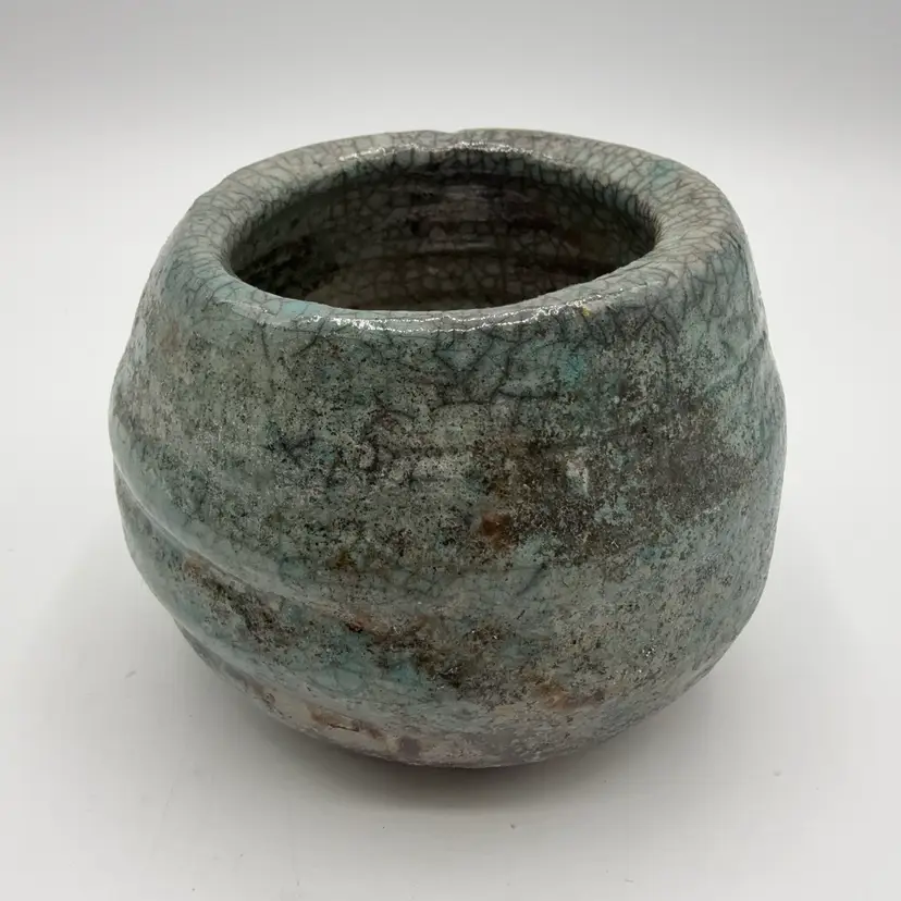 3” tall beautiful aqua color variations with burnt crazing. Unsigned