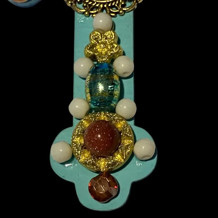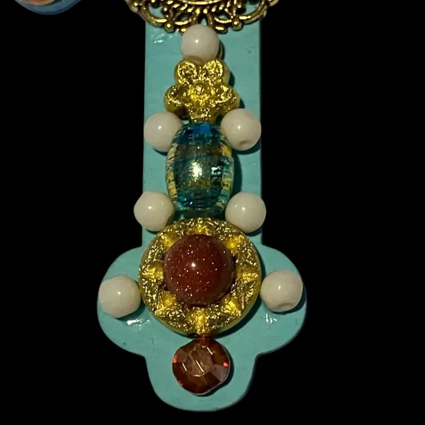 I just started making these beautiful crosses just in time for Christmas! This cross is made from a wood base that measures 4” x 2.5” and has a mixture of new and vintage beads and rhinestones applied with glue. Just the right size for a Christmas tree or can be used as a small wall cross.