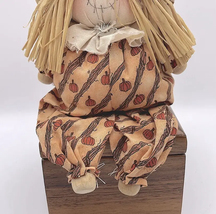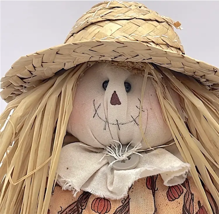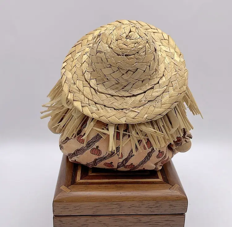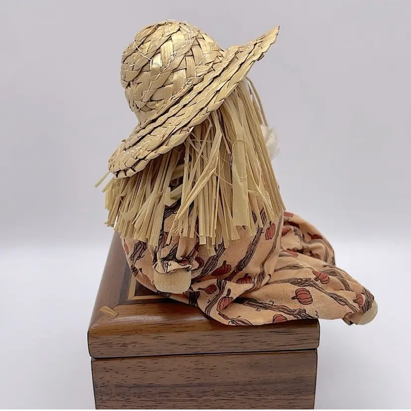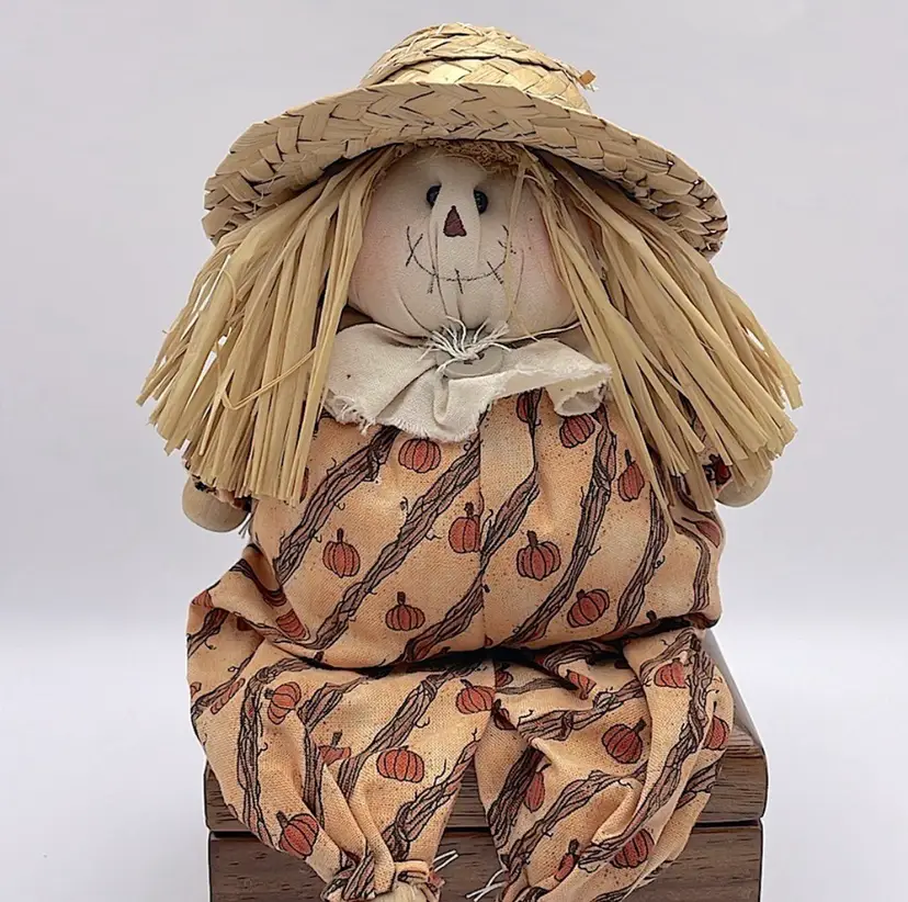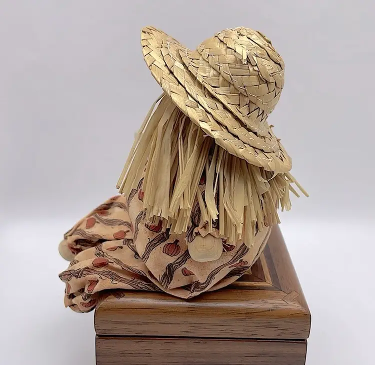 Handmade, Scarecrow Shelf Sitter, Raffia Hair, Straw Hat, Sand-filled. Cute! (Second scarecrow sold separately. Box not included) Please see pictures for measurements.