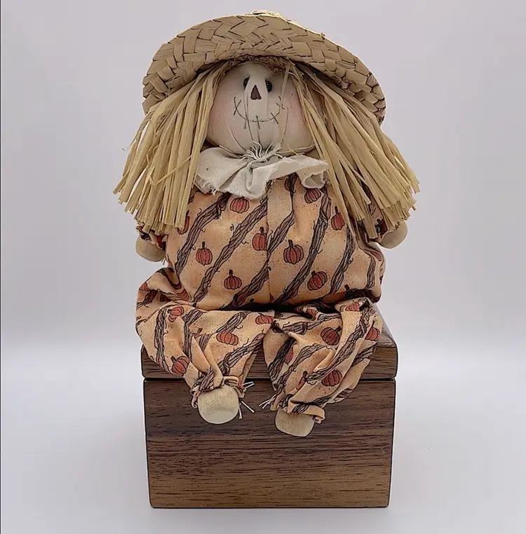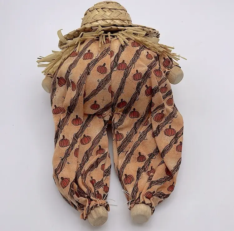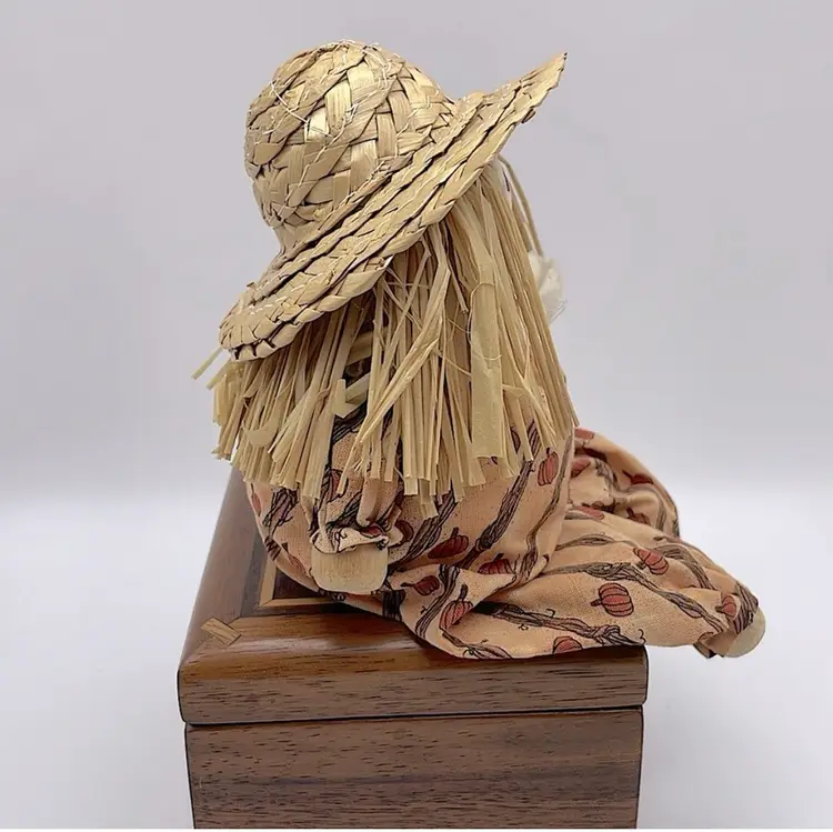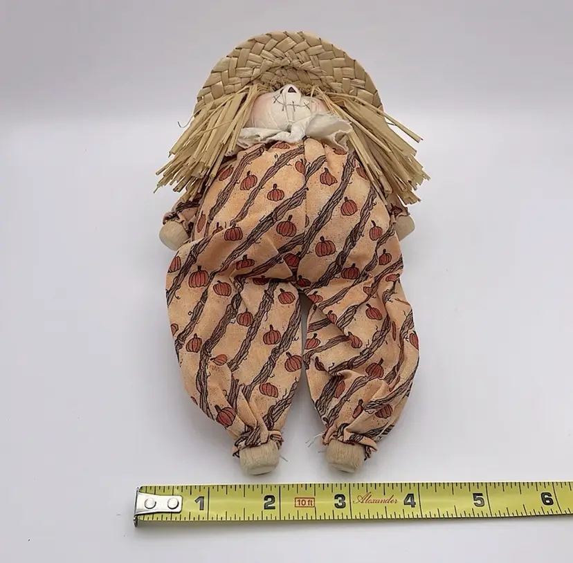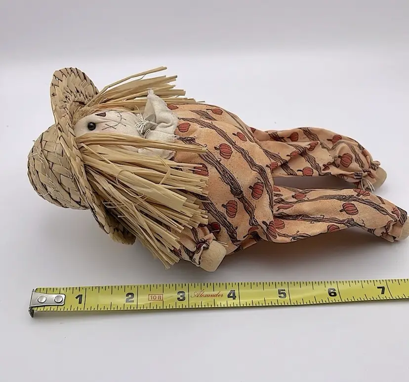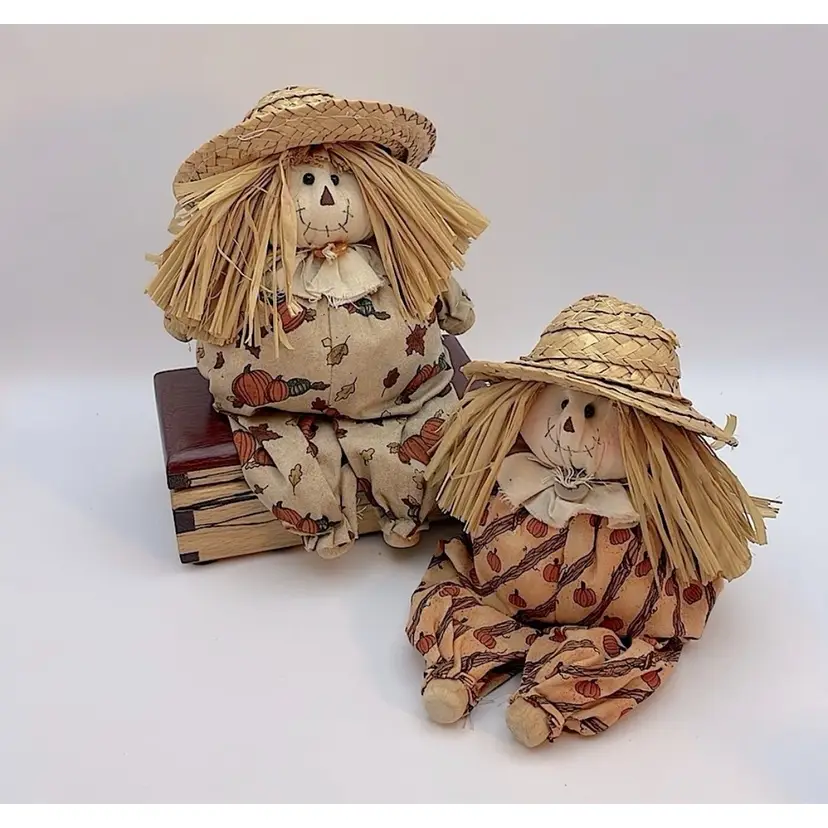 Handmade, Scarecrow Shelf Sitter, Raffia Hair, Straw Hat, Sand-filled. Cute! (Second scarecrow sold separately. Box not included) Please see pictures for measurements.