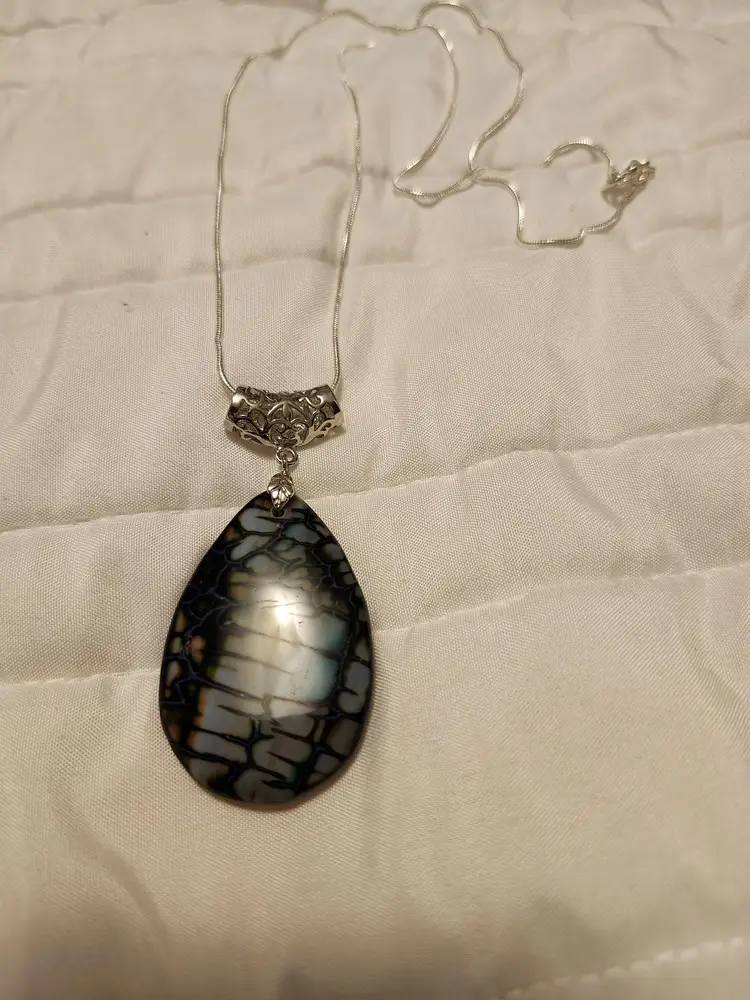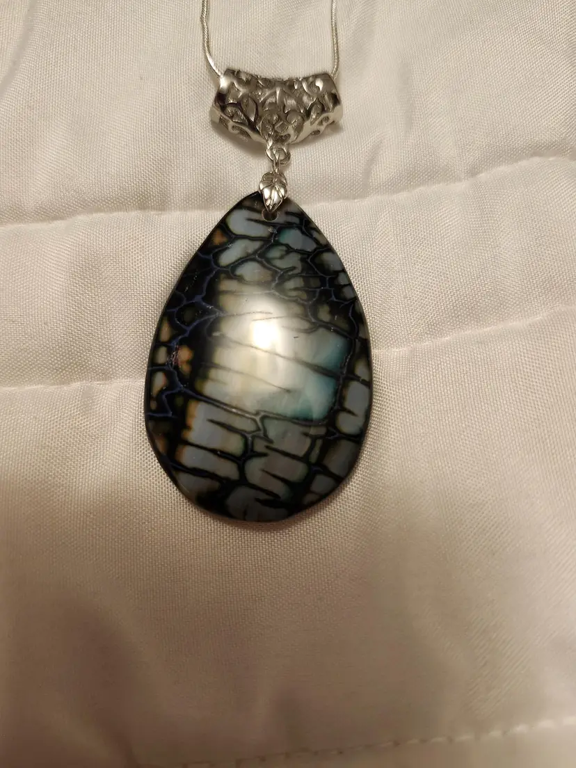 This is a pretty Green and white Dragon veins Agate teardrop pendant with a 24 inch silver chain included.