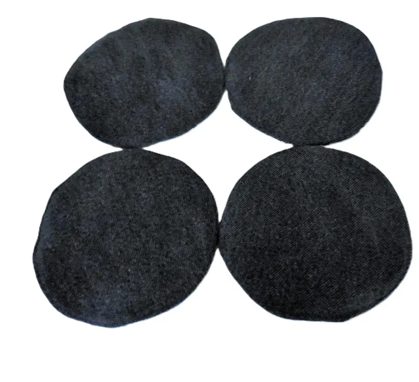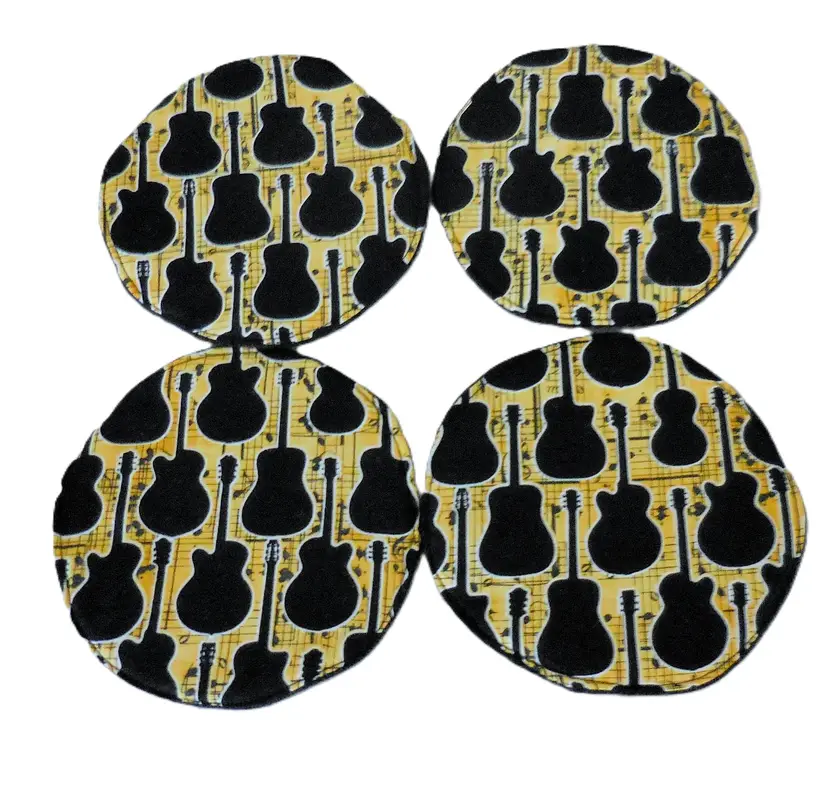 Set of 4 round coasters. There are black guitars on a tan background. The back of the coasters are repurposed black denim. There is a layer of cotton batting added for extra absorption. They are approximately 5 inches across. Machine washable and dry.
