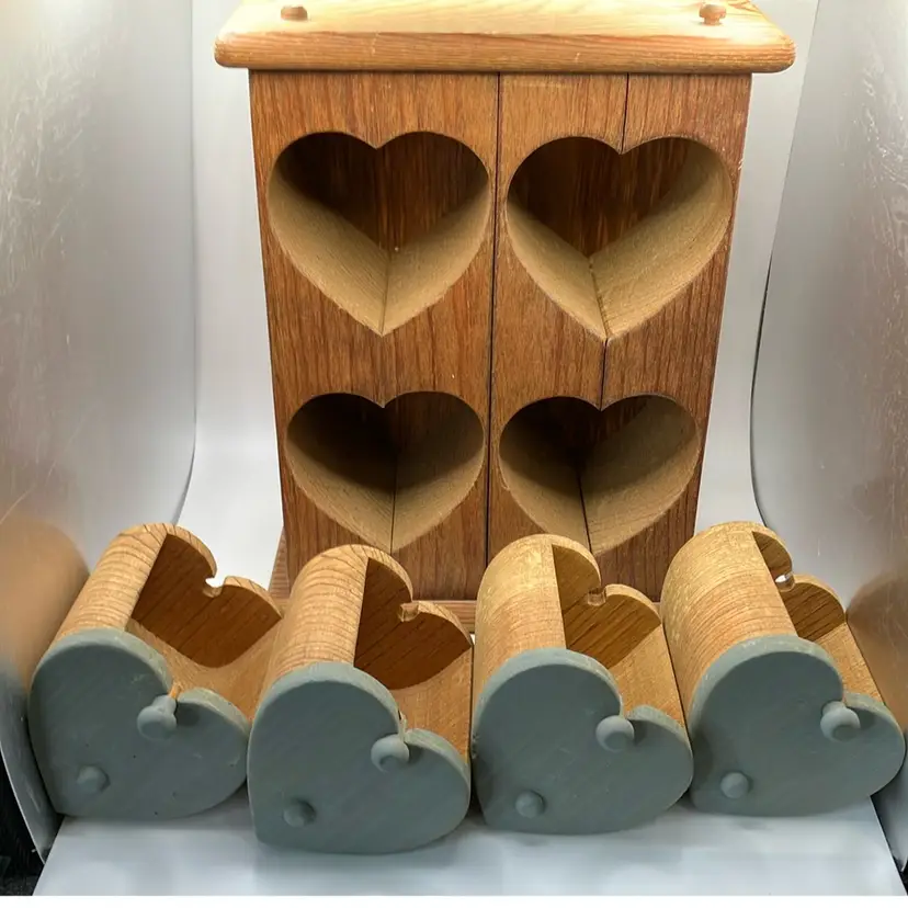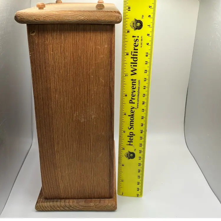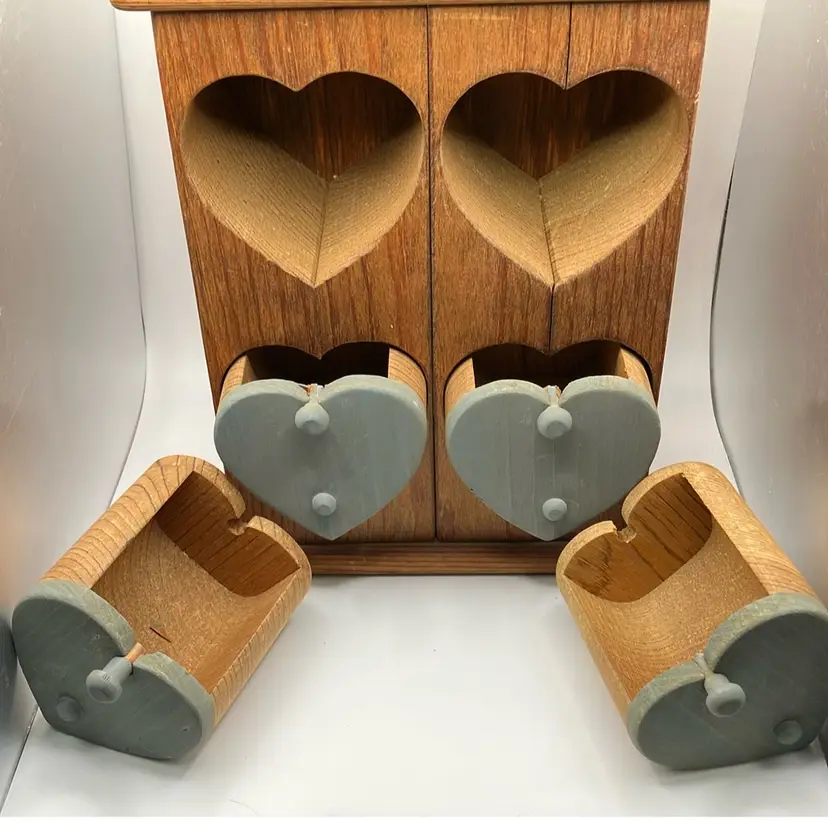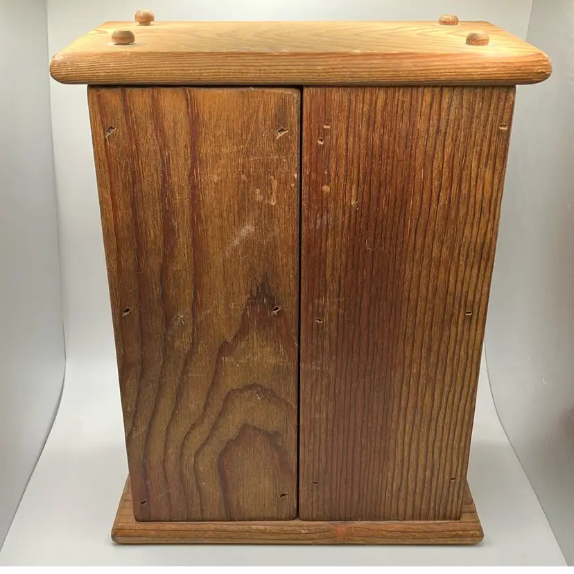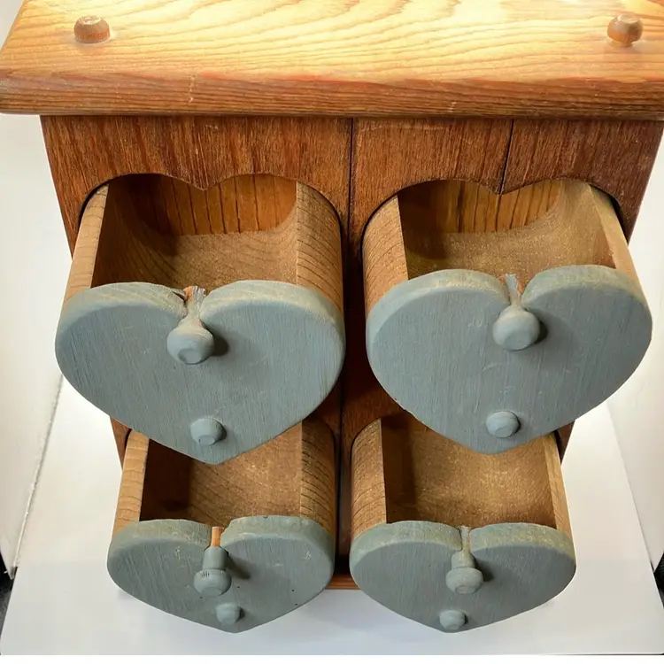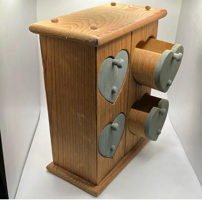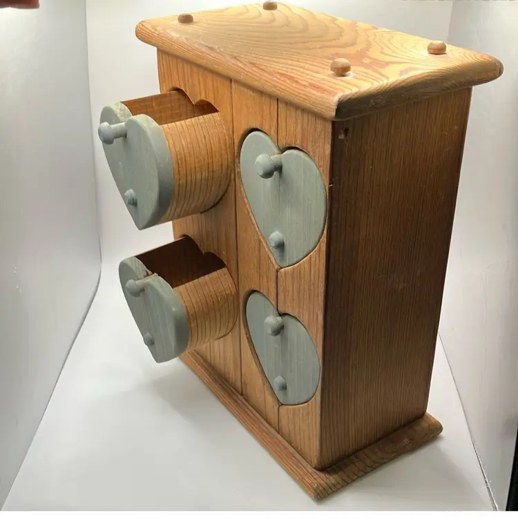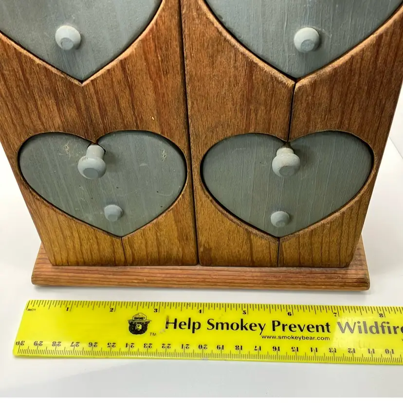 Stamped on bottom with “Beaver Creek Beaman, Iowa”. Solid wood construction with 4 small drawers that could hold jewelry, sewing needles/supplies, crafts etc. Weighs 51 oz on its own w/o packaging so it is a very solid piece. 10” tall and 8” wide and approx 4” deep. Open to offers!