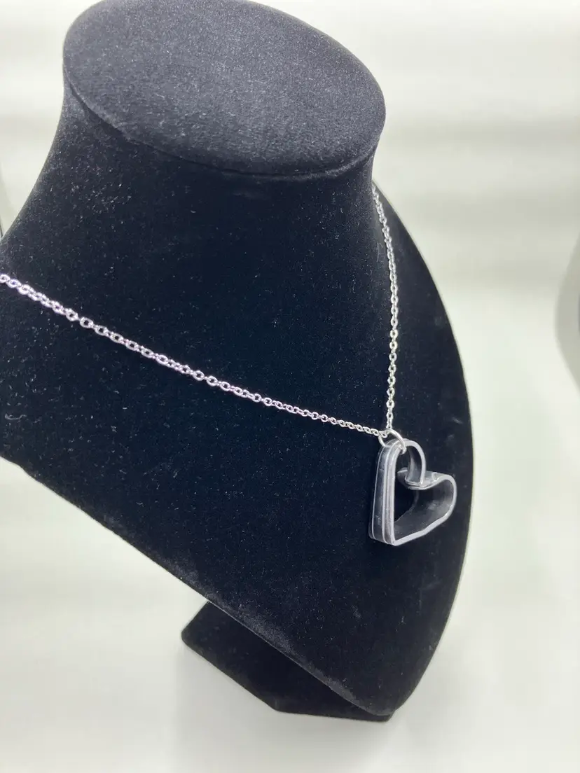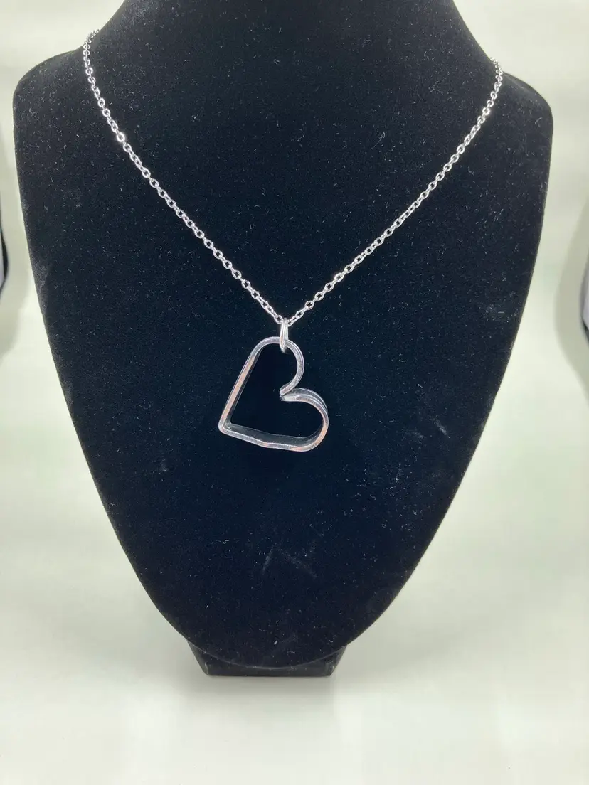 A heart pendant made from a vintage stainless steel spoon. It comes on a 20 inch stainless steel chain. The heart measures 1 1/4 inches tall by 1 1/4 inches wide. The cutting and shaping of the spoon into the heart was done by hand by me. May include wear/marks due to being made of vintage materials.