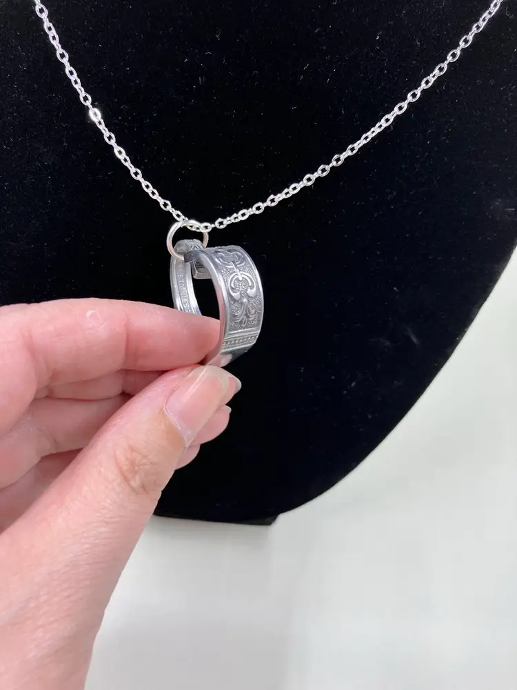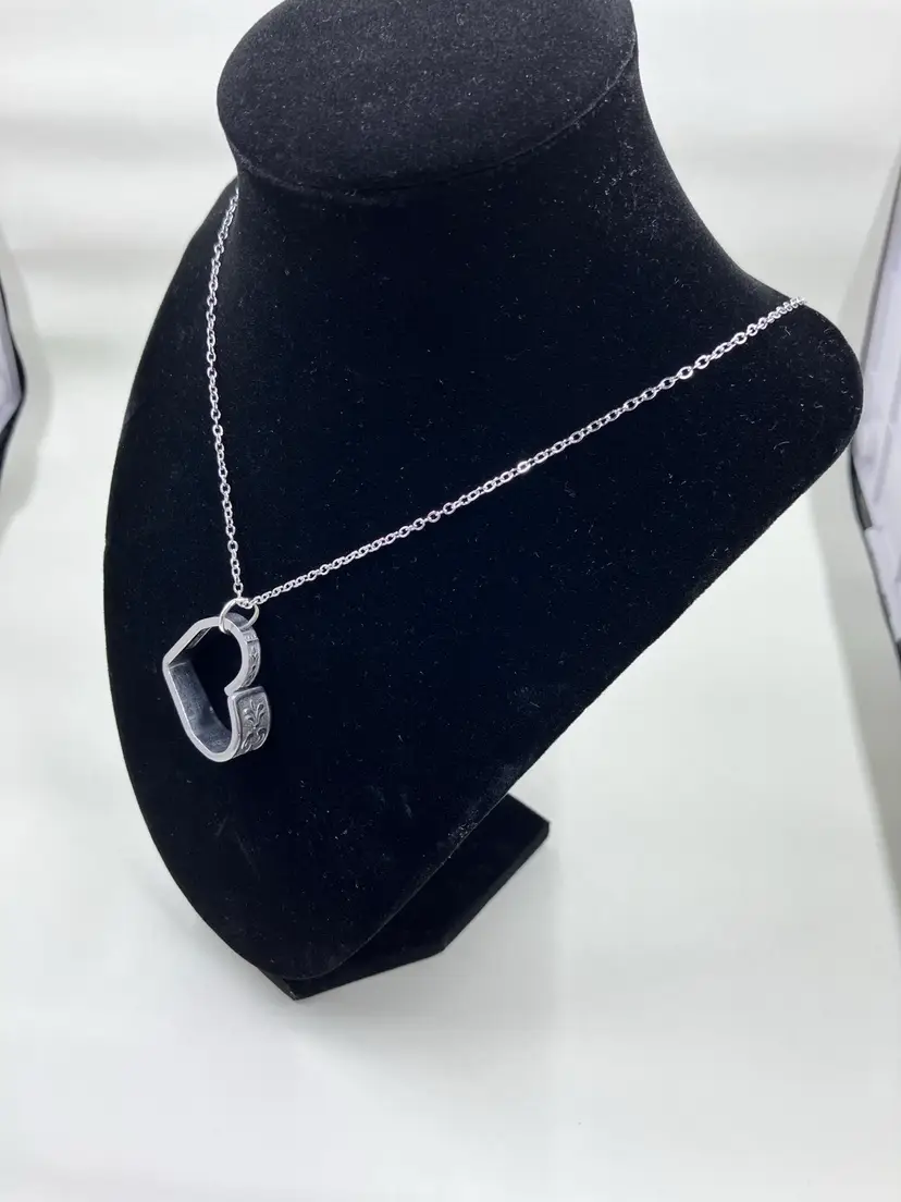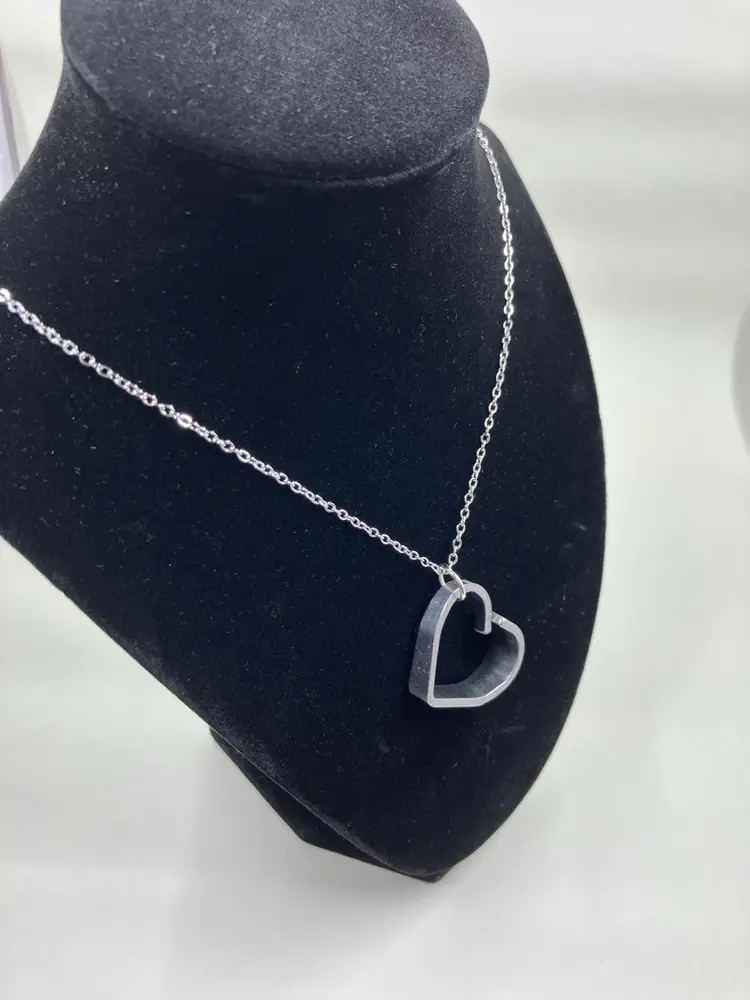 A heart pendant made from a vintage stainless steel spoon. It comes on a 20 inch stainless steel chain. The heart measures 1 3/8 inches tall by 1 3/16 inches wide. The cutting and shaping of the spoon into the heart was done by hand by me. May include wear/marks due to being made of vintage materials.