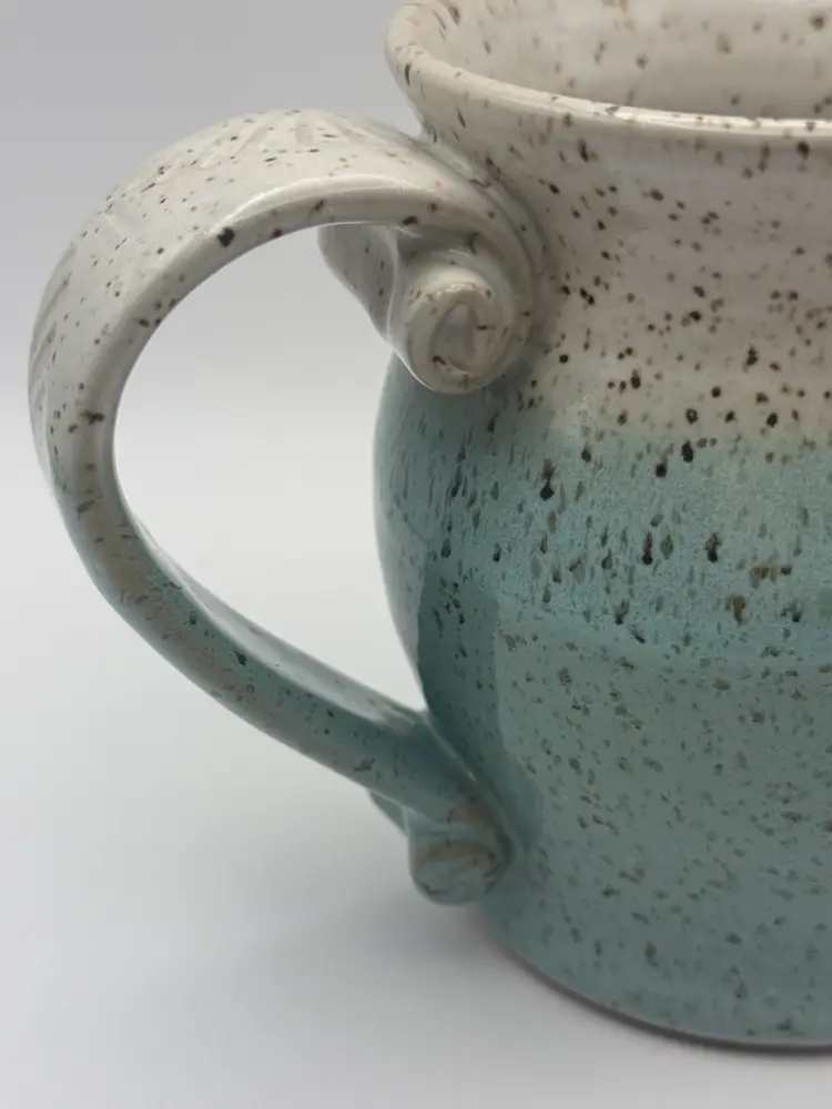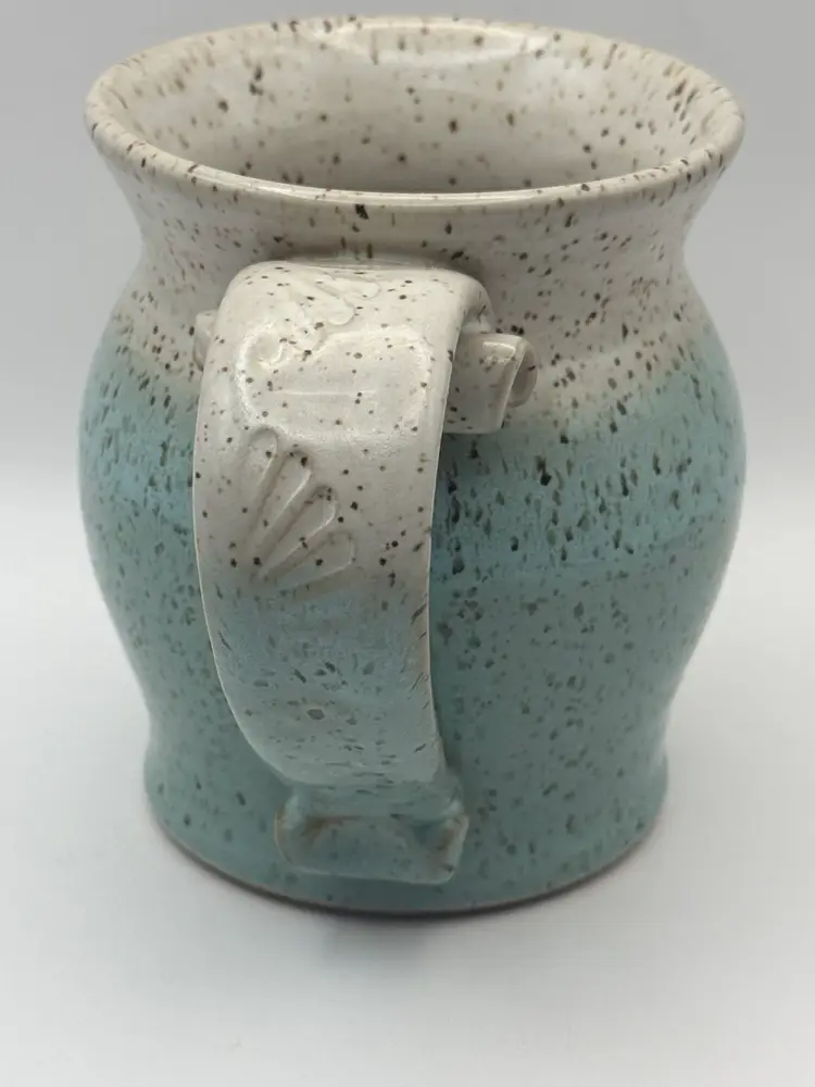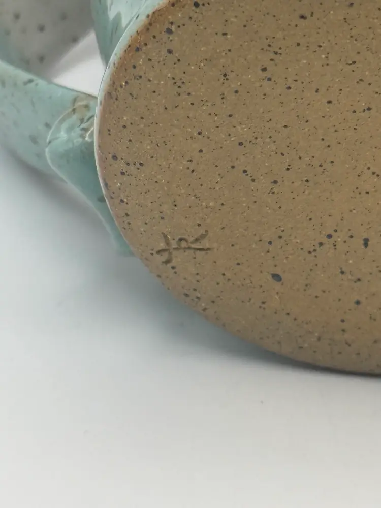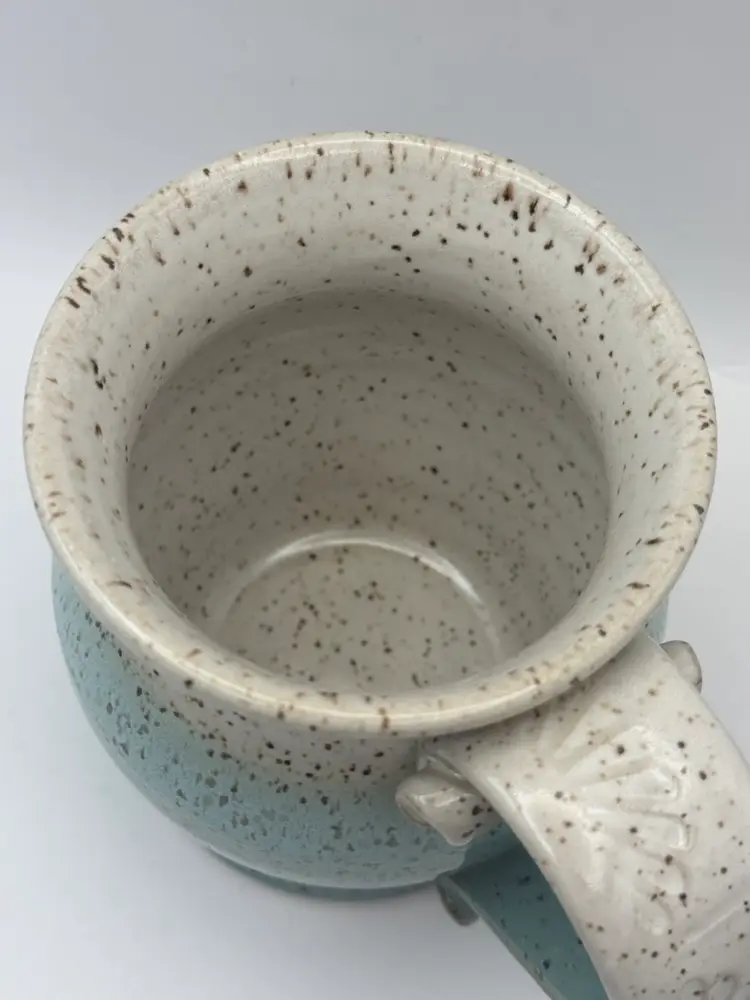 Nice size pottery coffee cup in shades of green/blue . Substantial decorative handle artist stamped No chips or cracks Holds about 14oz. 4-1/2” tall