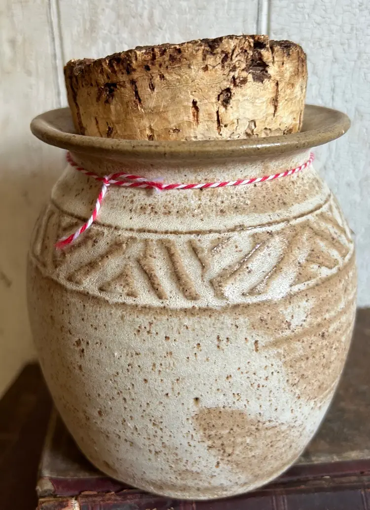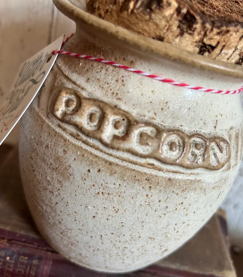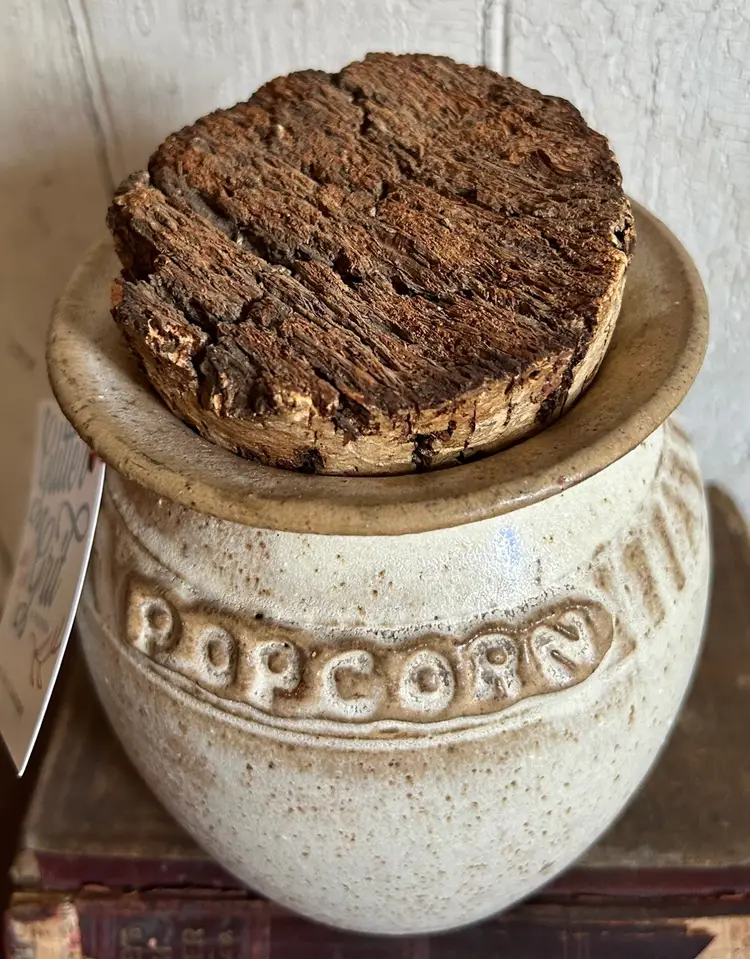Large handmade studio pottery “popcorn” jar with big cork lid. Glazed in speckled gray/brown colors. Signed Greer on the bottom. No flaws I can find. 6” tall including the cork, 4 1/2” diameter. Made in Ohio. Free shipping