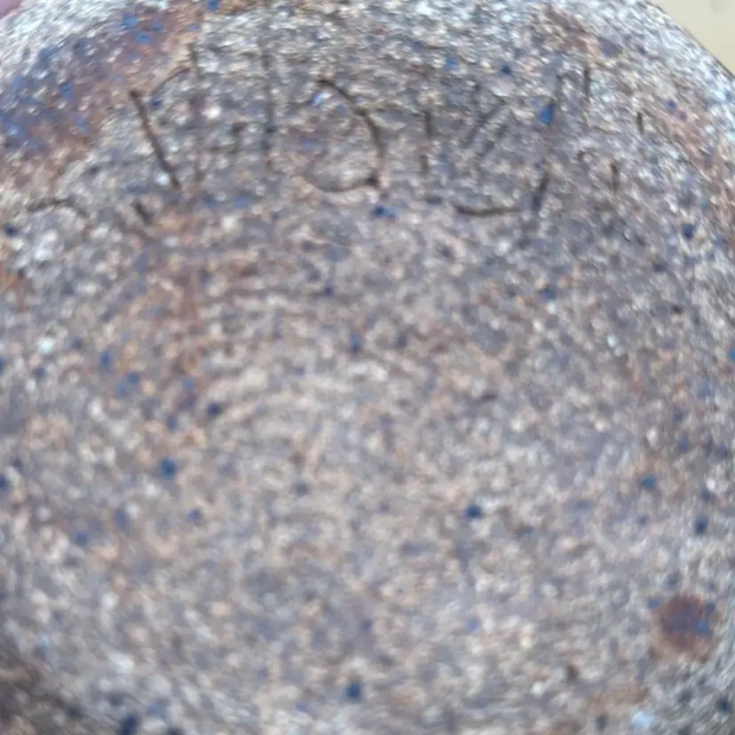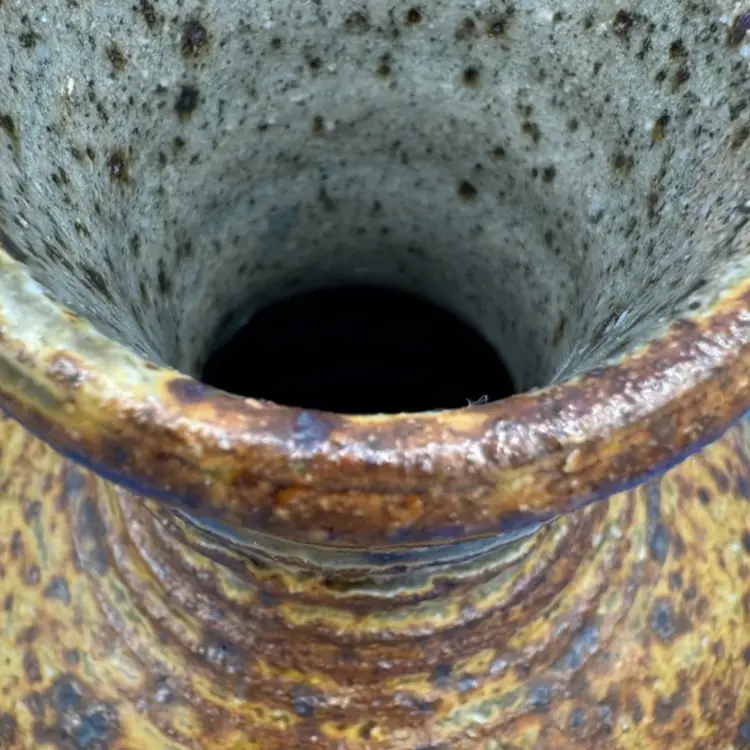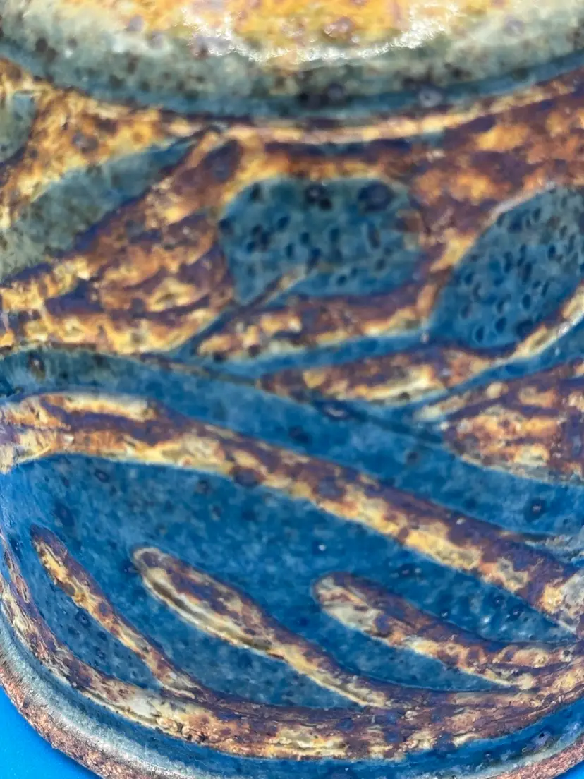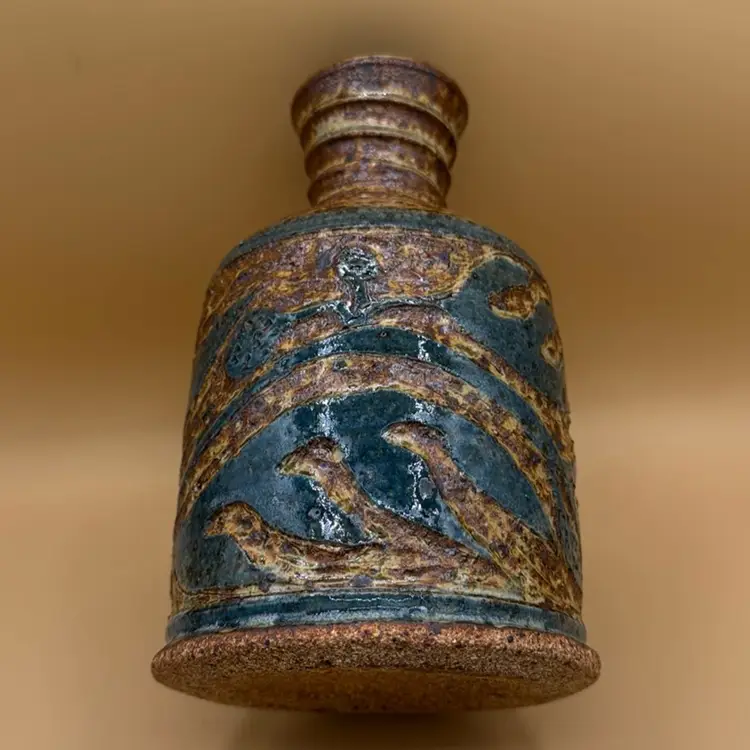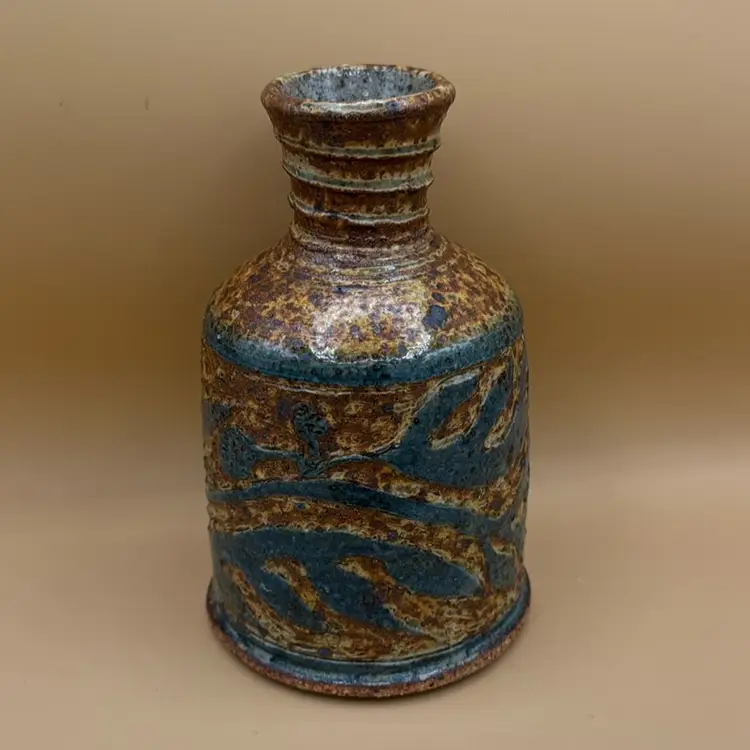 This handmade studio pottery textured vase features a raised pattern and a multicolor earth tone & blue finish.it measures 6 1/2”.
