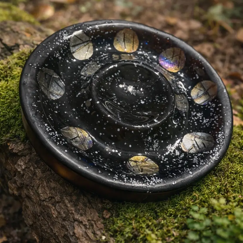 Legend tells of a potter who sought to hold sunlight even after dusk. She shaped midnight clay into a wide gathering circle and placed it into the ancient Raku fire. When it emerged, the surface held scattered stars, glowing embers, and rings of golden light like small suns in orbit.