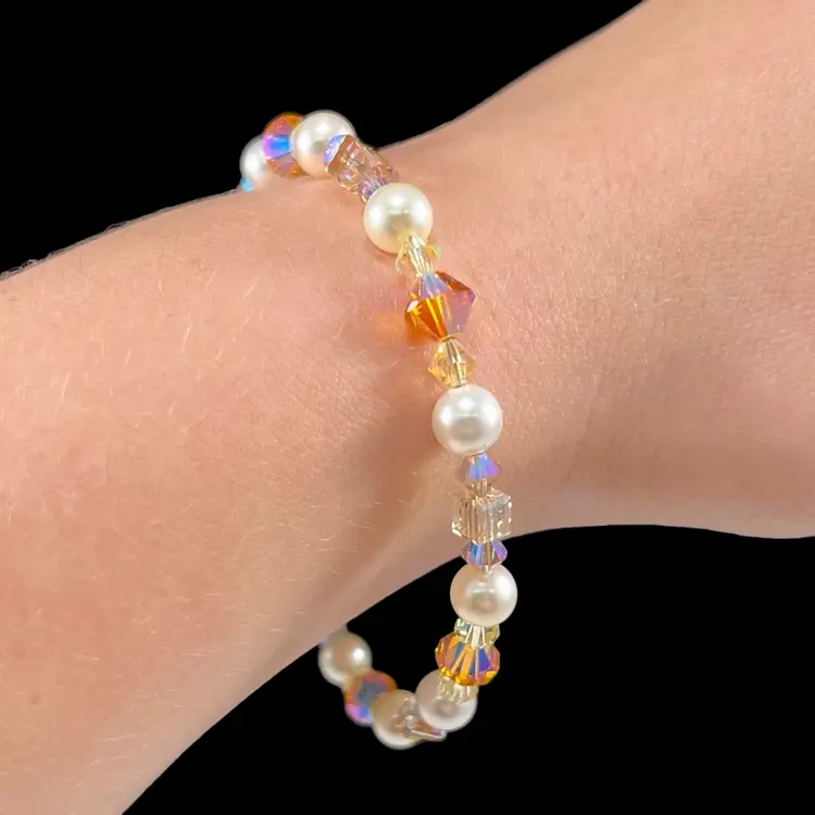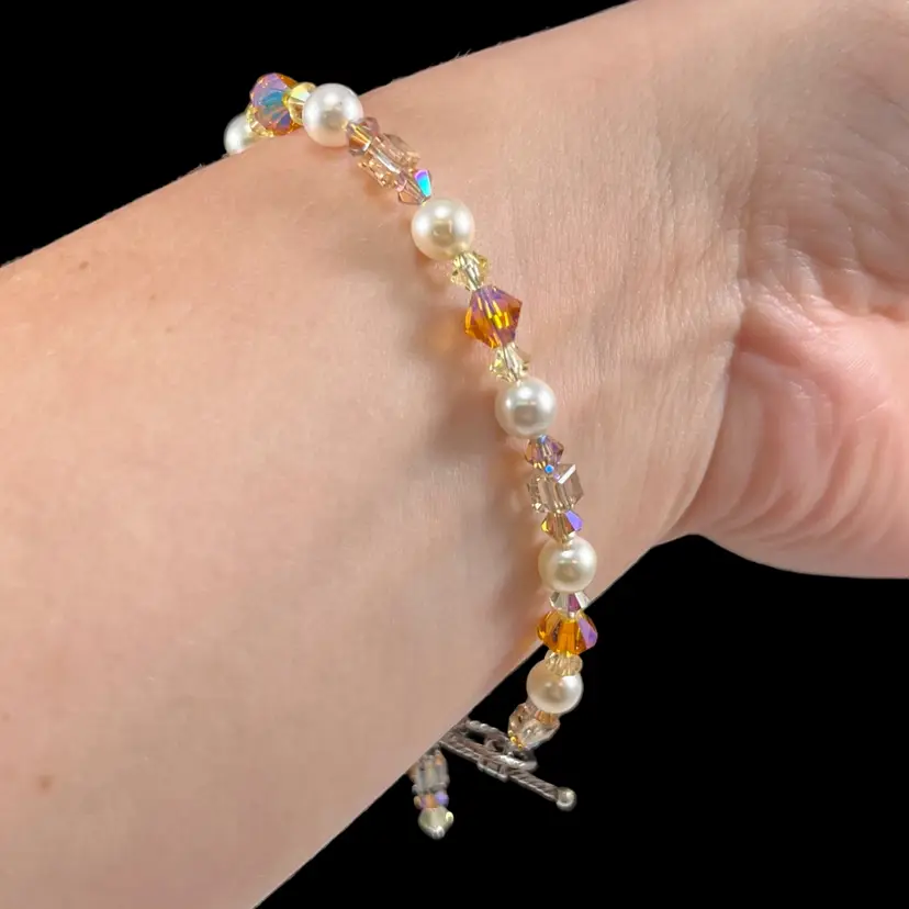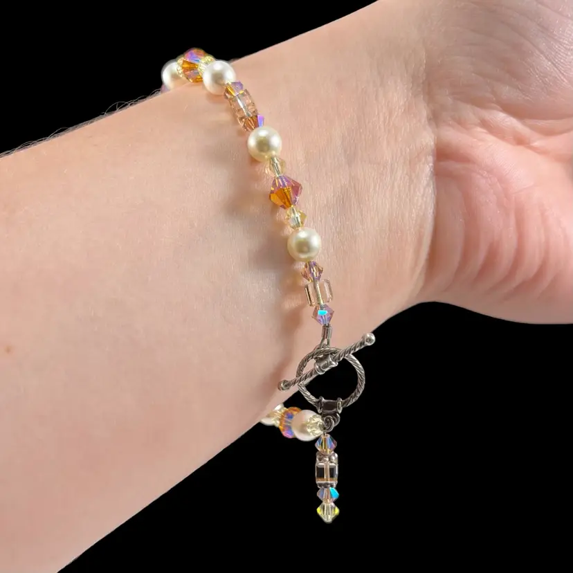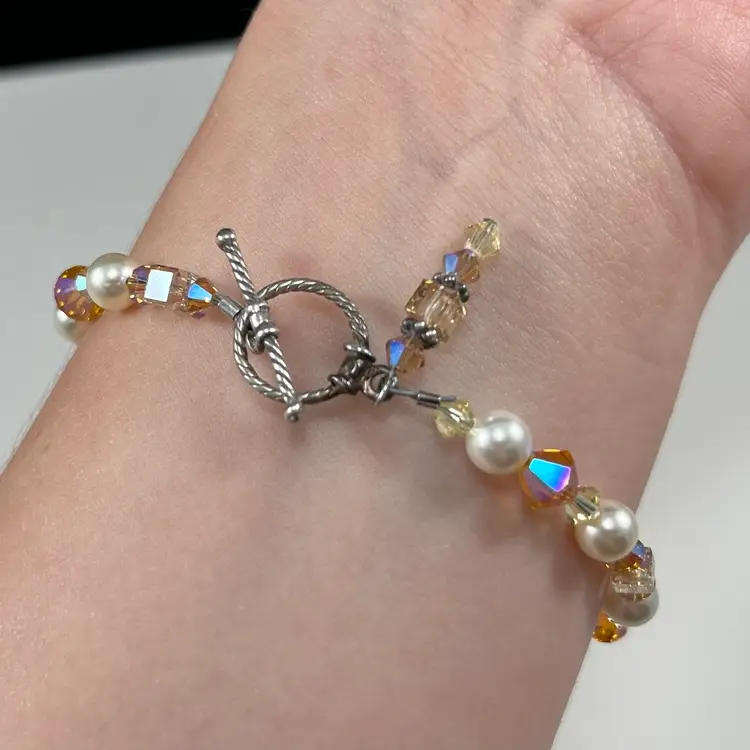 Approximately 8.25”. Handmade by a Michigan artist. Artist stated that toggle clasp is sterling, but it’s not marked. It’s untested, but we did polish it. The base of the loop remains tarnished. Good condition.