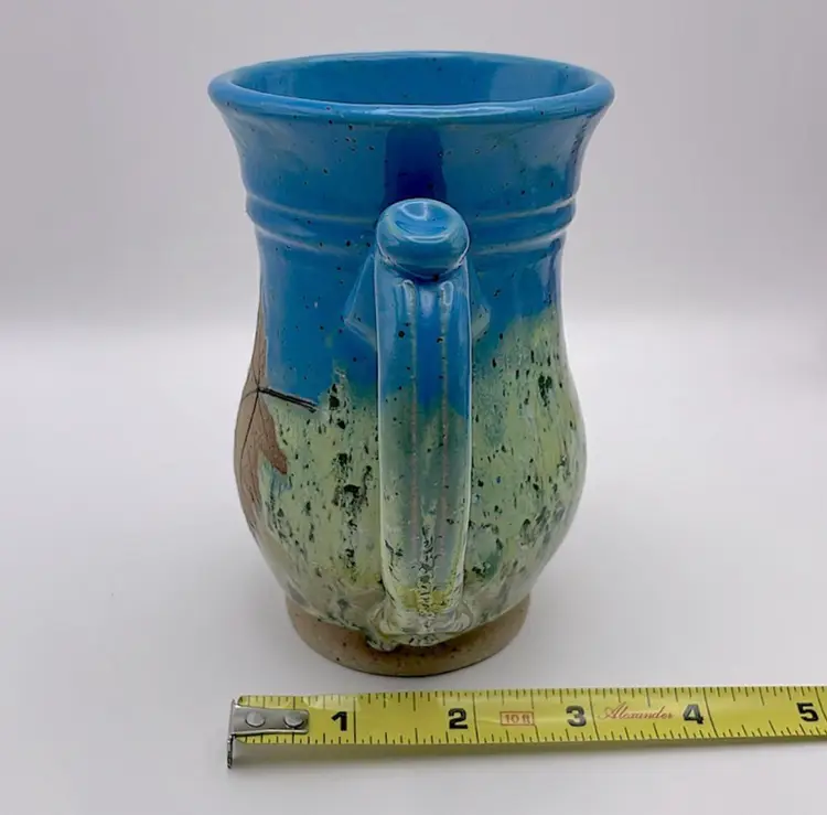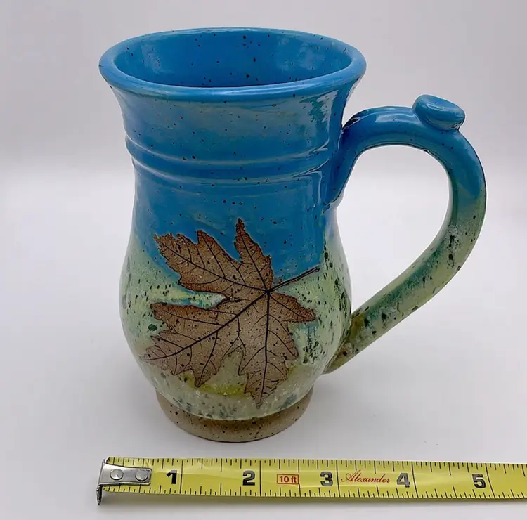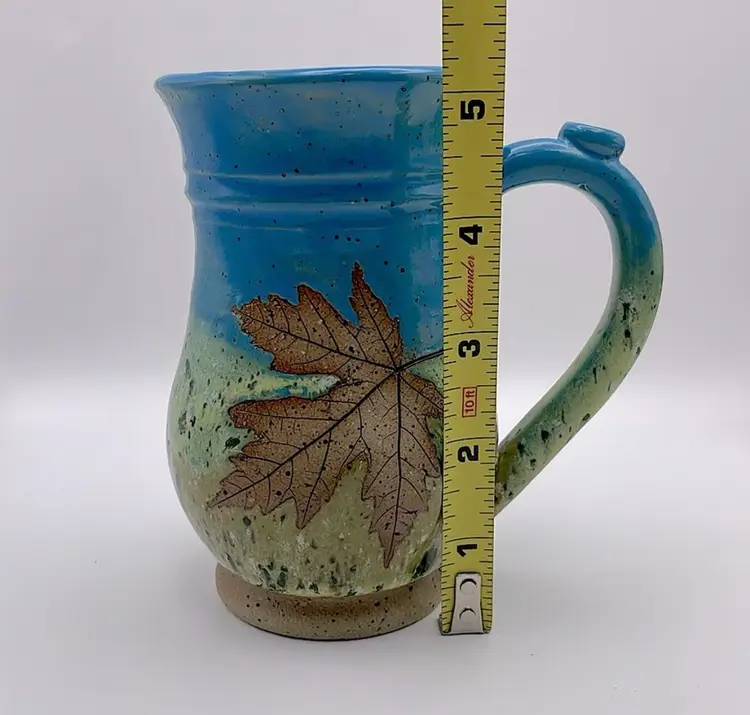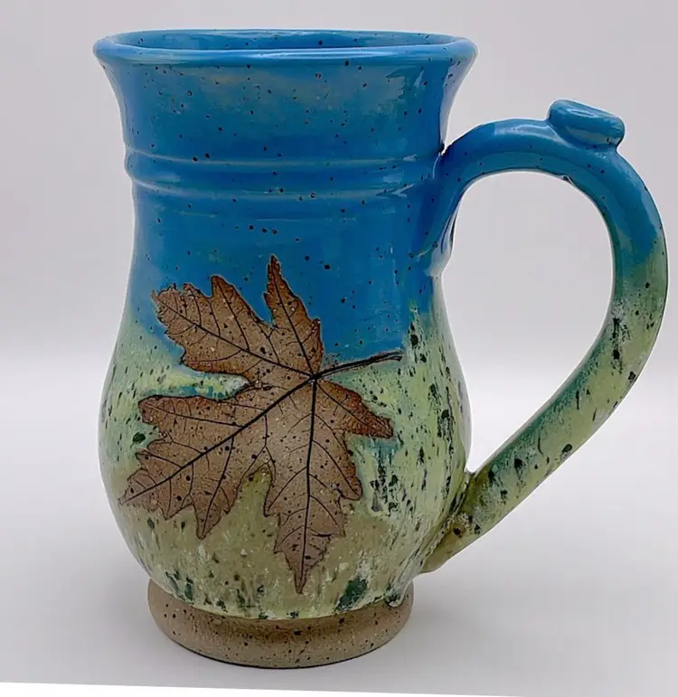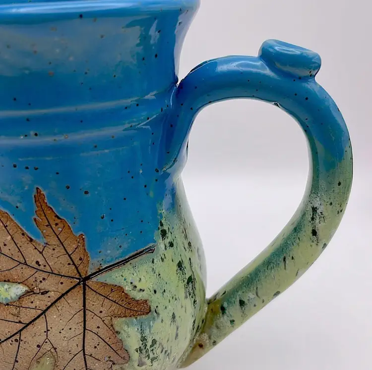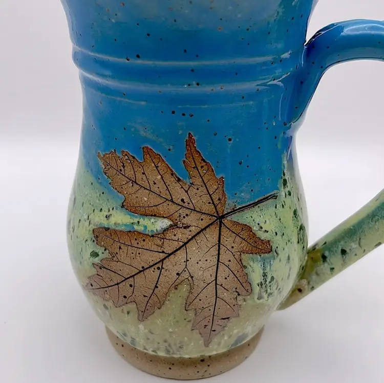 Handmade, Sweet Tea Pottery, Studio Art, Handle Mug, Maple Leaf, Turquoise/Green. Beautiful for Fall!