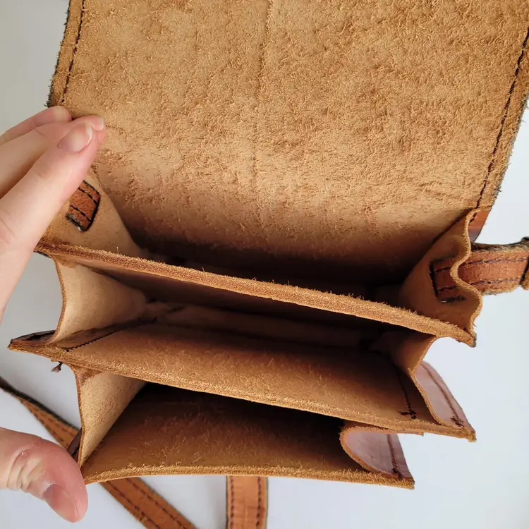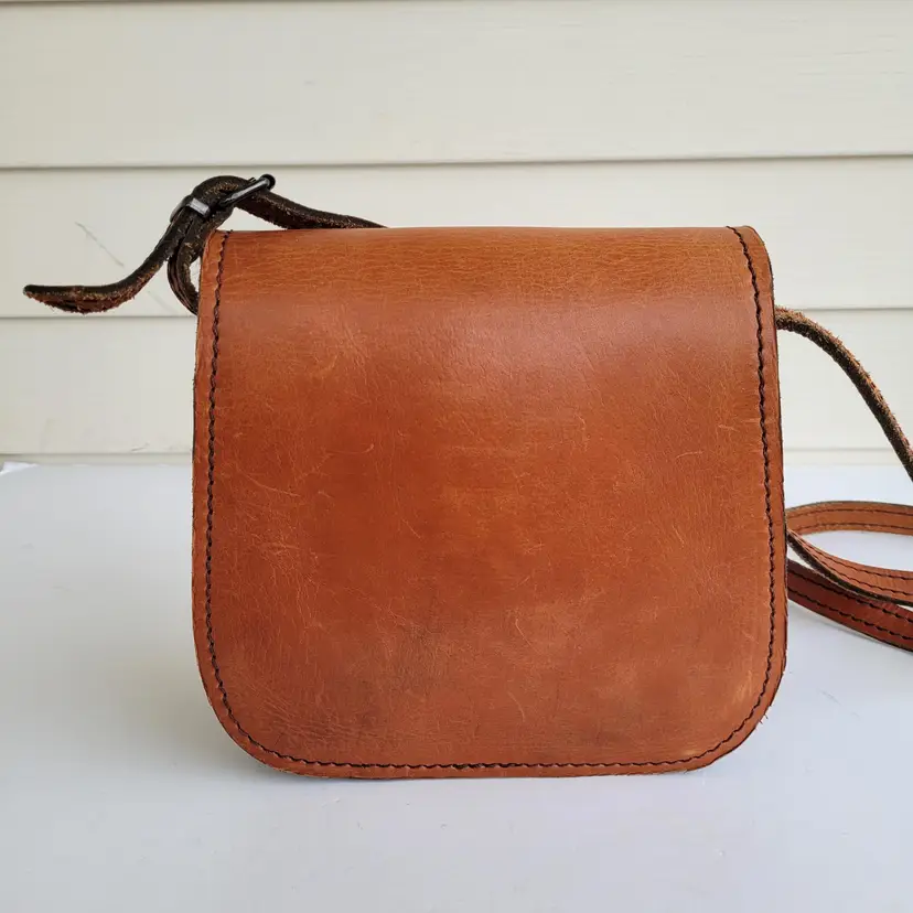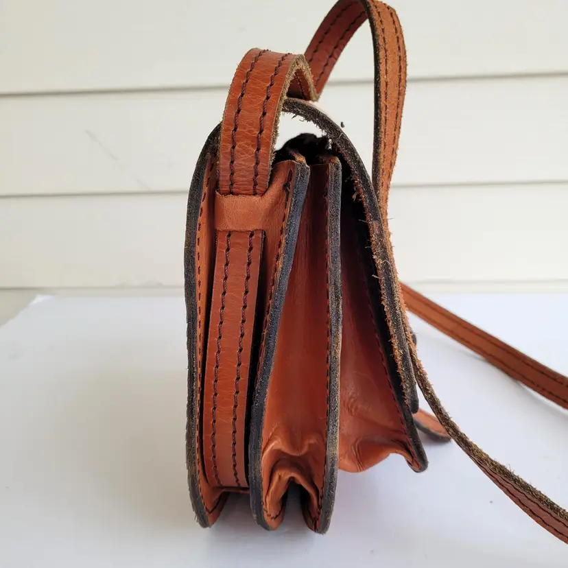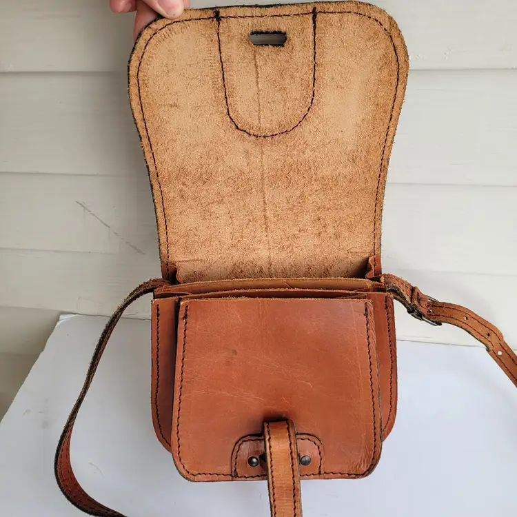 This is a beautiful handmade thick leather bag. I am not sure when it was made but it is a little older. I do not see any brand names unless it is hidden. There is an embossed image of a horse on the front flap. The inside is unlined and has 3 different large sections. The long crossbody strap is adjustable. Bag is in nice used condition. It does have some scuff marks here and there in the leather. There isn't anything major and it would clean up lovely. Completely usable as is.