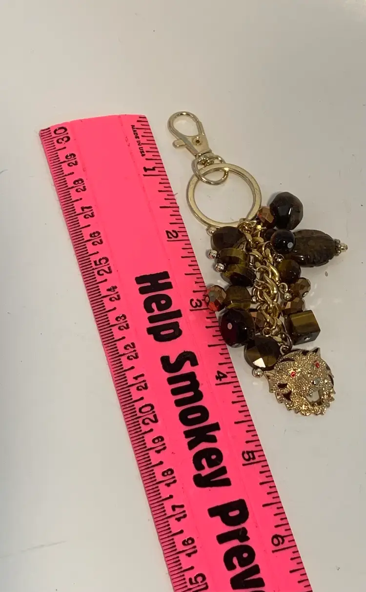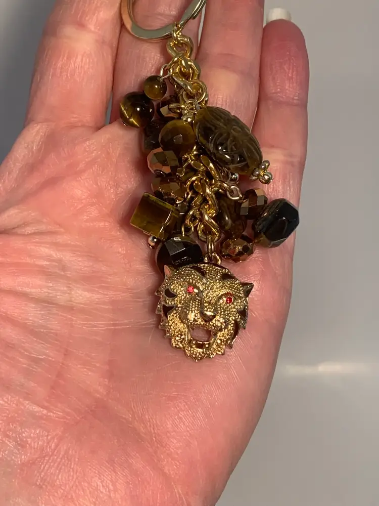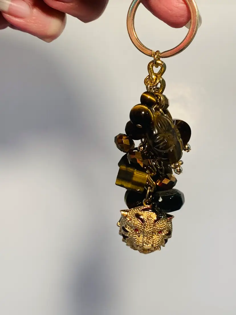 Handmade by me tiger’s eye key chain/ bag charm with genuine tiger’s eye dangles and an awesome tiger face gold toned charm. On a gold toned chain with a gold toned clasp. Tiger charm has brown enamel stripes and red rhinestone eyes.