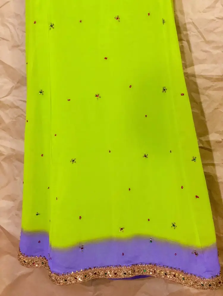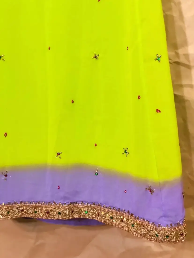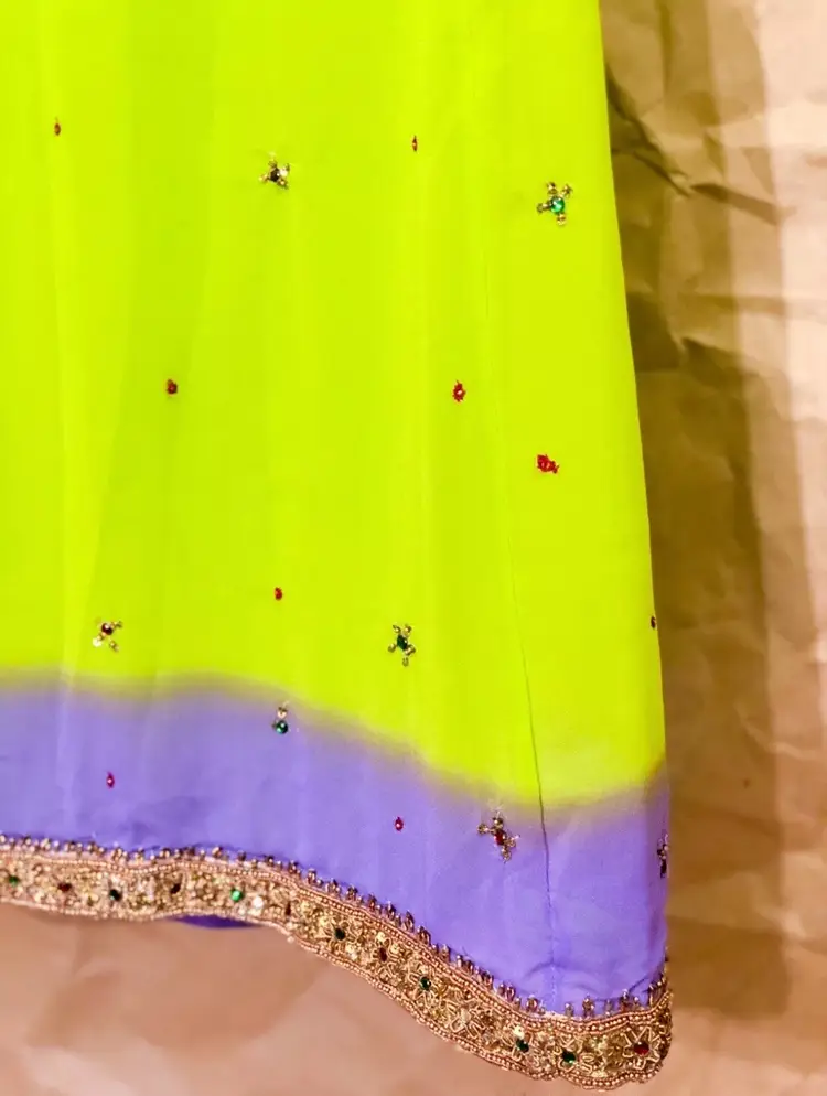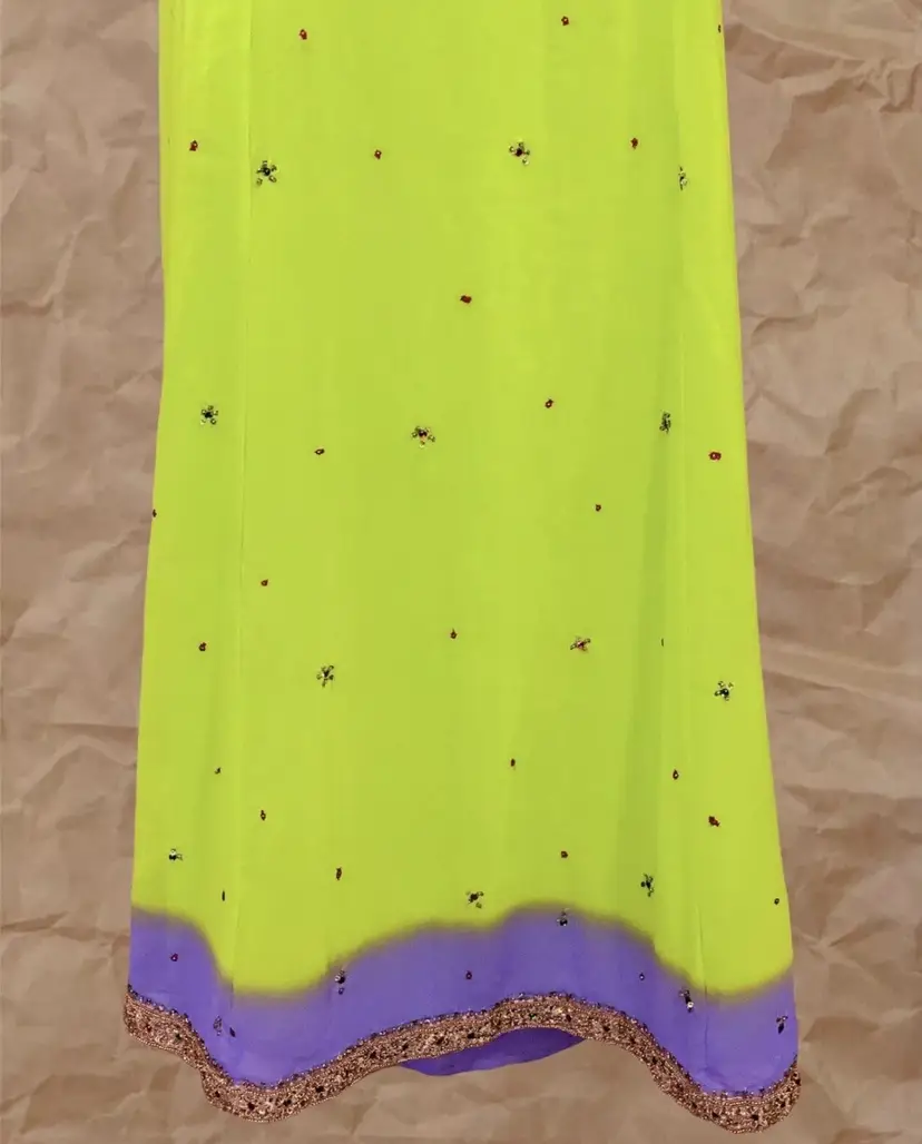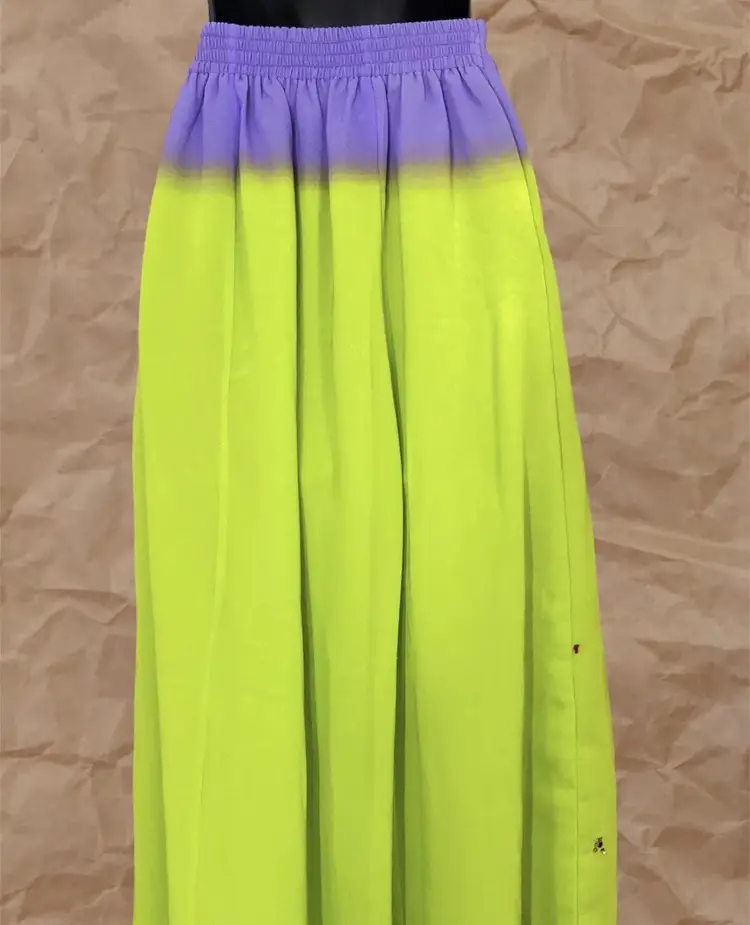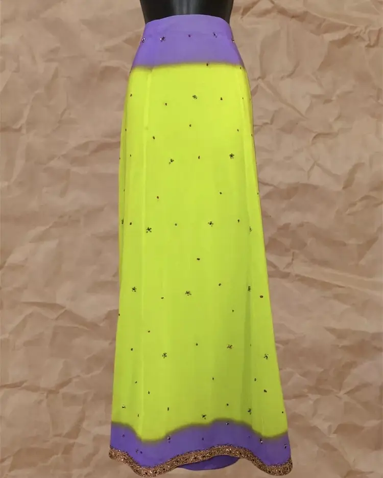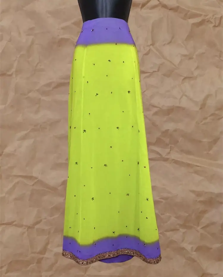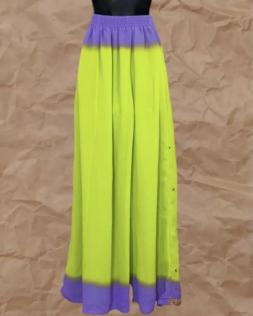 Handmade Vintage Neon Lime Green Purple Ombre Gold Multicolor Beaded Embroidered Front Trim Long High Waisted Elastic Waistband Maxi Skirt