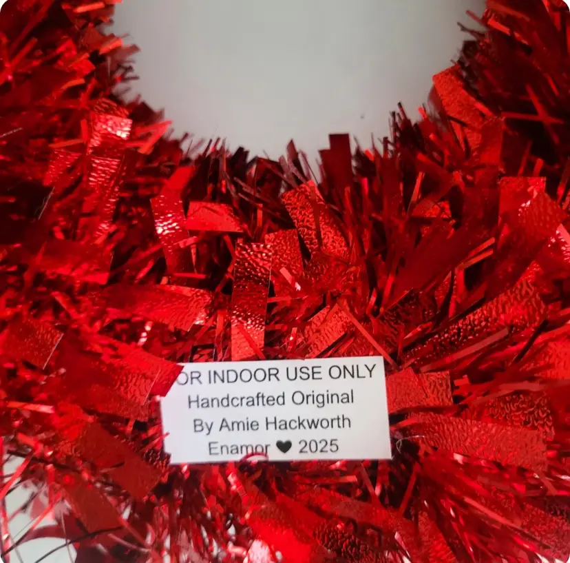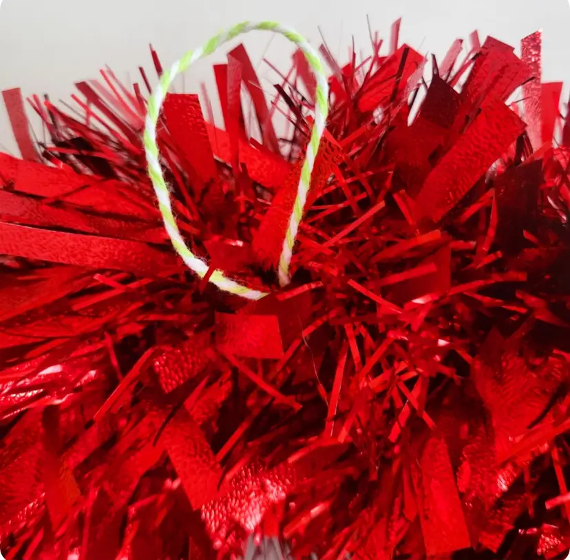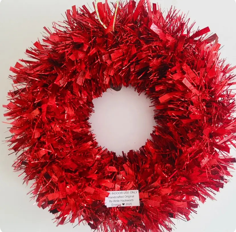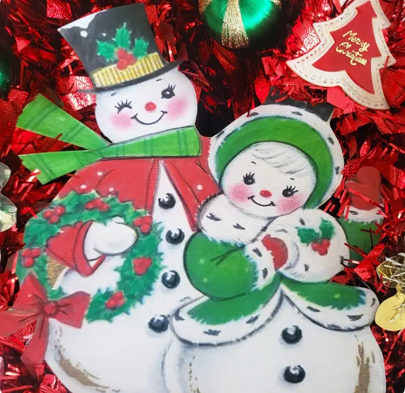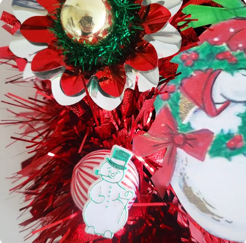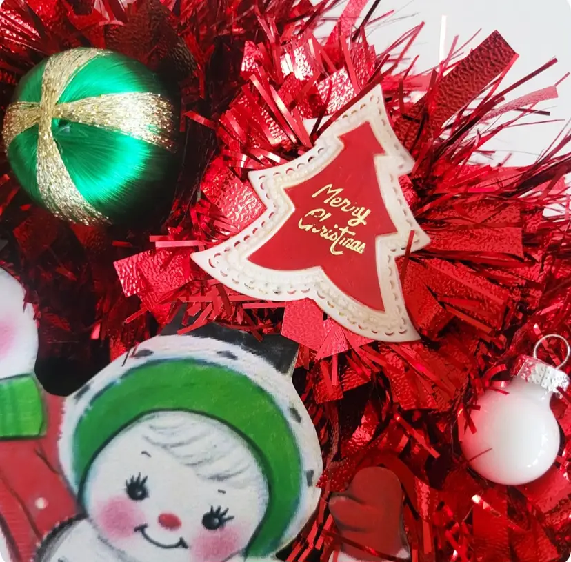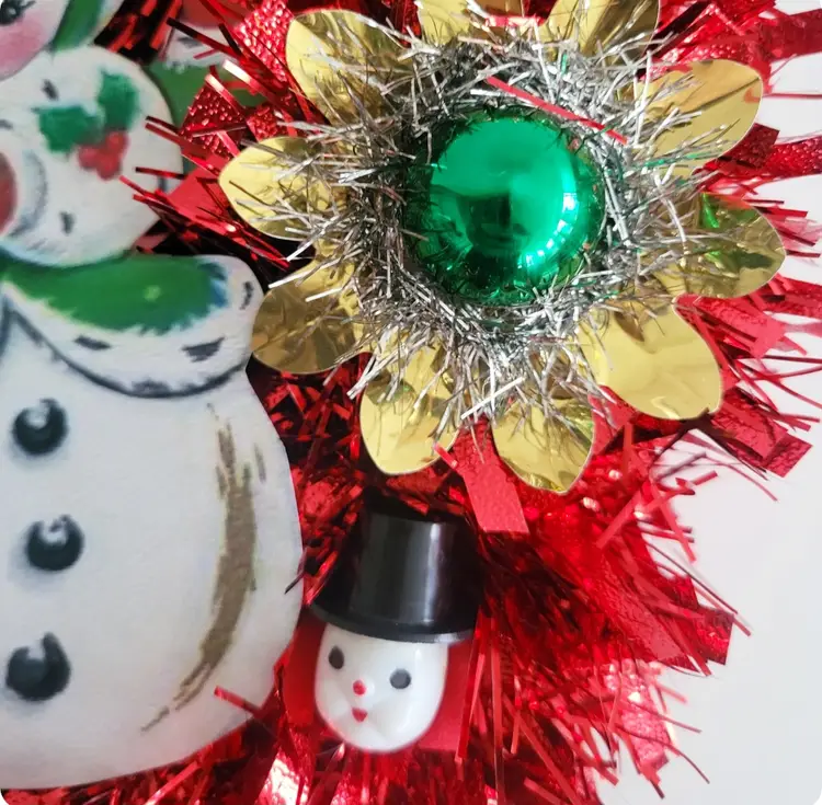 Handmade by me! Red tinsel wreath featuring a scan of a vintage snowman greeting card in my personal collection. Vintage cake toppers, vintage reflecors, vintage glass bulbs, vintage spun satin balls, vintage mini tinsel. Bakers twine hanger and signed by me on back. Measure 11 inches round. INDOOR USE ONLY.